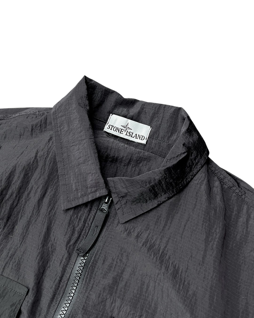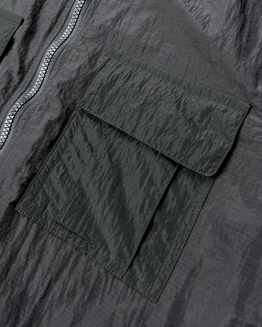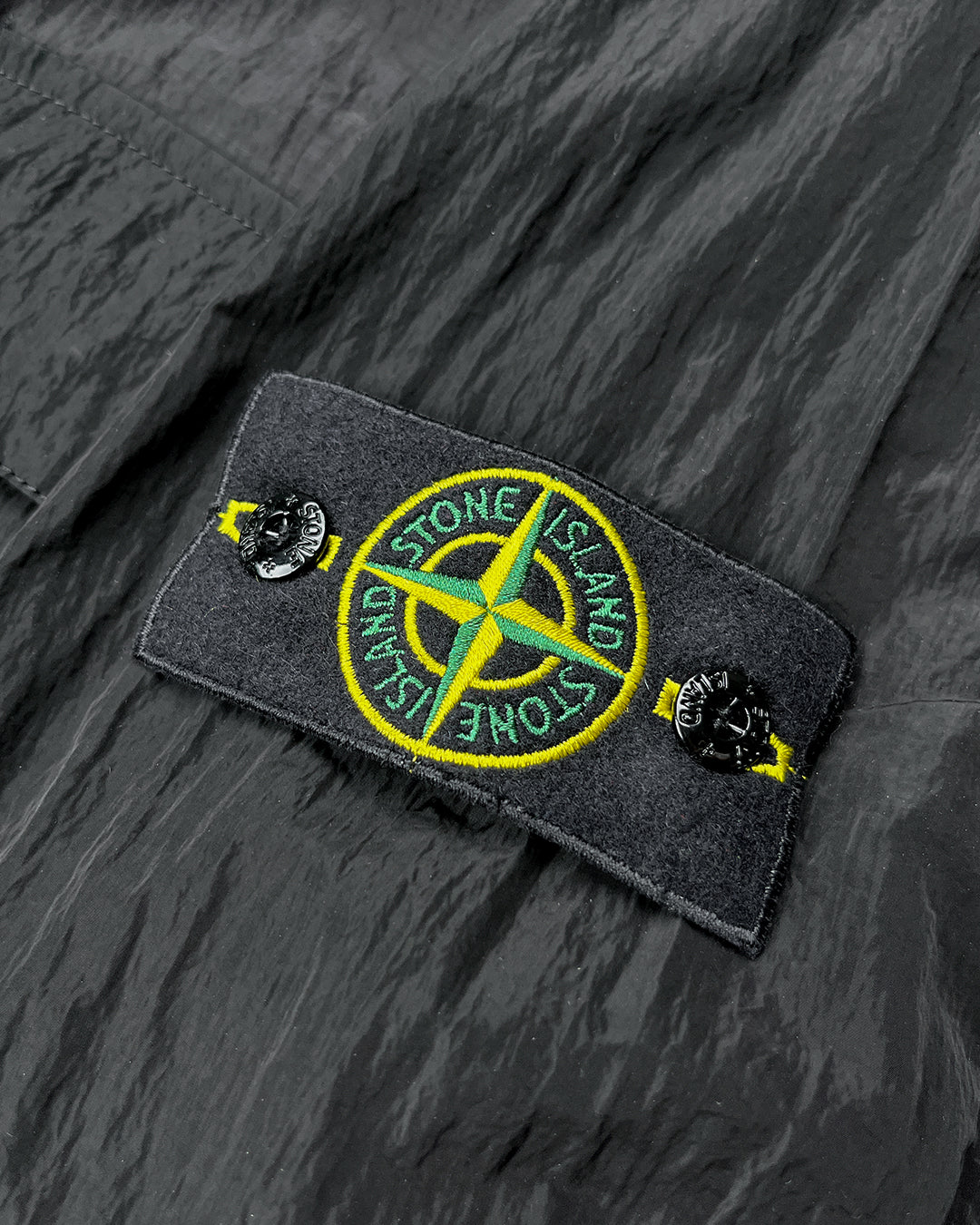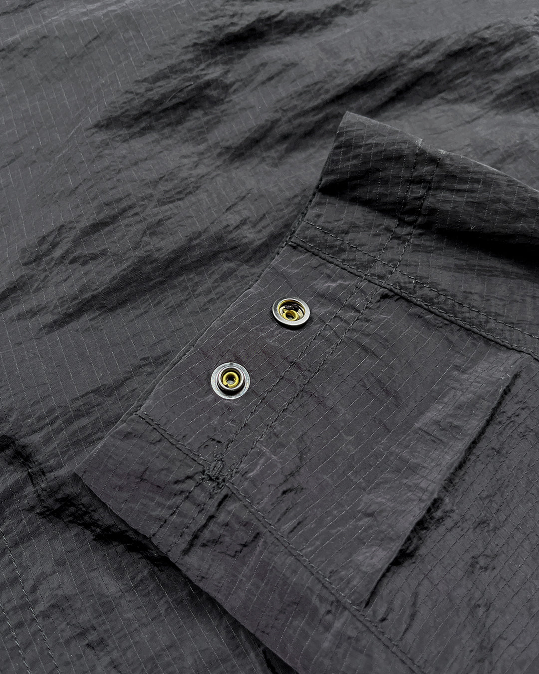 Верхня сорочка з нейлонового мікрорипстопа тридольної структури волокон з металізованим переливчастим ефектом завдяки забарвленню в готовому вигляді. Готовий виріб піддається двоступеневій процедурі фарбування для надання всім деталям контрастного забарвлення різного ступеня інтенсивності.