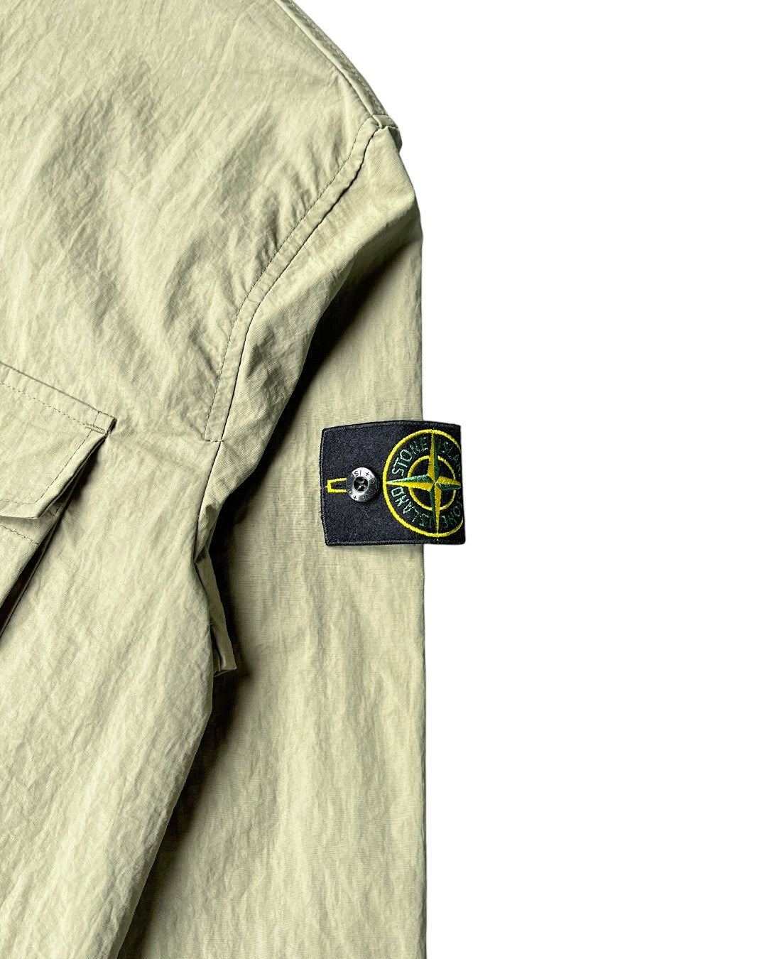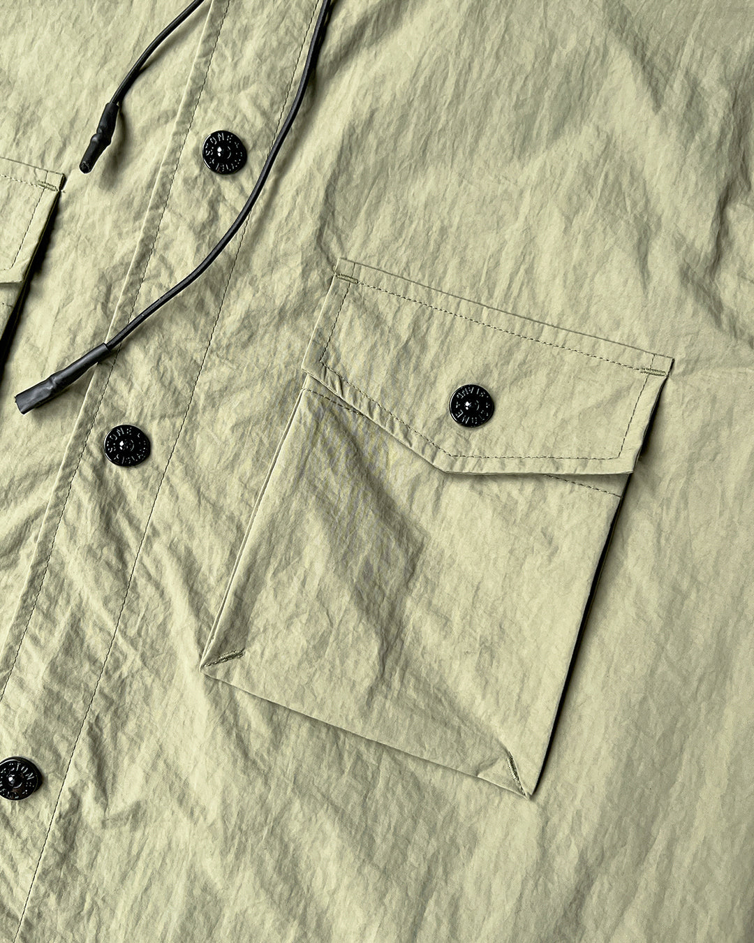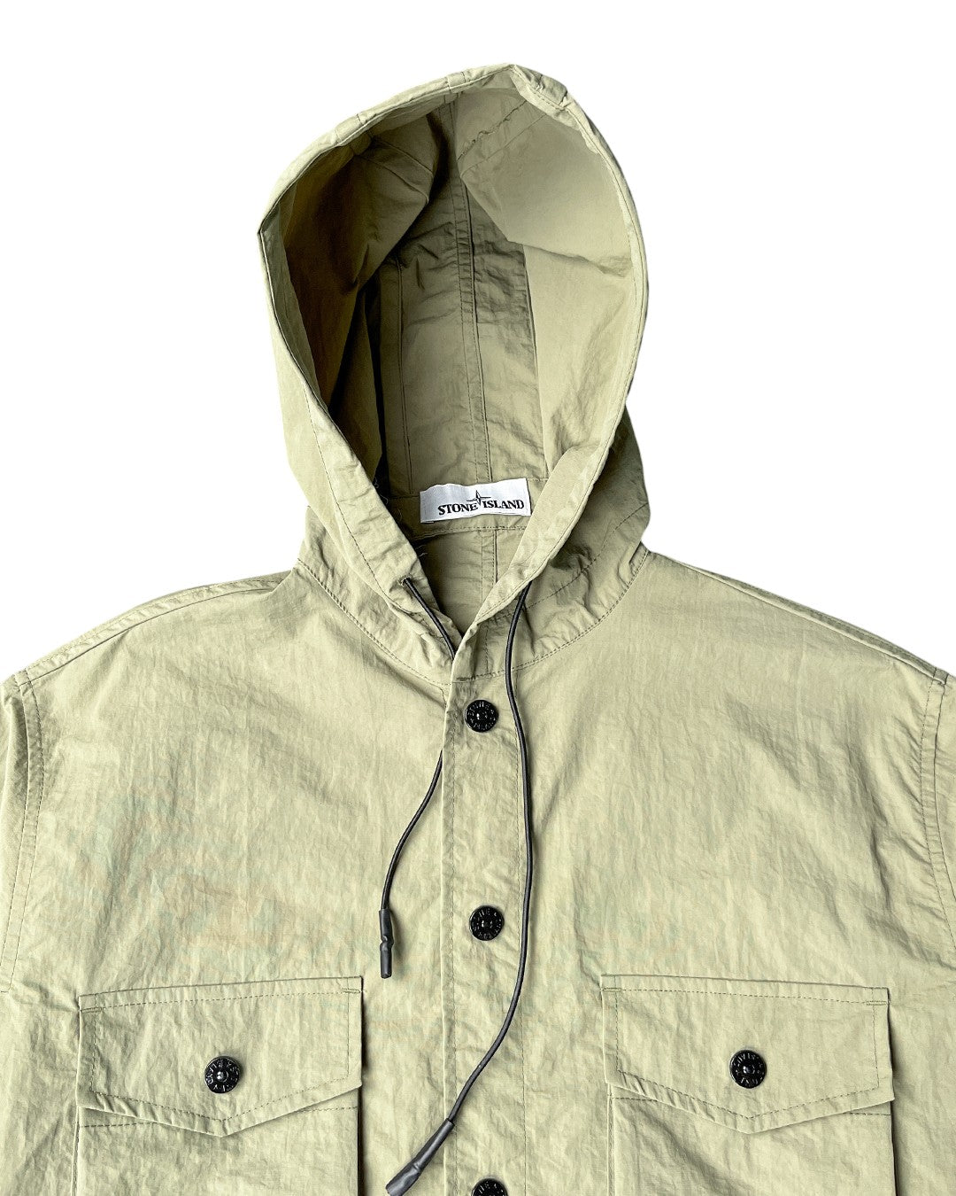 Сорочка оливкового кольору з бавовняно-нейлонового попліну. Виріб пофарбовано в готовому вигляді. Прострочений комір. На грудях накладні кишені-книжки з клапаном на гудзику. Капюшон на шнурку.