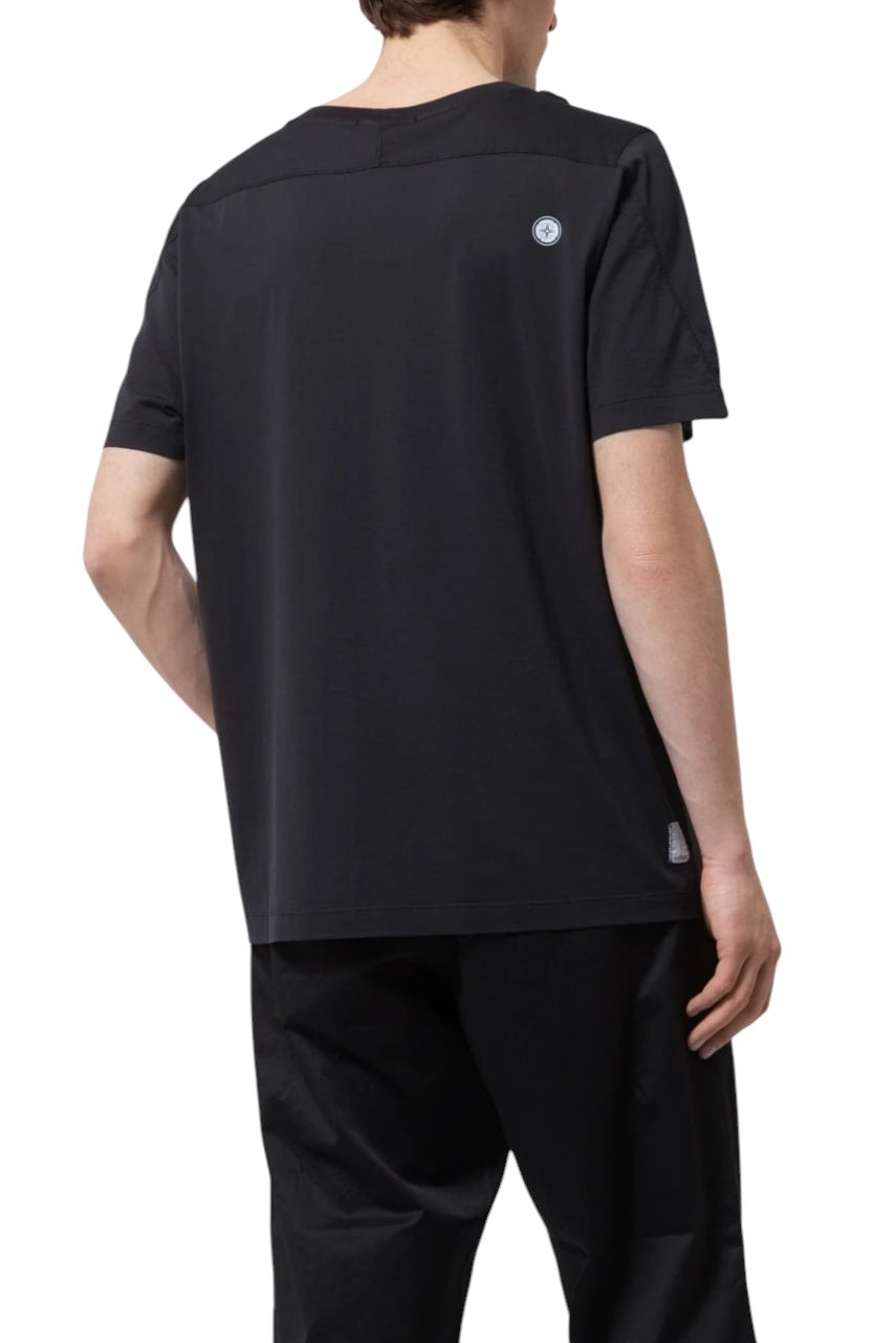 Чорна футболка з короткими рукавами виконана з органічної трикотажної бавовни і пофарбована в готовому вигляді. Пряма модель із круглим коміром прикрашена сезонним принтом Neo-Flora і логотипом Stone Island Shadow Project на грудях. На спині невеликий графічний елемент лінії Shadow, збоку контрастна бирка.