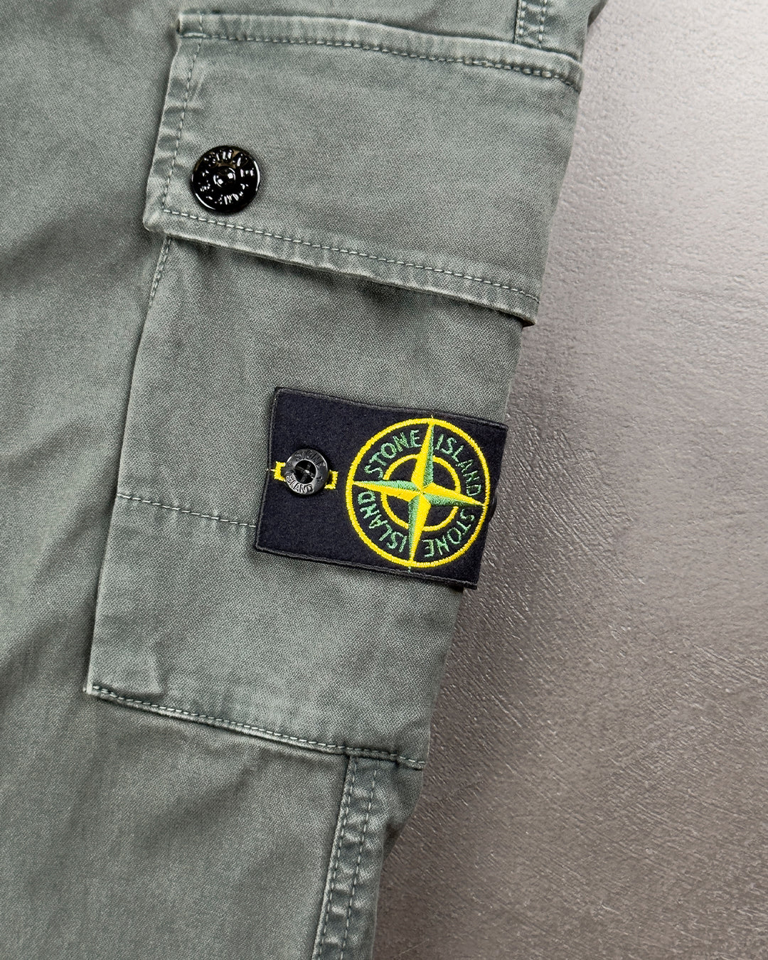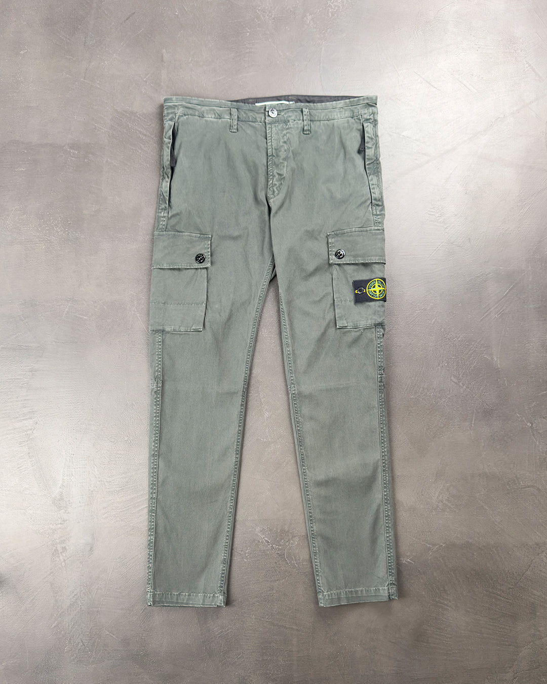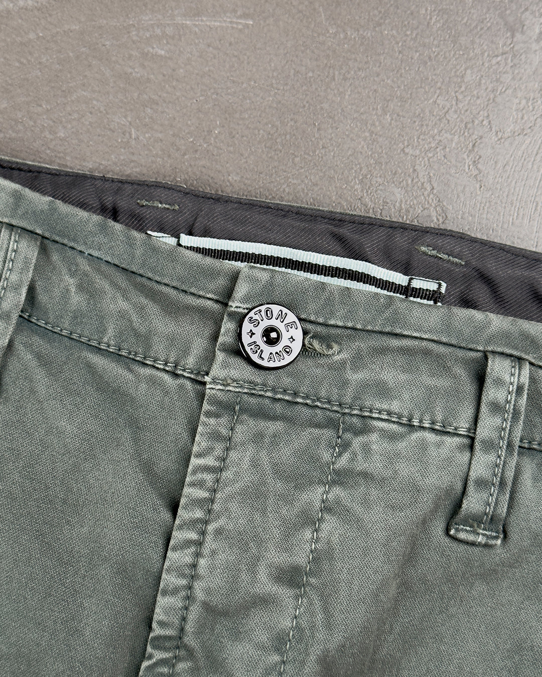 Завужений крій. Врізні кишені з потайною застібкою на блискавку. Одна задня кишеня з потайною застібкою на блискавку. По одній кишені на кожній штанині з клапаном; ліва кишеня з емблемою Stone Island. Посилена посадка. Застібка на блискавку та ґудзик.