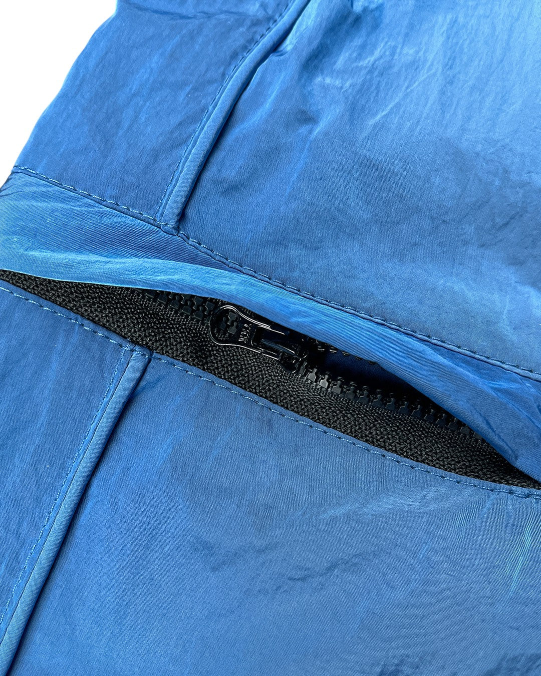 Прорізні кишені з блискавками. Задня кишеня з прихованим ґудзиком. Еластичний пояс з зав'язкою. Внизу штанин: резинка і блискавка. Підкладка з нейлонової сітки.
