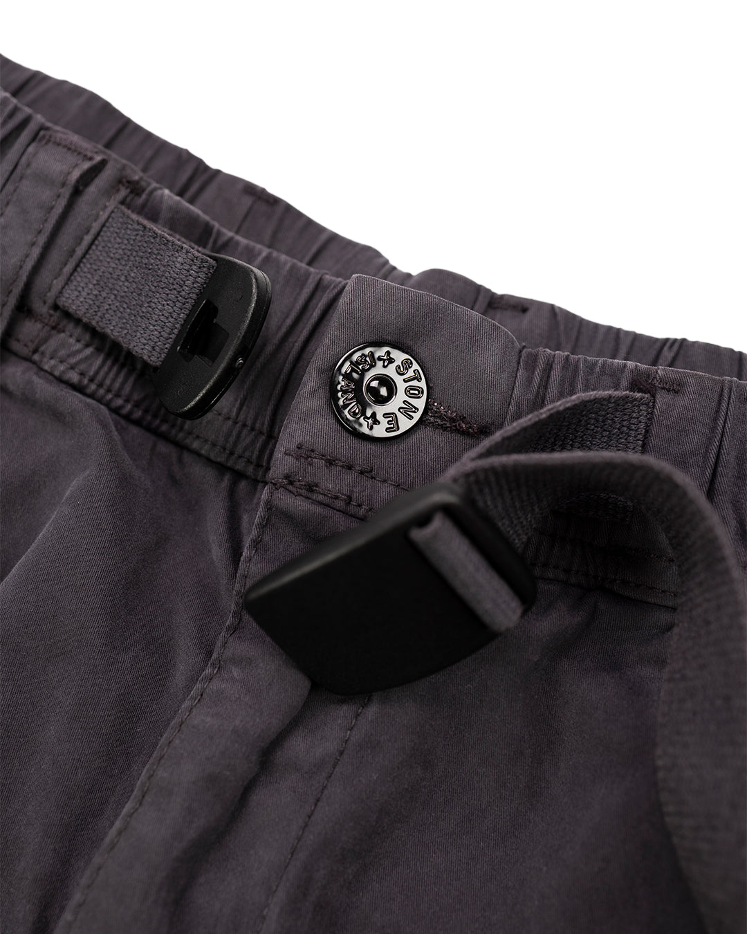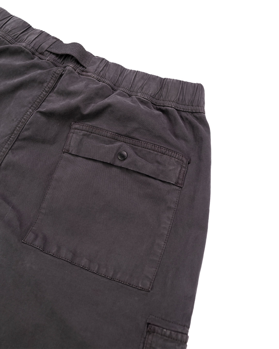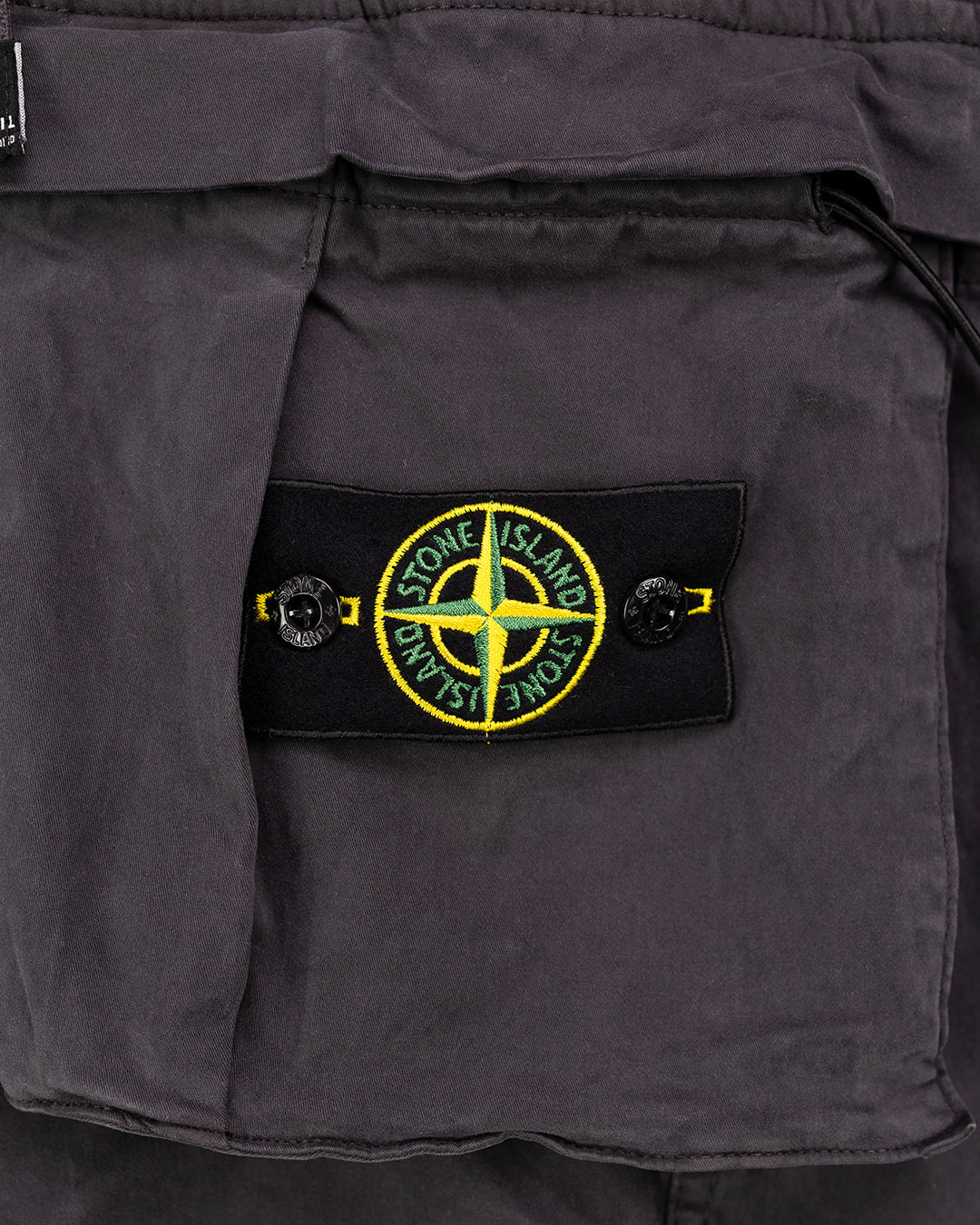Карго-штани виготовлені з еластичного бавовняного полотна та мають фарбування. Вони виконані в регулярному завуженому крої, оснащені поясними кишенями на потайній блискавці, а також однією задньою кишенею з потайною застібкою. На штанинах розташована кишеня з клапаном і потайними прес-шпильками. Штани мають посилені наколінники, еластичні манжети та пояс з внутрішнім шнурком. Застібка виконана на блискавці, а на лівій кишені знаходиться значок Stone Island.