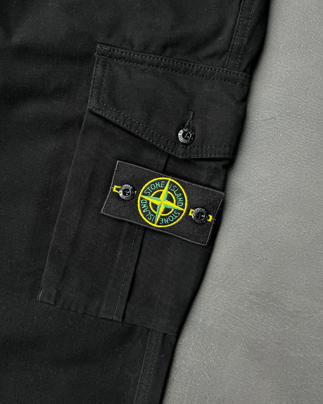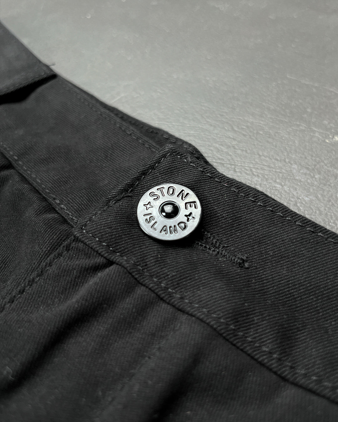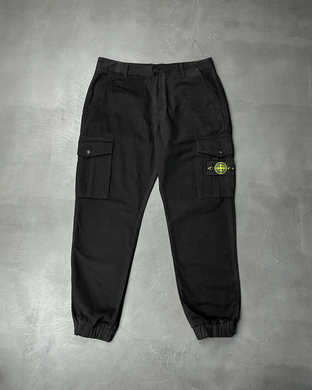 Звичайна заужена посадка. Кишені для рук у швах. Одна прорізна кишеня ззаду на прихованому гудзику. На кожній штанині по одній накладній кишені-книжці з клапаном на гудзику. Еластичний пояс з внутрішньою шнурівкою. Застібка-блискавка.