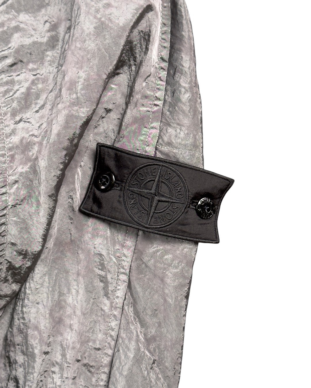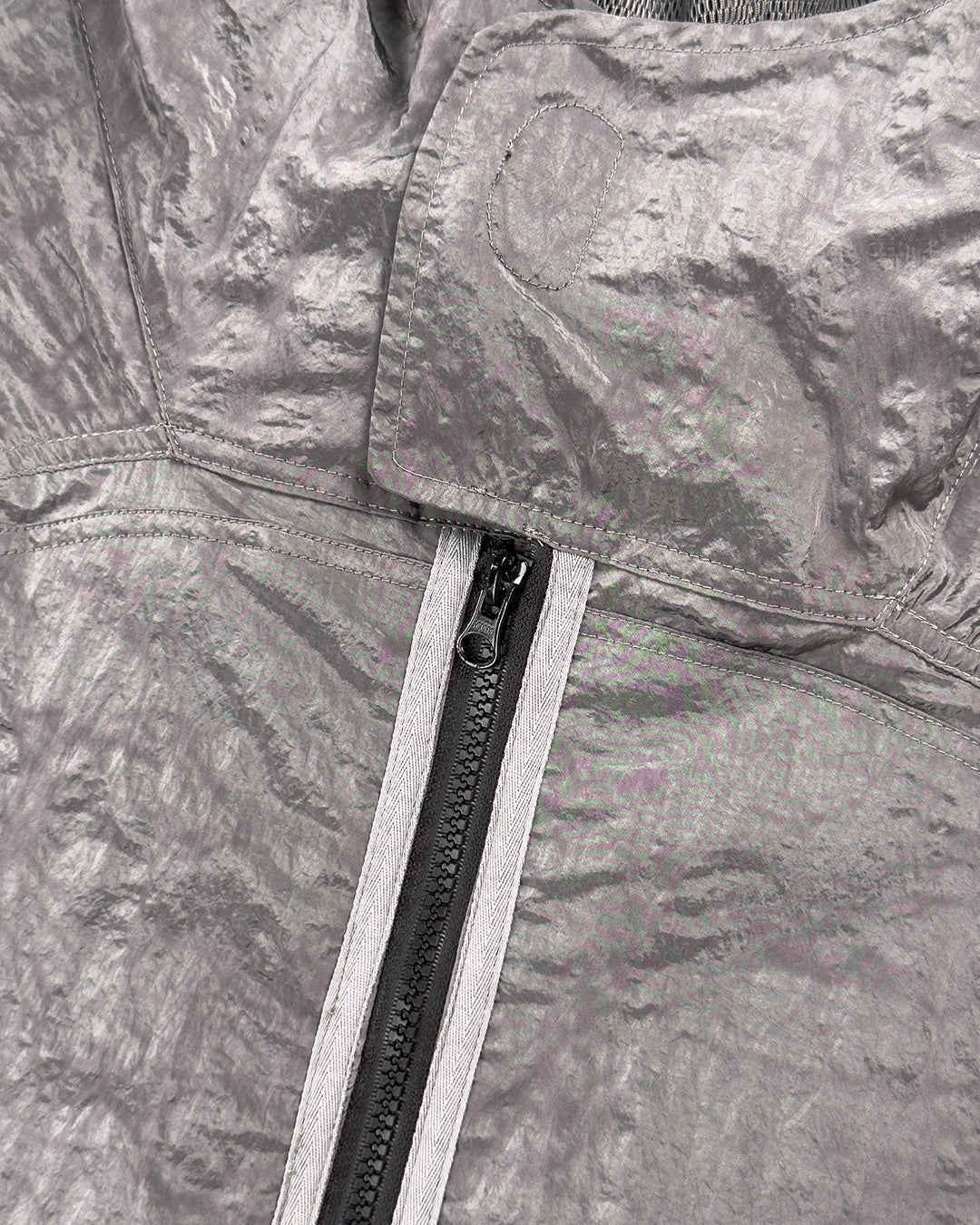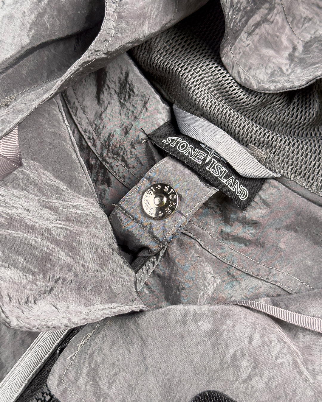 Капюшон з підкладкою з технічної еластичної нейлонової сітки; контурний шнурок та штормовий клапан на липучках. Бічні кишені для рук з потайною застібкою на блискавку. Рукав-реглан спереду, суцільнокроєна конструкція плеча і рукава ззаду. Кокетка на спині. Під проймою вентиляційний розріз. Напівприхований значок Stone Island Shadow на лівому рукаві. Застібка на липучках на манжетах. Закруглений подовжений задній поділ. Регульовані та знімні лямки для перенесення всередині. Двостороння застібка на блискавку.