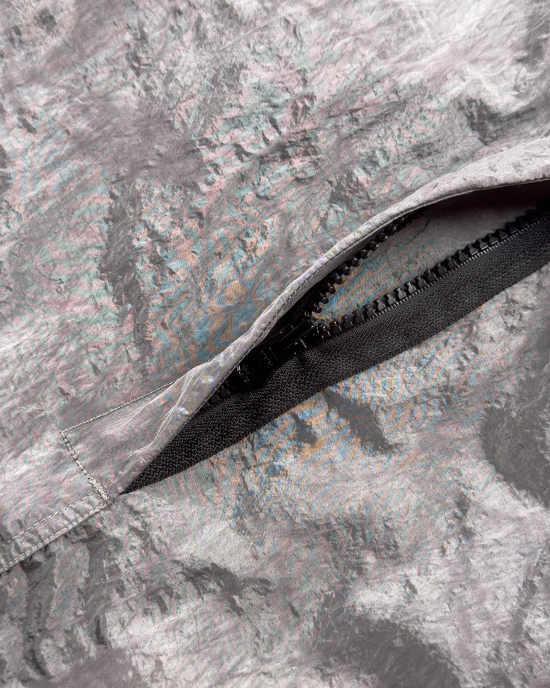 Коротка легка парка виготовлена з нейлону Nylon Metal, матеріалу, що має металевий та переливчастий вигляд при фарбуванні, з використанням регенерованої пряжі ECONYL®. Нейлон, що відслужив свій термін, переробляється за допомогою складного процесу деполімеризації, щоб створити це волокно, яке має ті ж самі характеристики, що й нейлон з викопної сировини. Спеціальні фарби, що використовуються для нанесення сезонної графіки, стискають тканину, створюючи різні текстури на поверхні матеріалу, граючи з блиском нейлонового металу та додаючи зональної жорсткості ділянкам. Одяг пофарбовано з додаванням стійкого засобу, що не містить ПФУ, який запобігає утворенню плям.