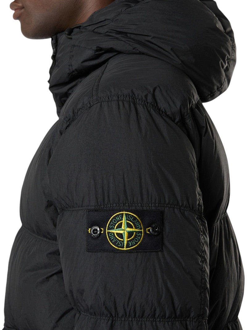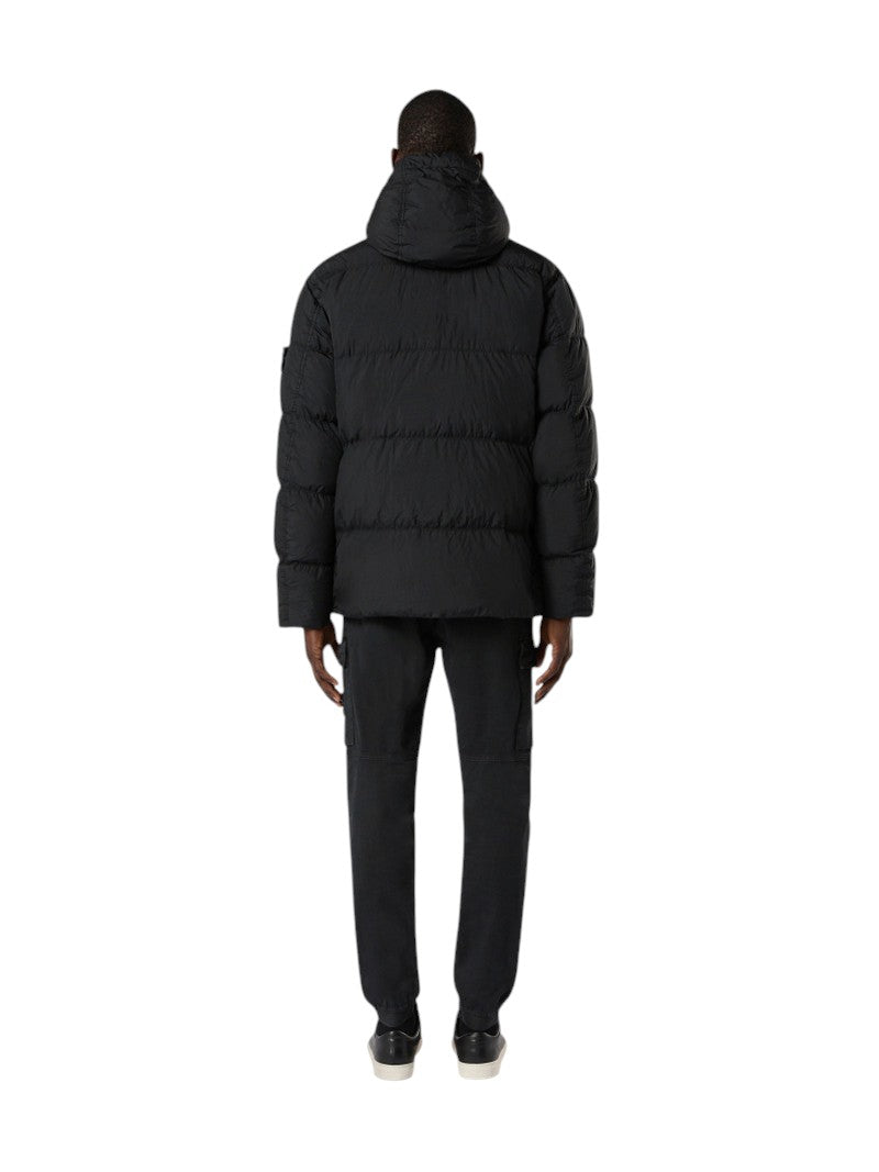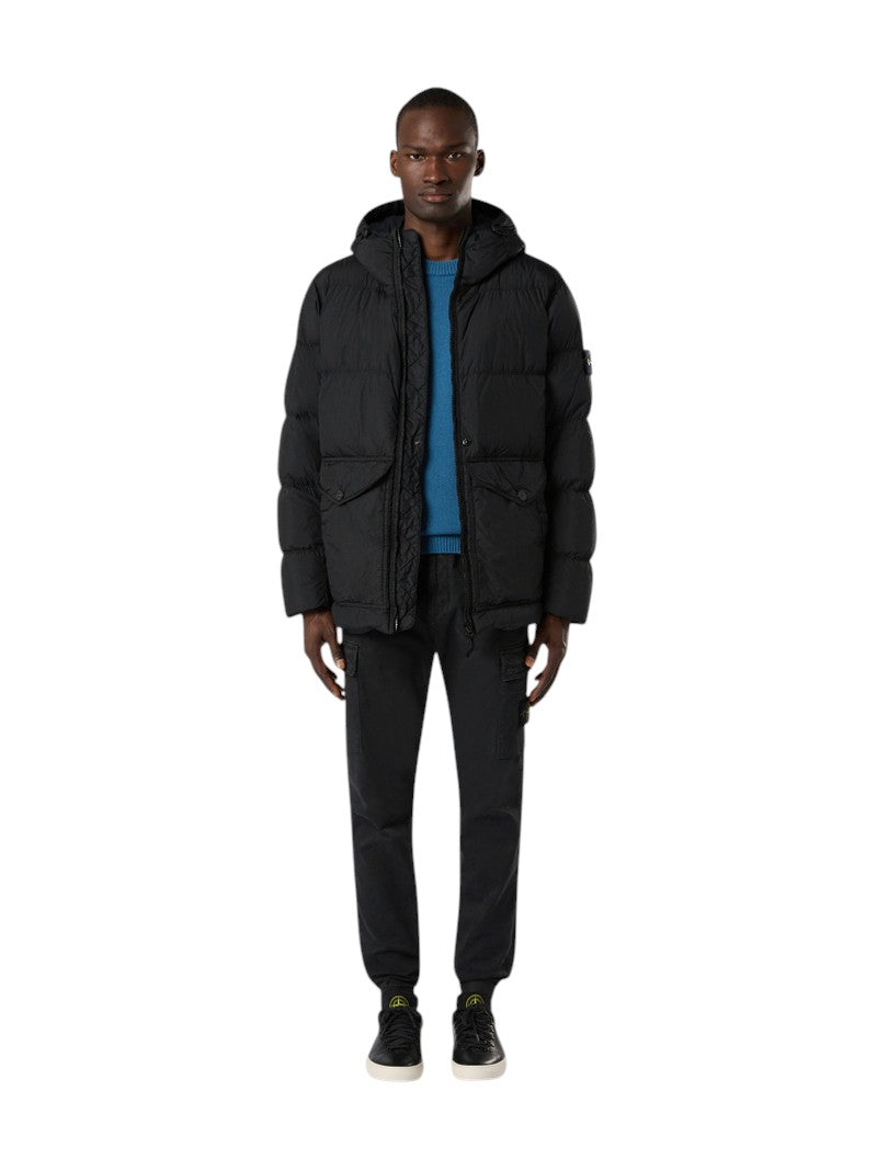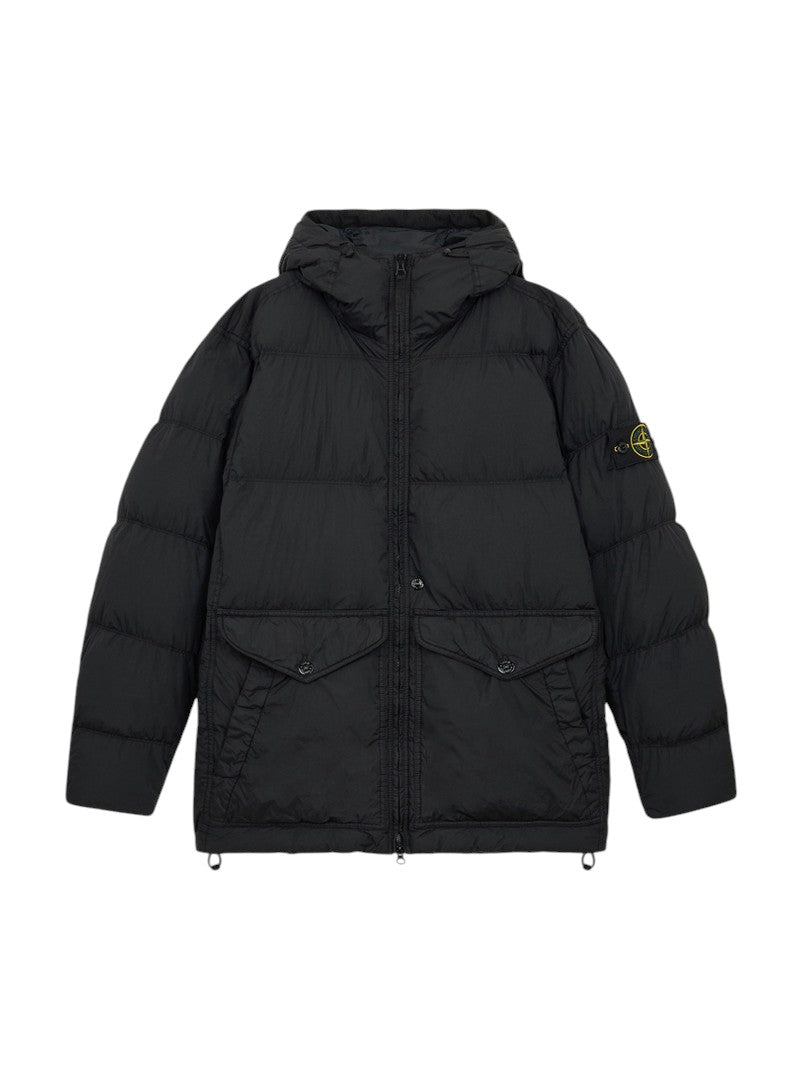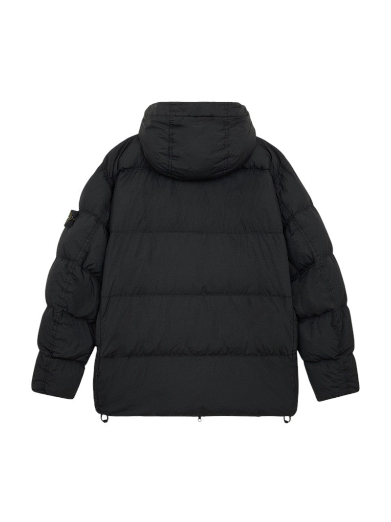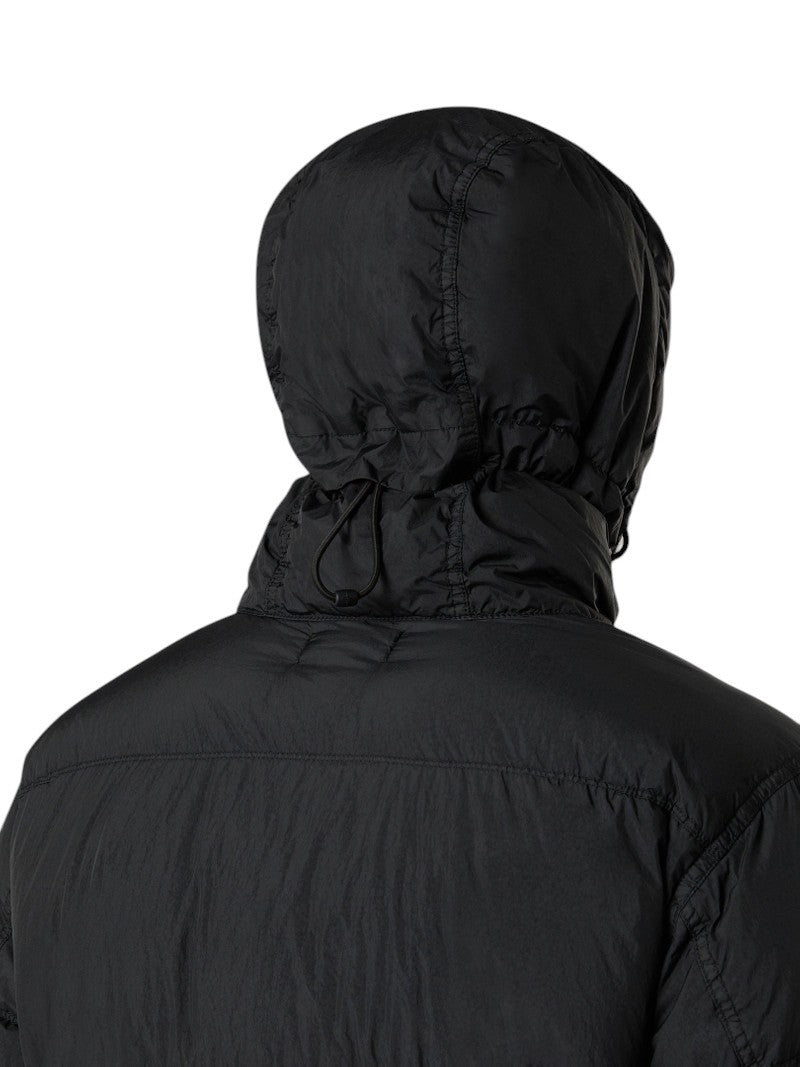 Stone Island пухова куртка з капюшоном, виконана з 100% переробленого легкого нейлону з надщільною структурою. Внутрішнє полімерне покриття забезпечує вітрозахист та легку водонепроникність. Модель фарбована у готовому вигляді — завдяки спеціальній смоляній обробці тканина набуває характерної фактури та глибини кольору.