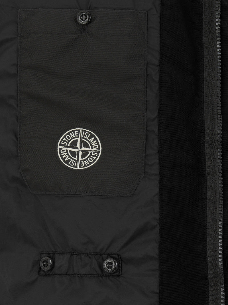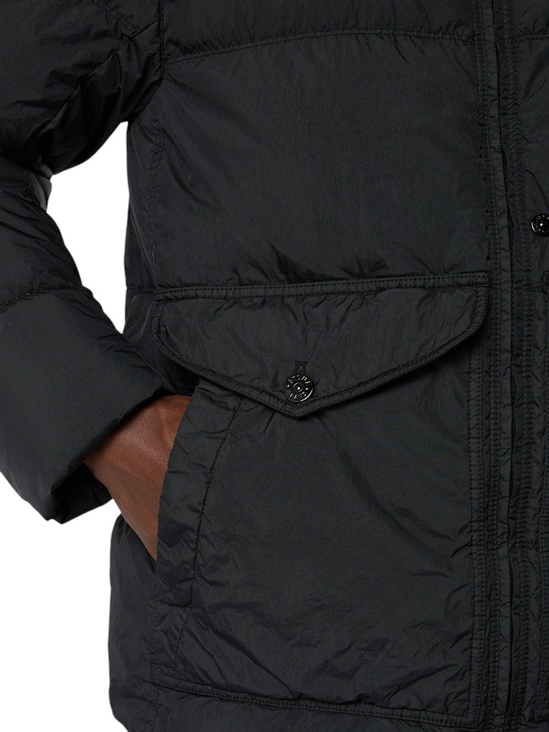 Куртка оснащена пуховим капюшоном із регулюванням, подвійними кишенями для рук та двосторонньою блискавкою з внутрішньою планкою. На лівому рукаві — фірмова знімна емблема Stone Island.