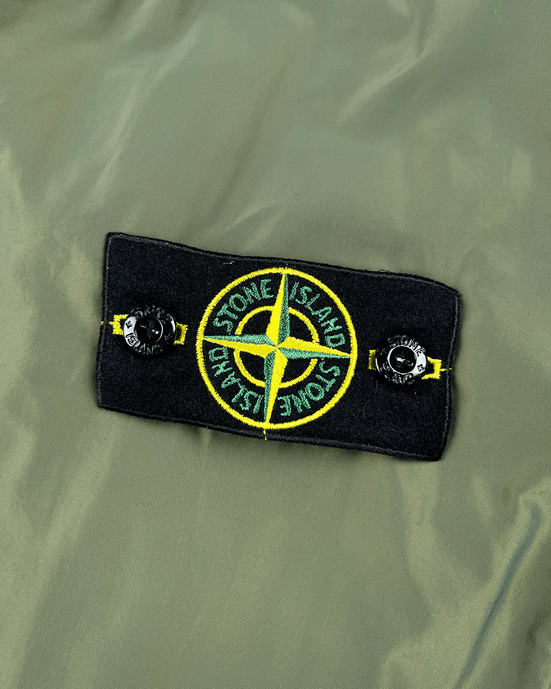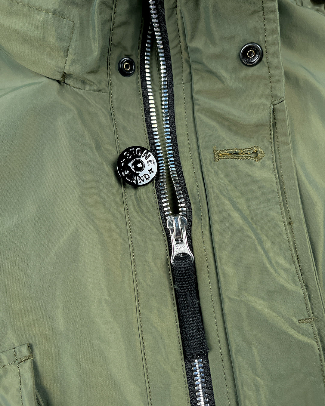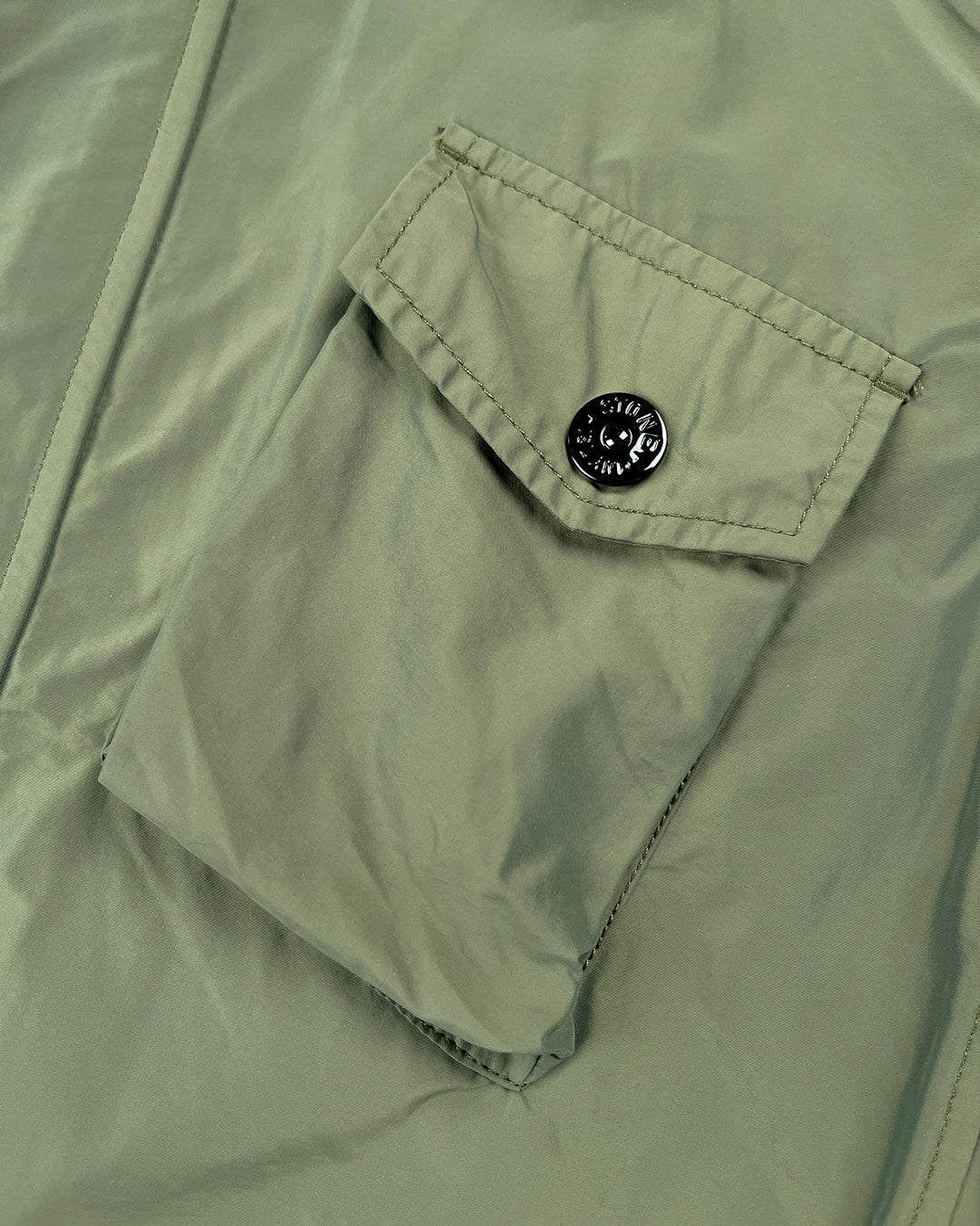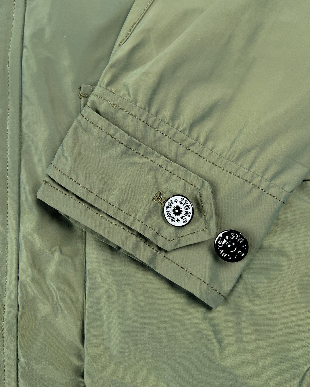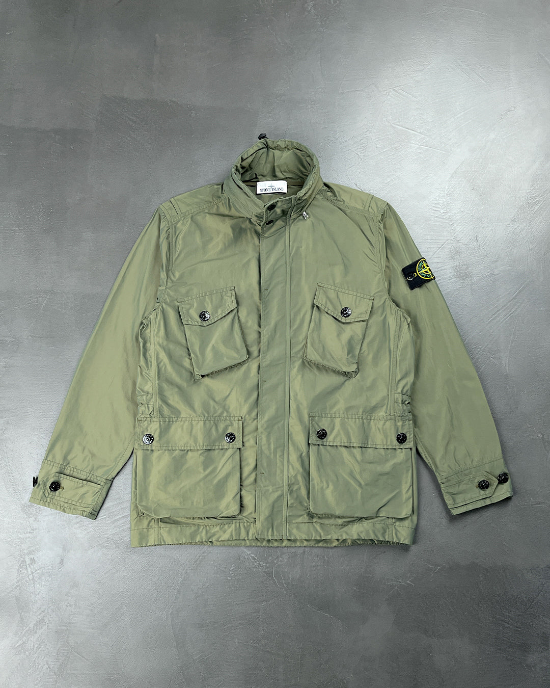 Куртка від Stone Island з вітрозахисного матеріалу має високу горловину з потайним капюшоном, приховану застібку-блискавку, чотири передні накладні кишені з клапанами, що застібаються на кнопки, регульовані манжети на ґудзиках та знімну дизайнерську нашивку на рукаві.