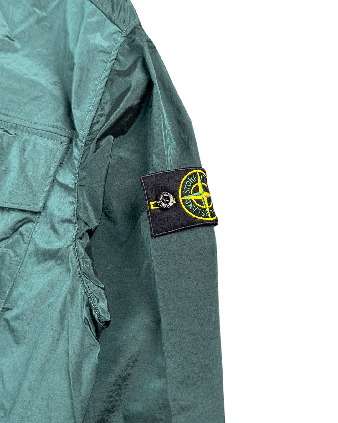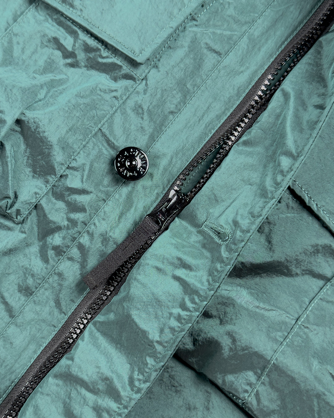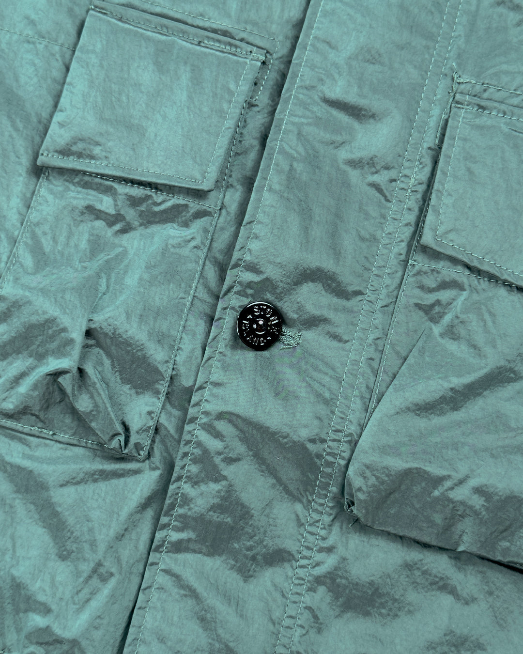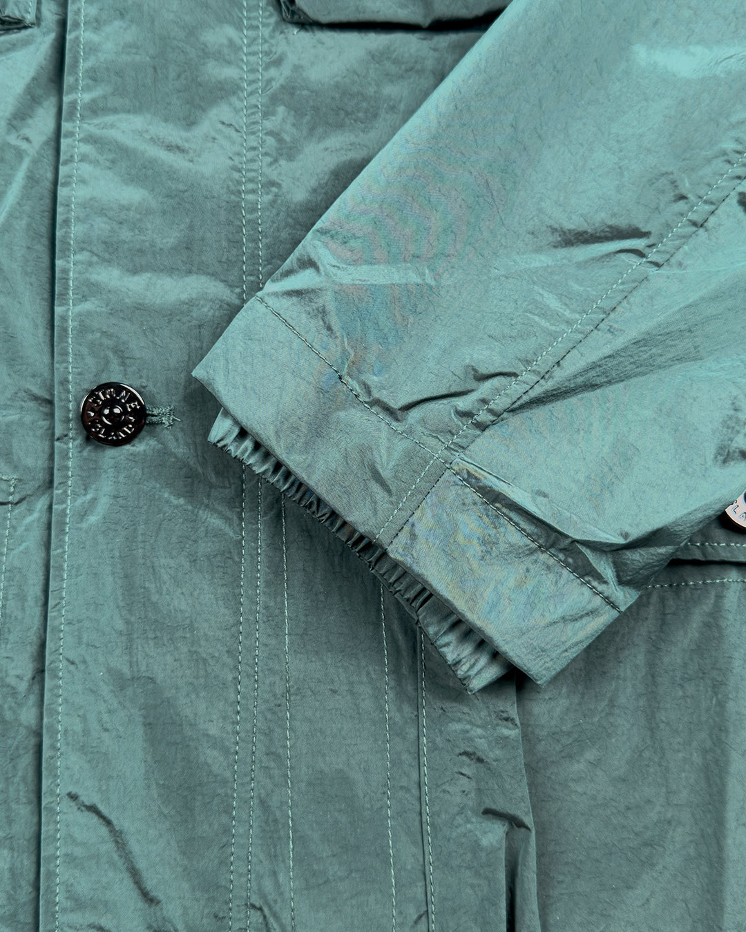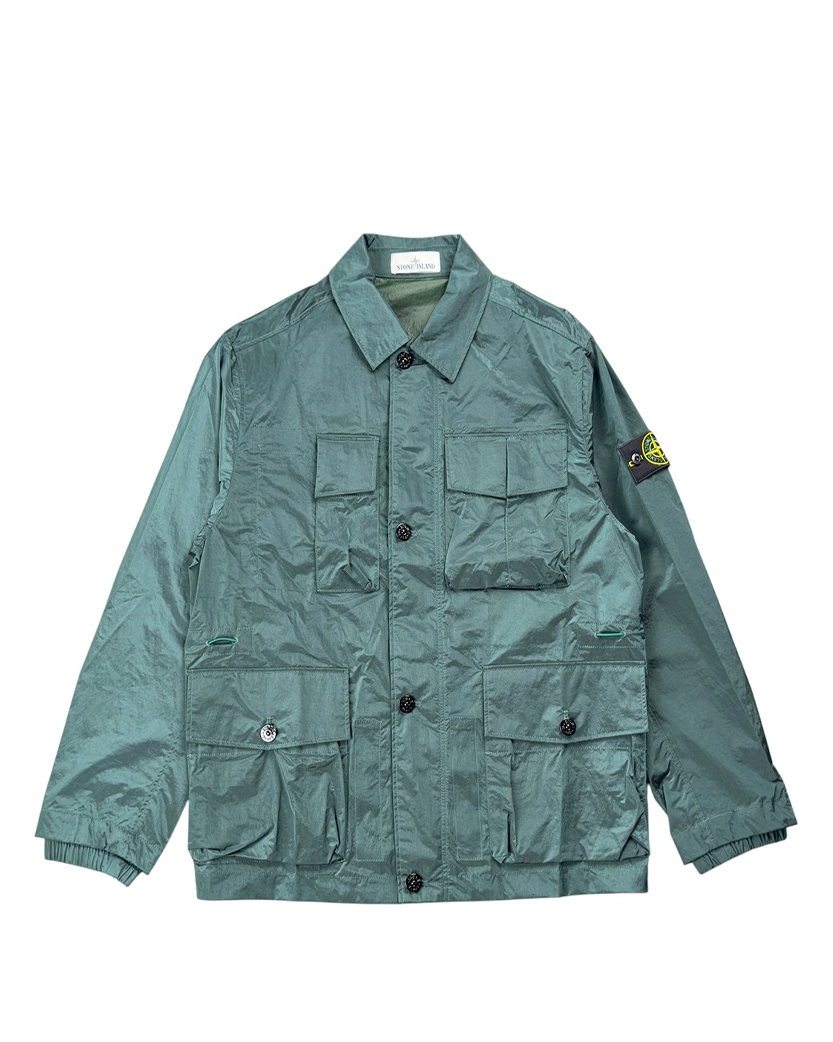 Польова куртка виготовлена з нової відповідальної тканини Stone Island з переливчастим нейлоном Nylon Metal. Еволюція цієї культової тканини полягає у використанні регенерованої пряжі ECONYL®: нейлон, що відслужив свій термін, переробляється за допомогою складного процесу деполімеризації, щоб створити волокно, яке має ті ж характеристики, що й нейлон з викопної сировини. Тканина зсередини обробляється смолою для легкої водо- та вітростійкості. Потім готовий виріб проходить складну процедуру подвійного фарбування з додаванням спеціального засобу, що запобігає втраті кольору.