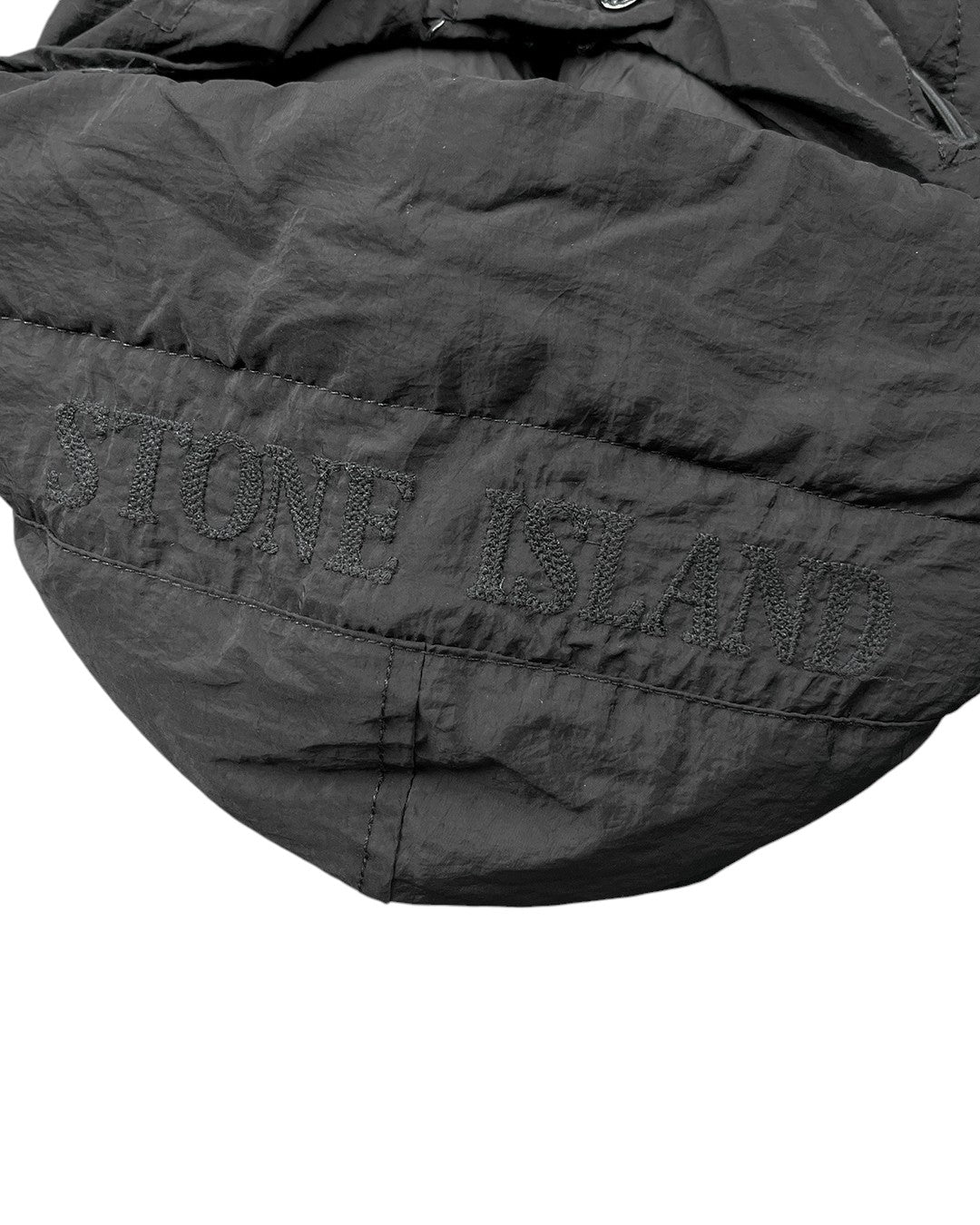 Пуховик з капюшоном з металевого нейлону. Трилопатева структура нейлонової пряжі є основою характерного металевого та тонічного блиску Nylon Metal, однієї з найуніверсальніших тканин, створених у результаті досліджень текстилю STONE ISLAND. Готовий виріб проходить складну процедуру подвійного фарбування, що забезпечує різні тони, інтенсивність і кольори волокон і текстильних аксесуарів одягу. Виріб наповнено найтоншим пір’ям, спеціально обробленим, щоб витримати процедуру фарбування одягу. Додавання спеціального агента до формули барвника робить колір стійким.