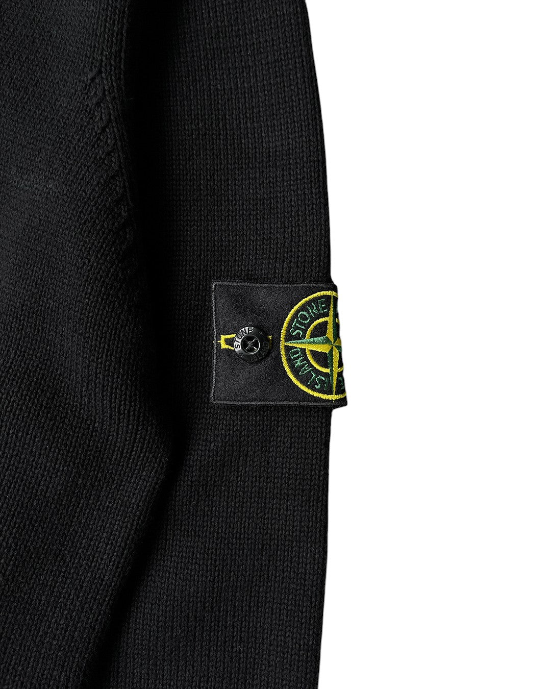 Светр чорного кольору із коміром-стійкою, з вовни та нейлону букле. Комбінація технік шиття створює легкий аранський мотив. Плоска ребриста горловина. Приспущені плечі. На грудях фірмовий візерунок бренду у вигляді троянди вітрів. Ребристі манжети та поділ.
