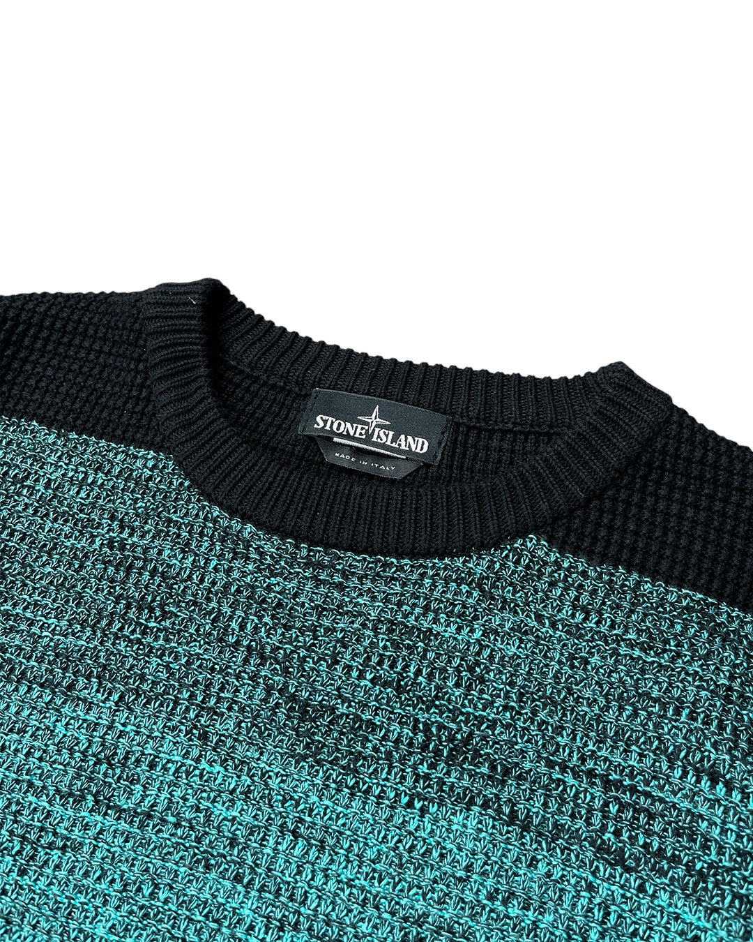 Різнобарвний бавовняний светр від Stone Island Shadow Project з грубою в'язкою, тональним градієнтним ефектом, логотипом бренду на зовнішній стороні рукава, круглою горловиною, прямим подолом і довгими рукавами.