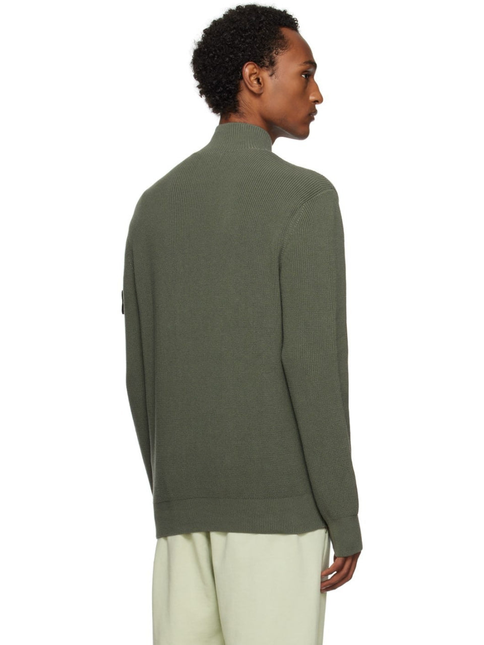 Трикотажний кардиган 526D8 від бренду Stone Island має високий комір і застібку на блискавці. Манжети та поділ у рубчик. На лівому рукаві - логотип Stone Island.