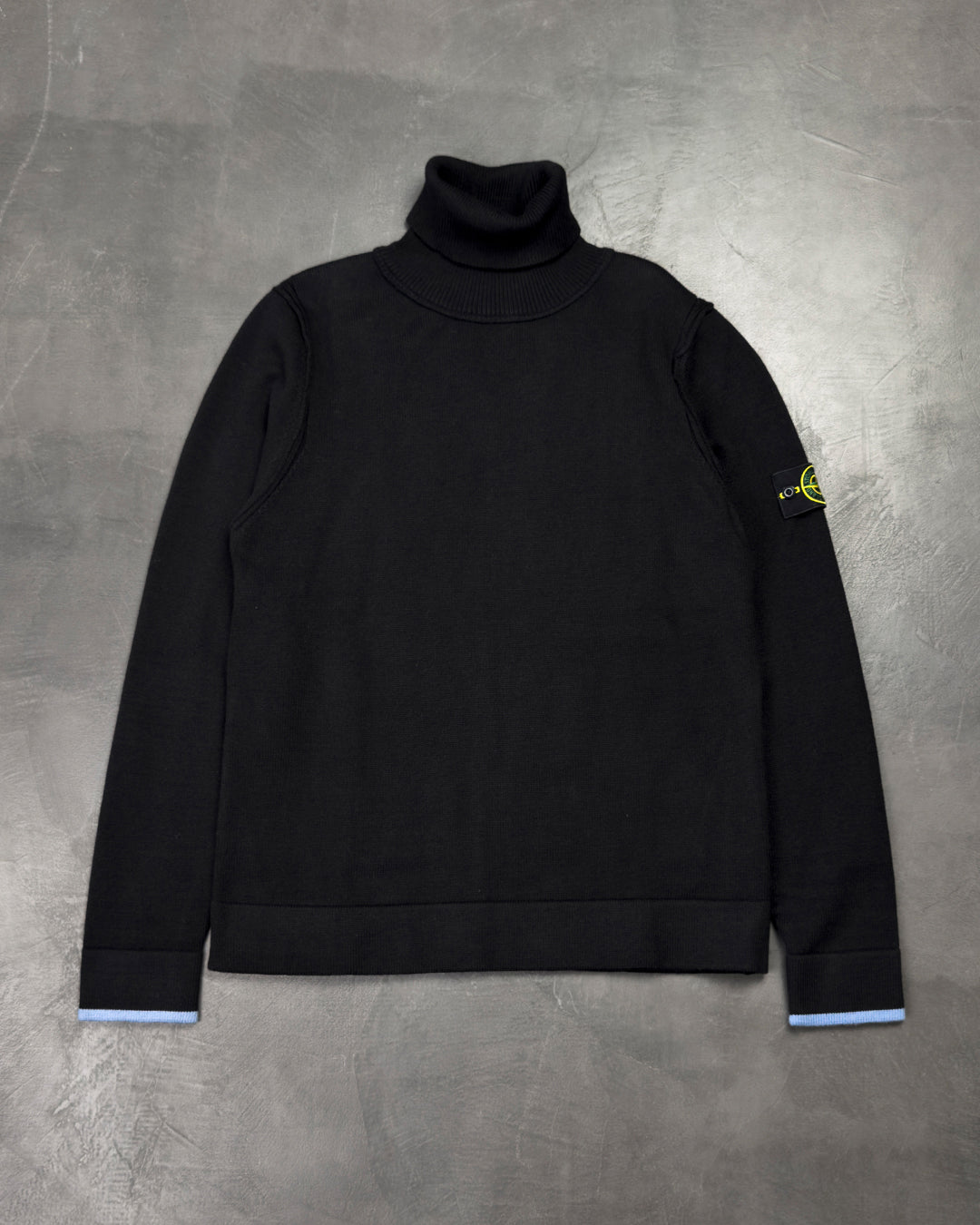 Светр класичного крою з високим ребристим коміром для стильного вигляду. Рельєфні шви на плечах і проймах, прямі манжети з контрастною обробкою та прямий поділ. На лівому рукаві розташований фірмовий значок Stone Island, який підкреслює високу якість та стиль бренду.
