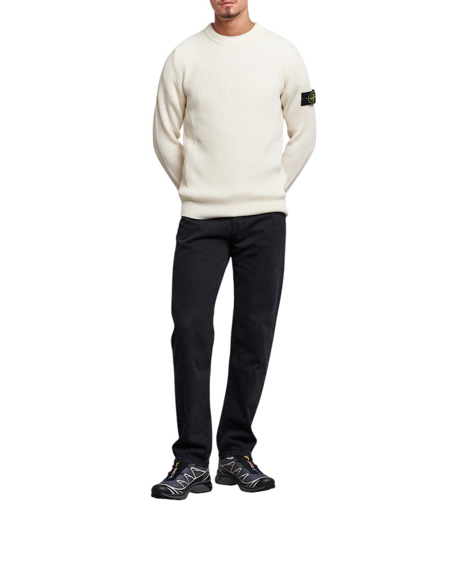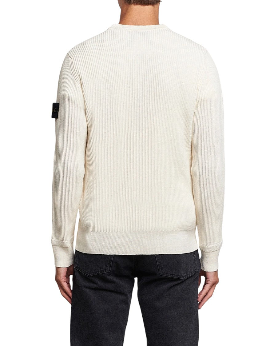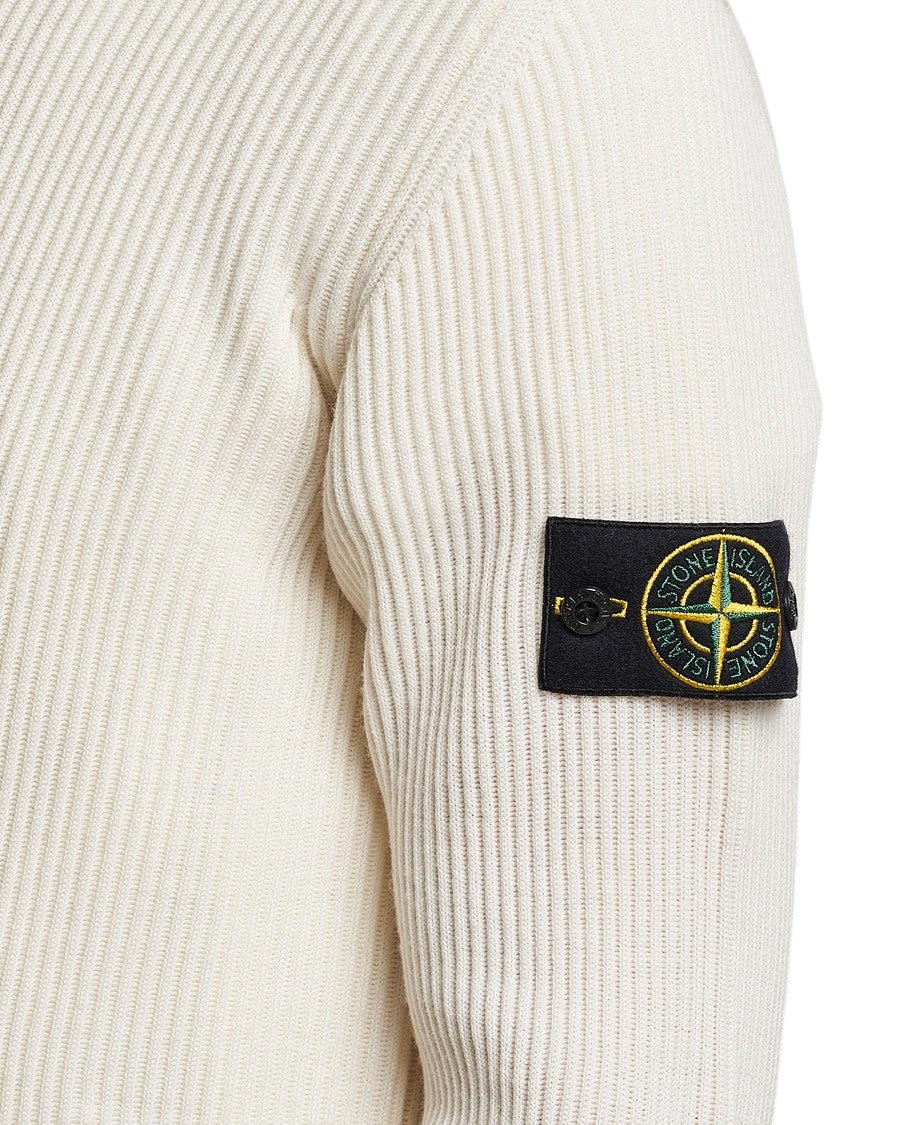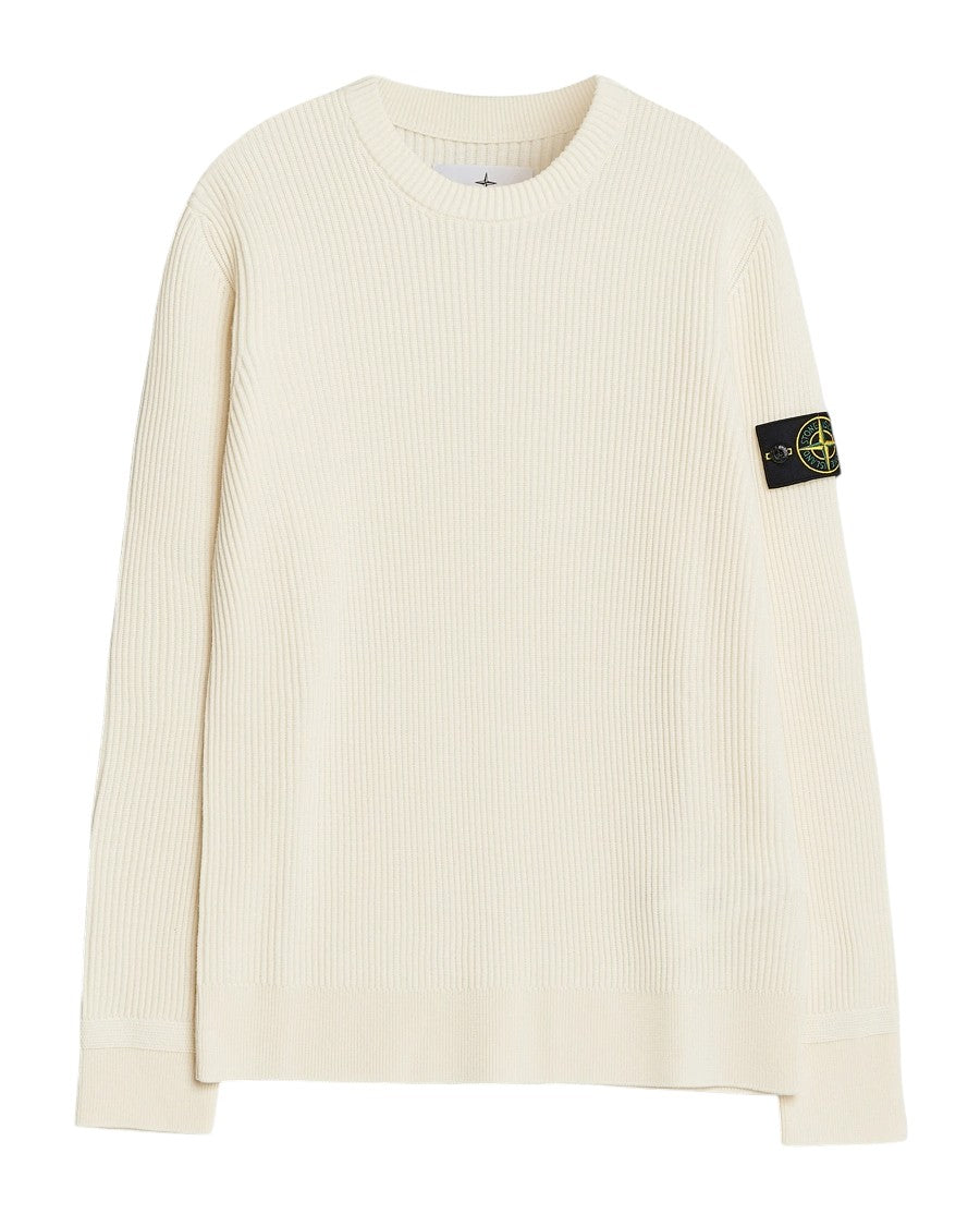 Трикотажний светр в ребристу смужку, зв'язаний з вовни, має круглу горловину, довгі рукава, один з яких прикрашений нашивкою у вигляді компасу.