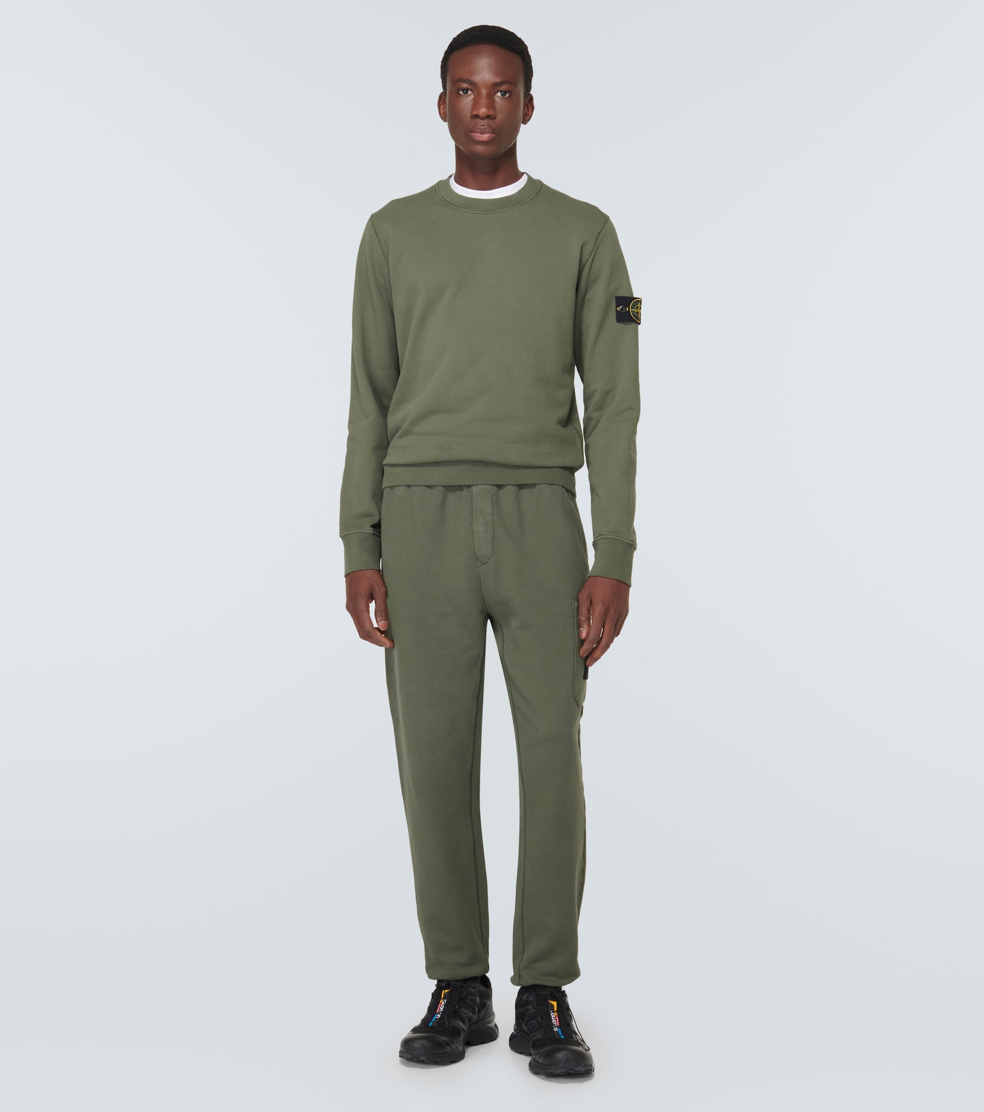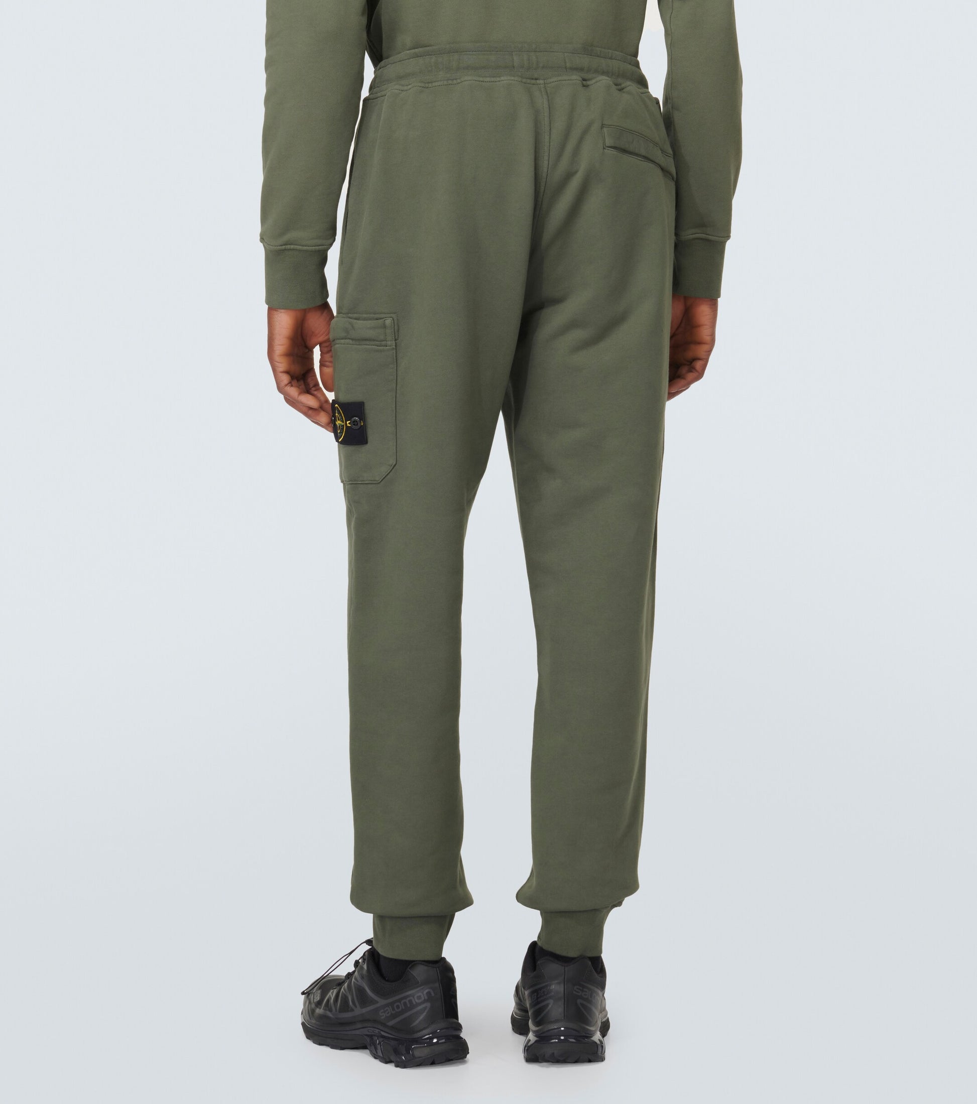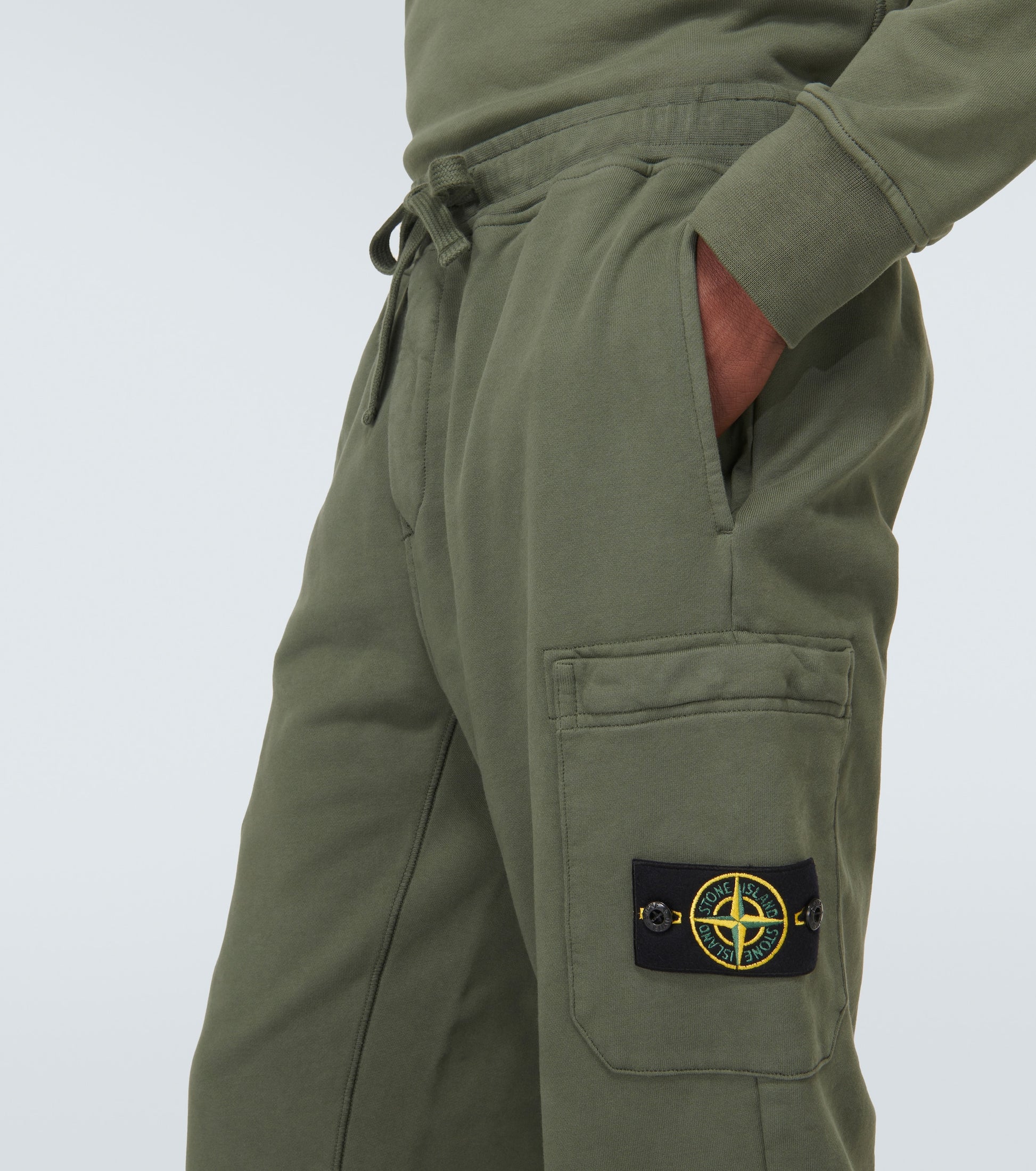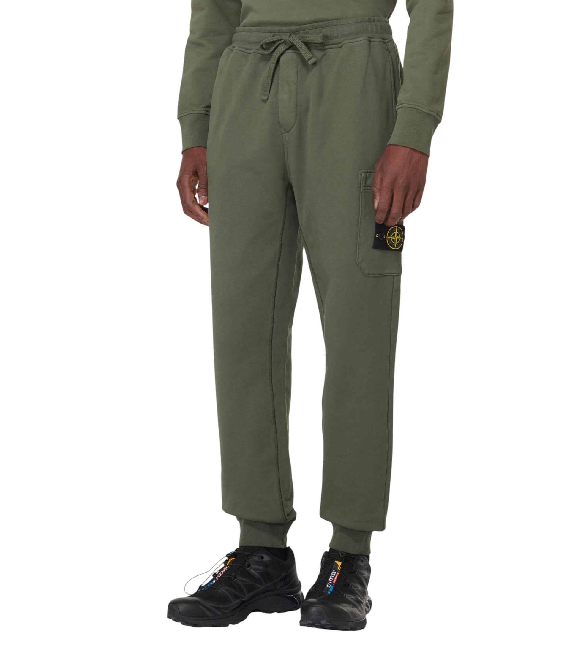 Спортивні штани з бавовняної тканини мають пофарбовану поверхню та зручний еластичний пояс з зовнішнім шнурком для регулювання. Вони оснащені бічними кишенями, однією кишенею ззаду з потайною застібкою, а також накладною кишенею на лівій штанині з нашивкою з логотипом Stone Island. Ребристі манжети гарантують додатковий комфорт і стиль.