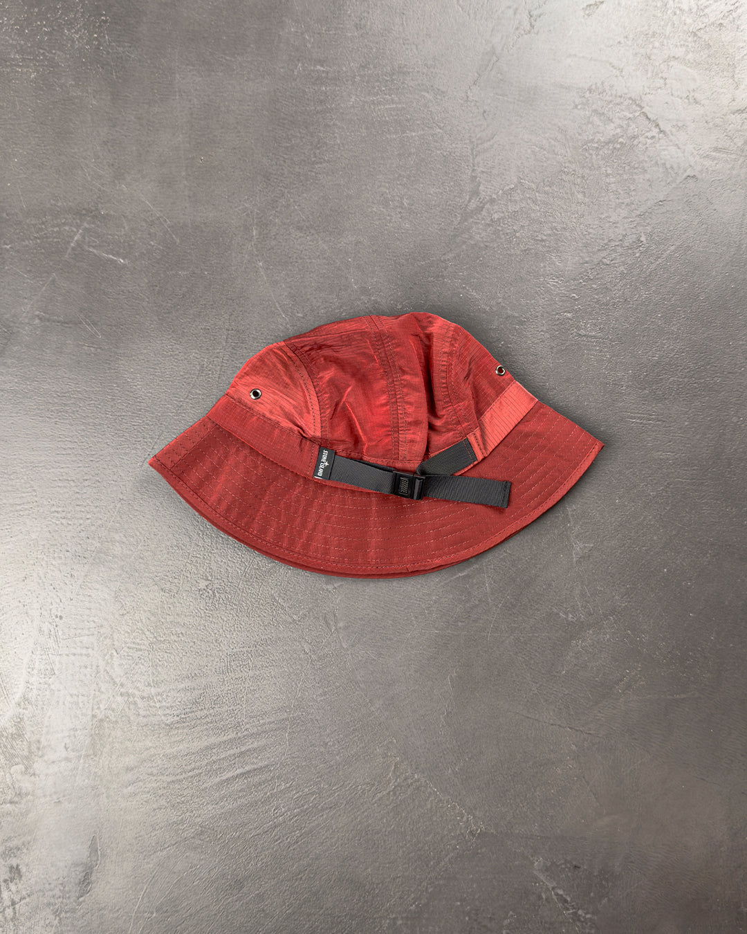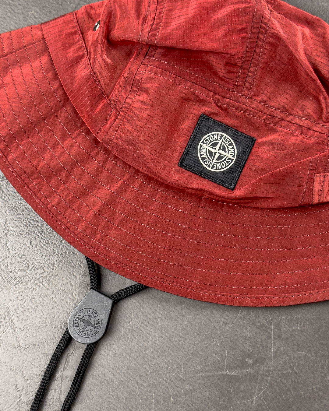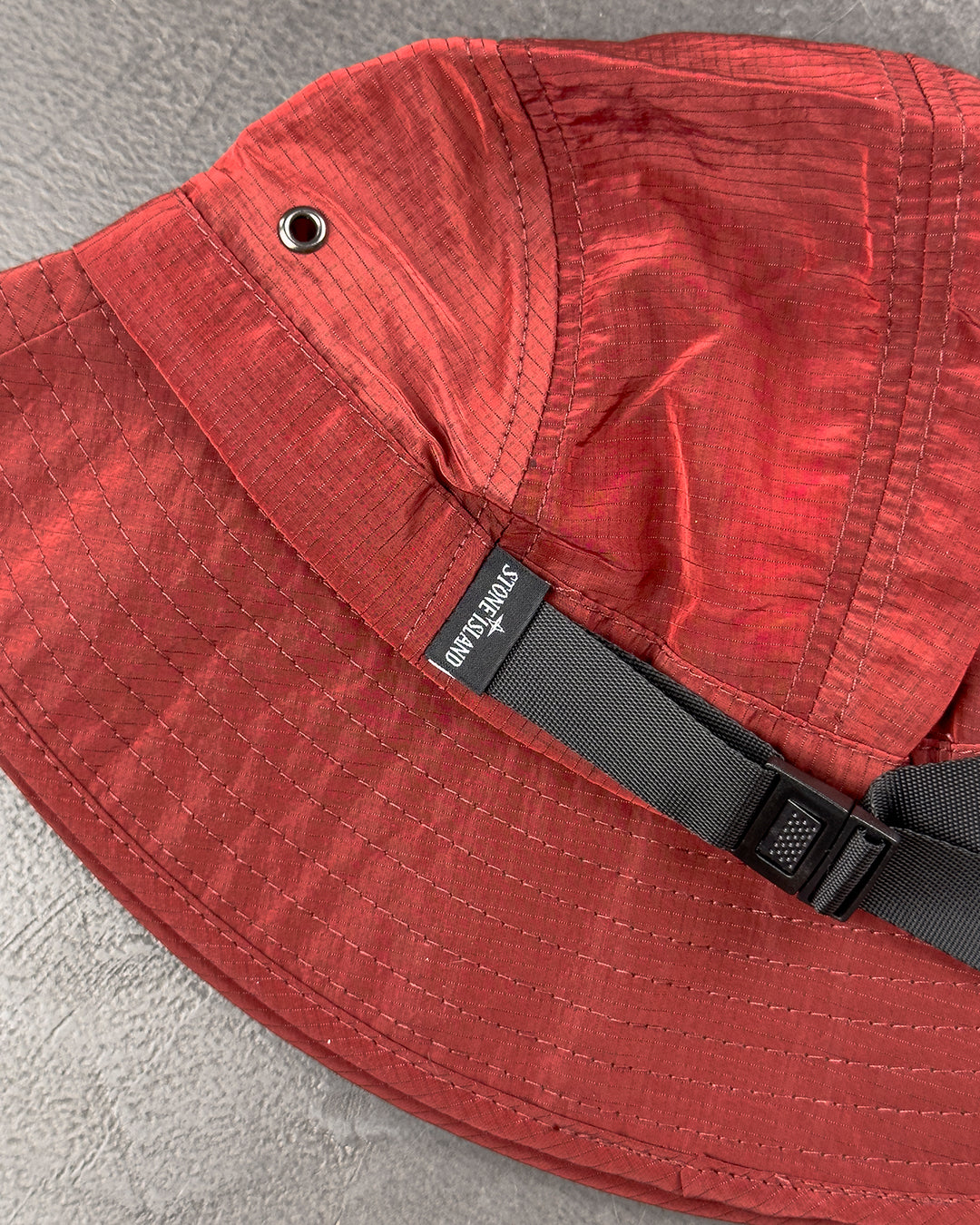 Панама з нейлонового мікрорипстопа з тридольною структурою волокон і металізованим, переливчастим ефектом. Прострочені поля. Вставки з матового нейлону. Вентиляційні отвори. Нейлоновий ремінець із пряжкою. Нашивка з емблемою Stone Island у вигляді троянди вітрів.