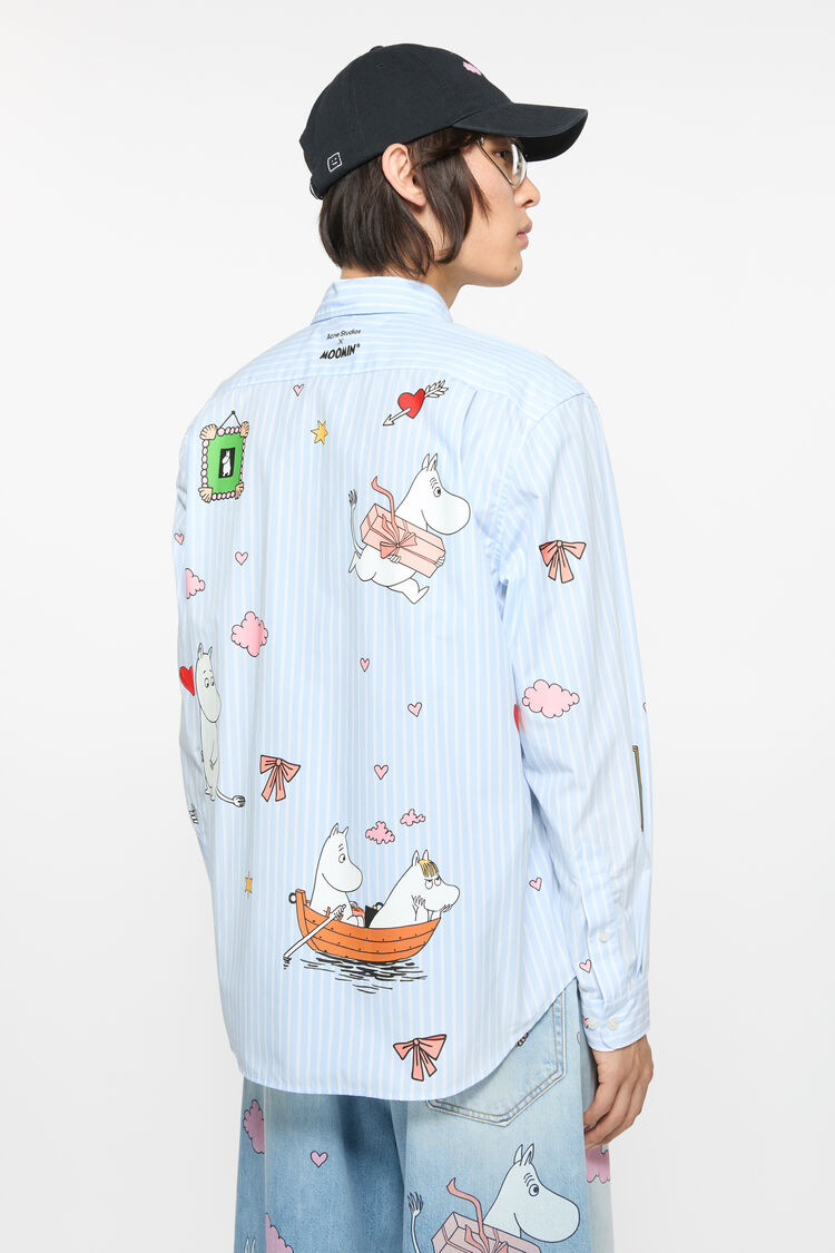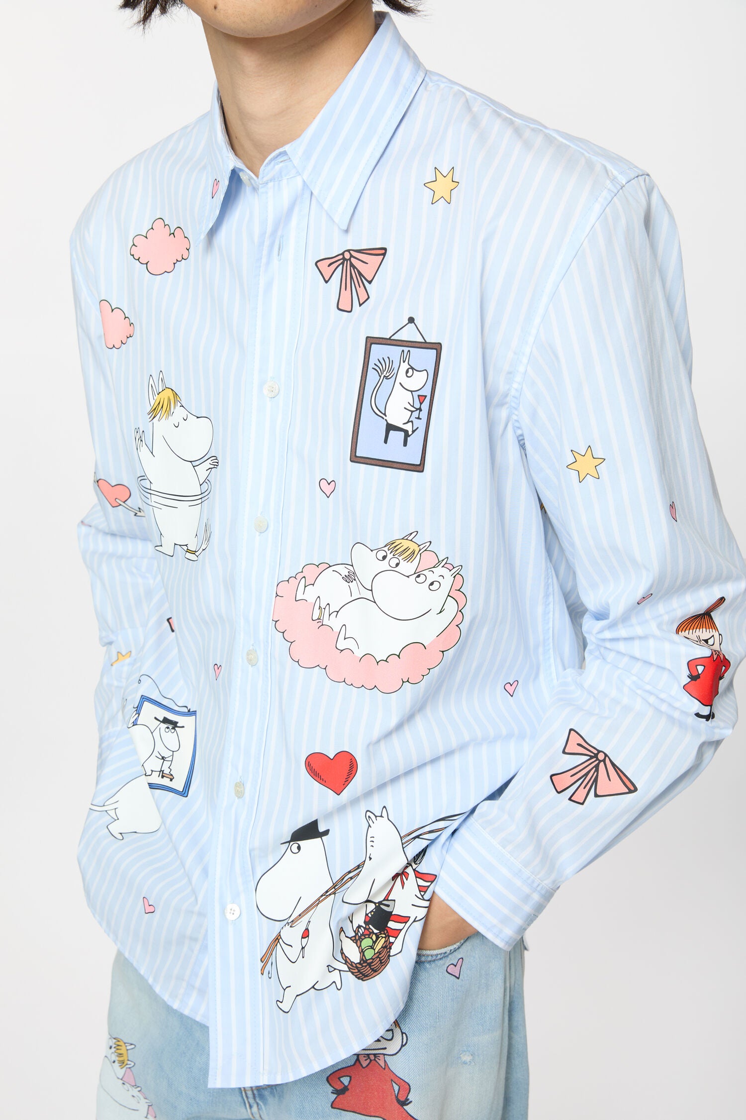 Сорочка Acne Studios x Moomin — це частина капсульної колекції, яка поєднує скандинавську естетику з казковим світом мумі-тролів. Модель унісекс виготовлена зі 100% органічної смугастої бавовни-попліну, має класичний прямий крій і подовжену довжину нижче талії. Прикрашена анімацією Moomin Characters та нашивкою з логотипом, сорочка застібається на ґудзики й підходить для легких, невимушених образів із ноткою ностальгії.