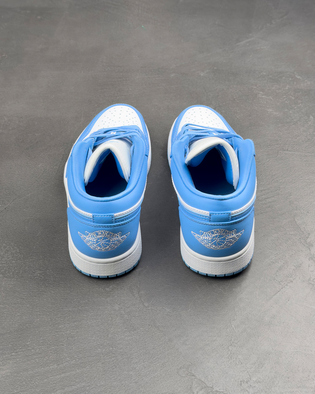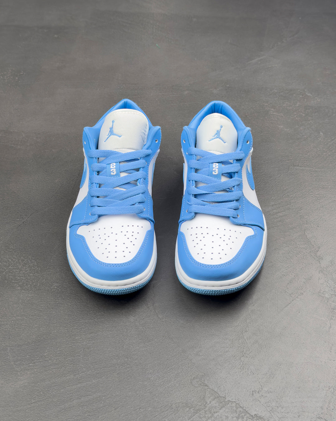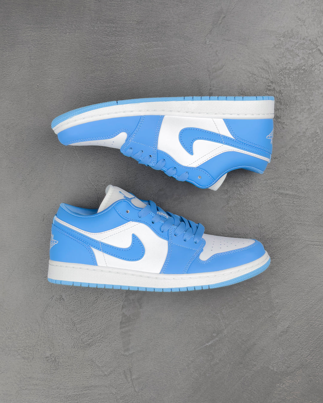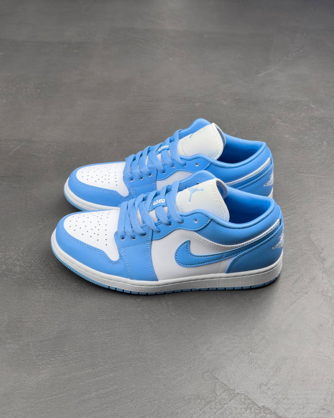 Кросівки Air Jordan 1 Low 'UNC' мають просту двокольорову гаму, що вшановує навчальний заклад, де навчався Майкл Джордан. Верх зі шкіри має накладки відтінку University Blue на чистій білій основі, доповнені м'яким відбитим комірцем для зручної посадки та перфорованою деталізацією на носковій частині для більшої вентиляції. Елементи брендування включають Jumpman на язичку та вишитий логотип Jordan Wings на задній панелі.
