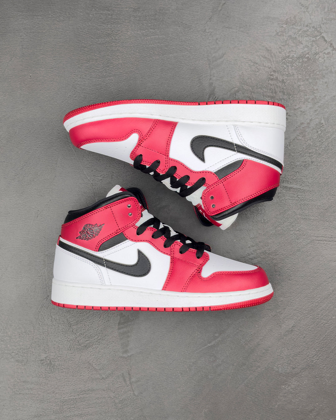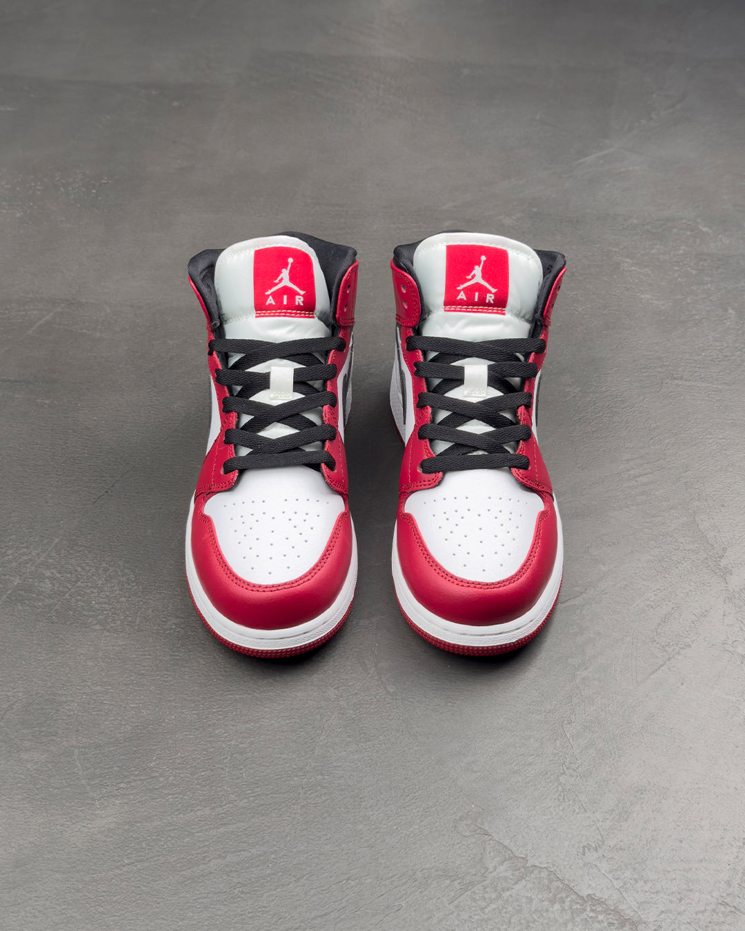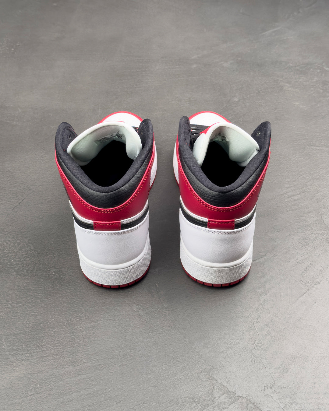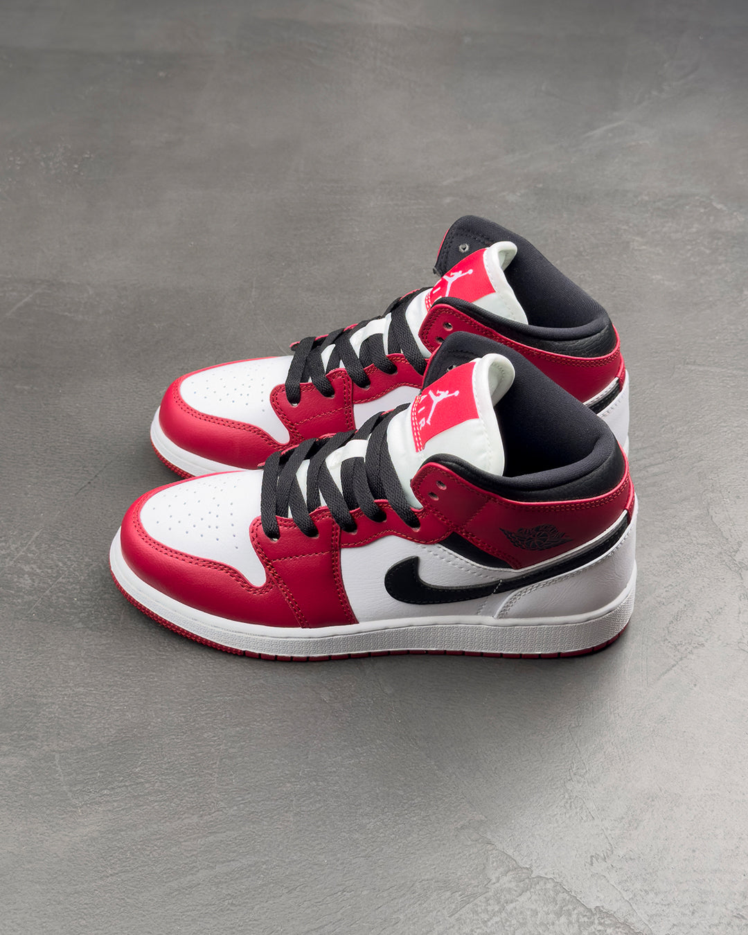 Дизайн кросівок Air Jordan 1 Mid 'Chicago' включає переважно білий шкіряний верх, що контрастує з накладками Gym Red та чорним Nike Swoosh на бічній стороні. Дизайн також включає логотип Air Jordan Wingman на п'ятковій частині, чорну систему шнурівки та червону застібку на п'яті, що полегшує взування. Білий носок кросівок також має перфорацію, яка забезпечує безперешкодний потік повітря. Біла гумова проміжна підошва кросівок забезпечує комфорт завдяки поглинанню ударів, а підошва Gym Red має протектори для оптимального зчеплення з різними поверхнями.