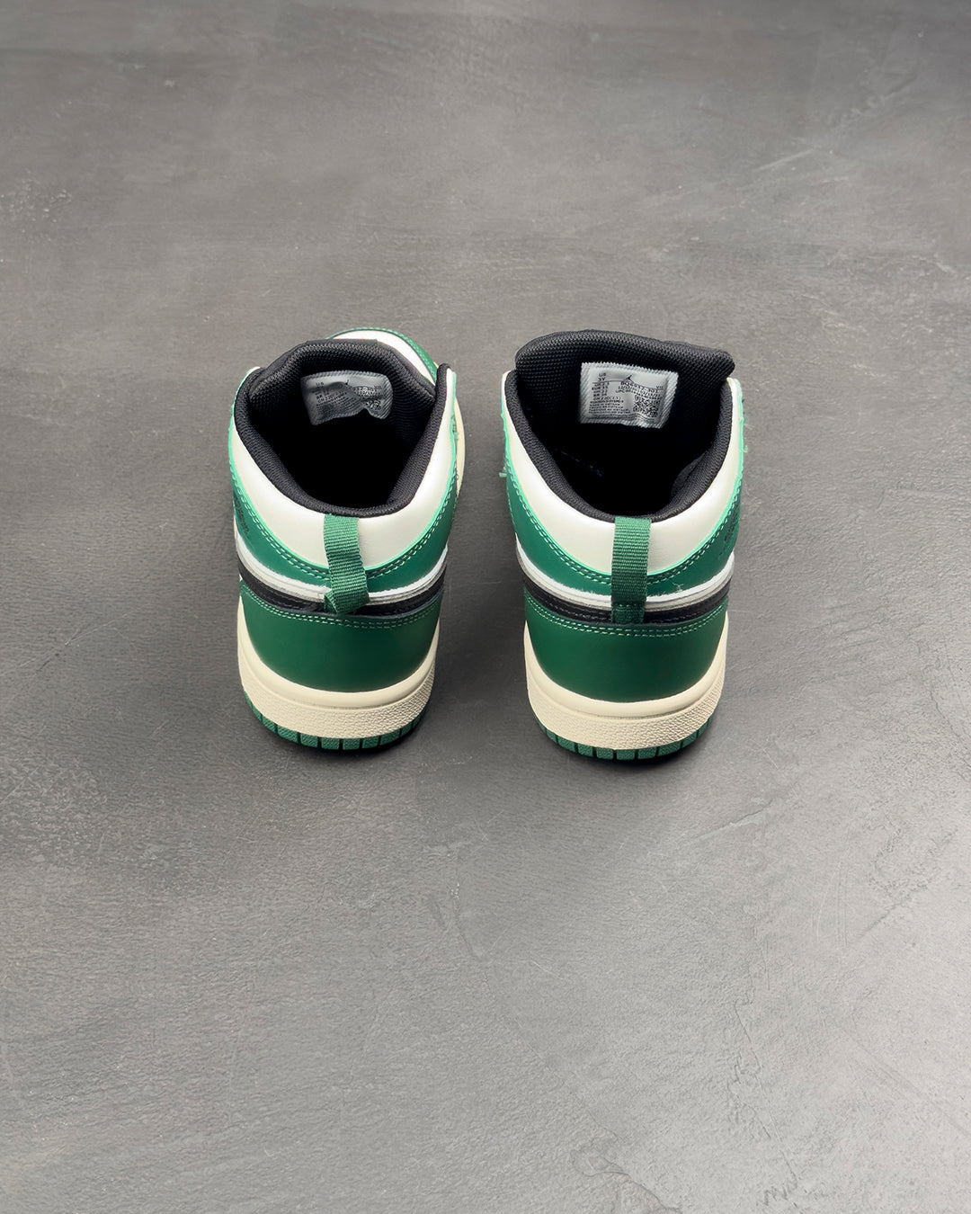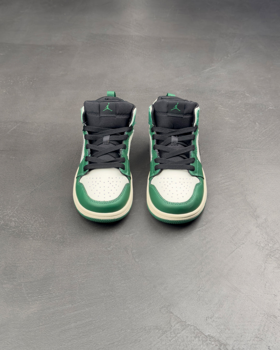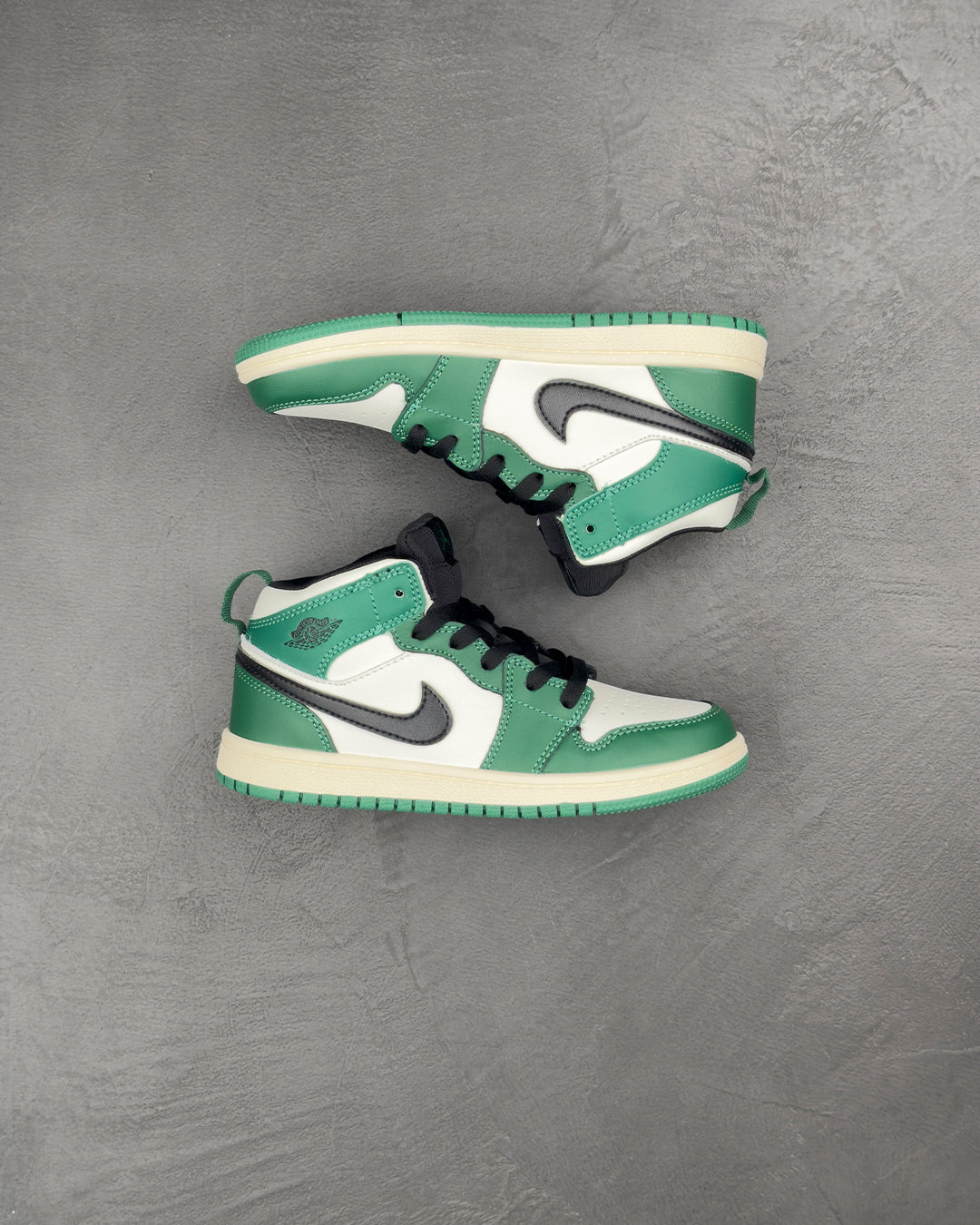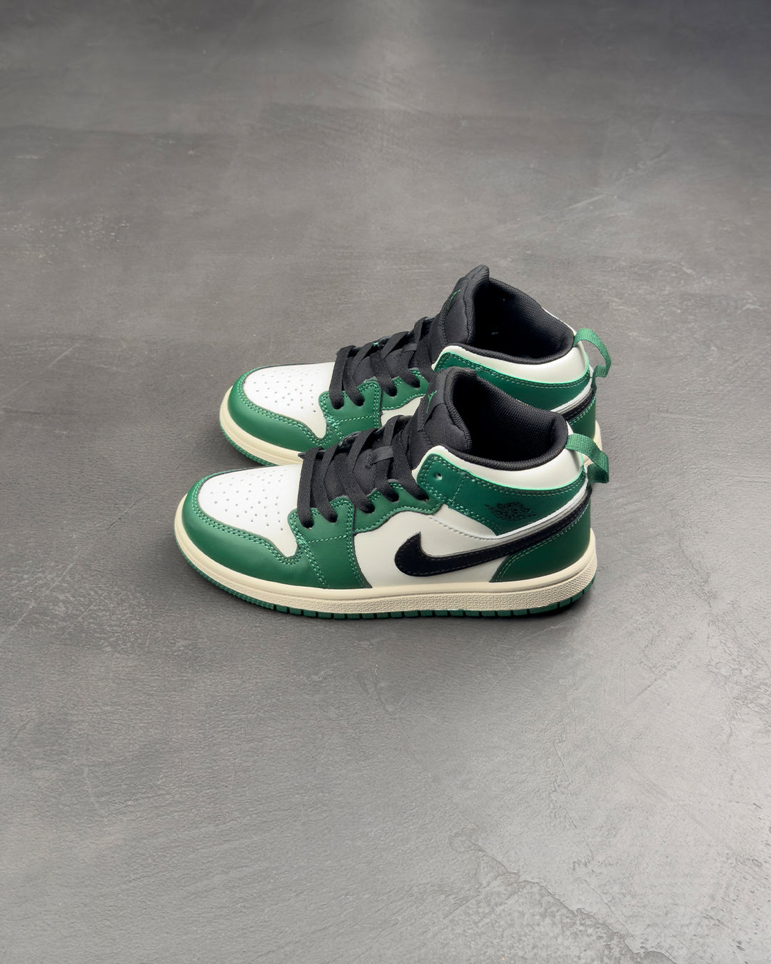 Air Jordan 1 Mid SE PS 'Pine Green' пропонує оновлений погляд на дебютні фірмові кросівки Майкла Джордана. Випущені в листопаді 2018 року в кольоровій гамі Pine Green, чорного та Sail, дитячі кросівки мають брендинг Jumpman на язичку, класичний логотип Wings на щиколотці та Nike Swoosh на чвертній панелі. Верх кросівок виконаний з повнозернистої шкіри та нубуку, має застібку на п'яті та перфоровану носкову частину. Завершує модель п'ятковий блок Air-Sole і гумова підошва.