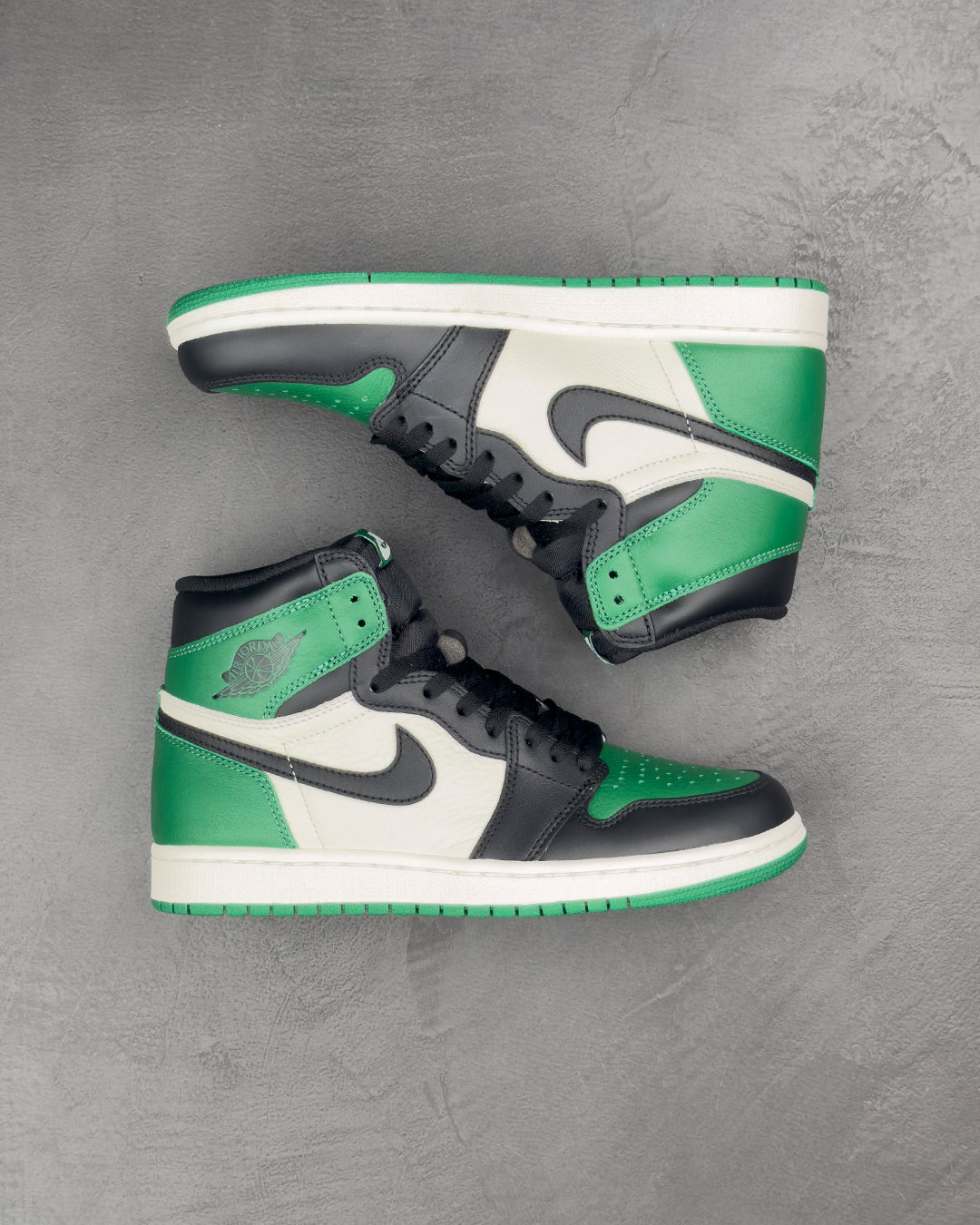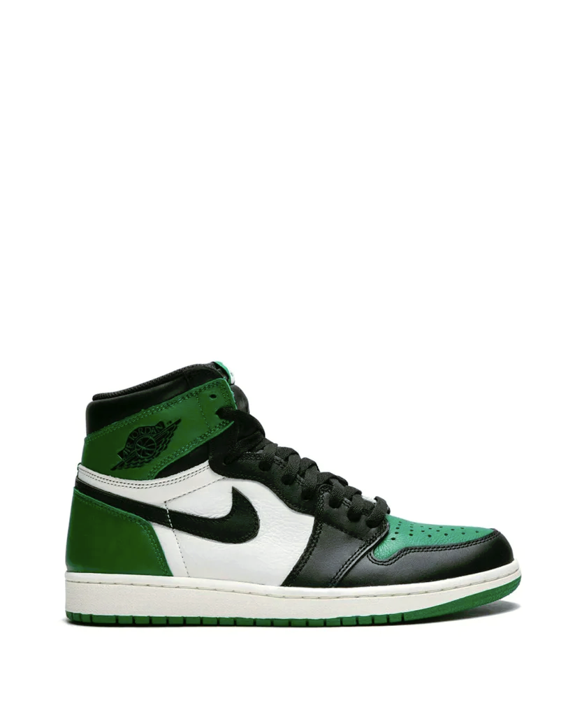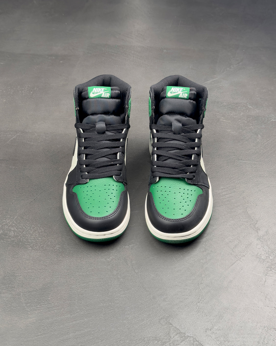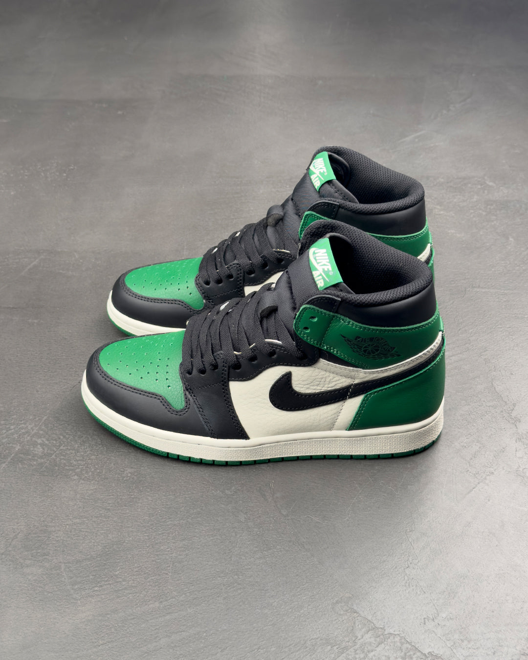 Модель Air Jordan 1 Retro High OG ‘Pine Green’ демонструє змінений підхід до класичного дизайну 'Black Toe', який був вперше представлений у 1985 році. Цей високий крій зі шкіри використовує чорно-білу колірну гаму з акцентами сосново-зеленого кольору на п'ятці, підошві та шкіряних крилах, що огортають комір. На відміну від оригінального дизайну 'Black Toe', традиційне біле покриття на передній частині носка замінено більш насиченим сосново-зеленим кольором.