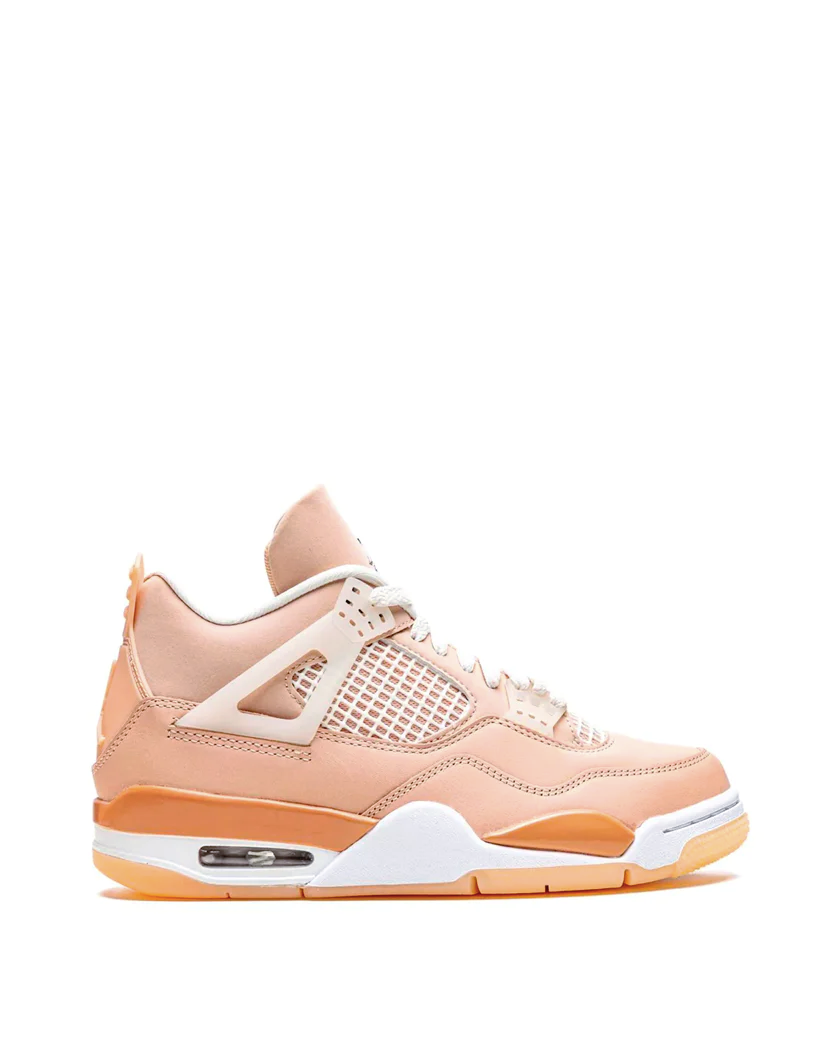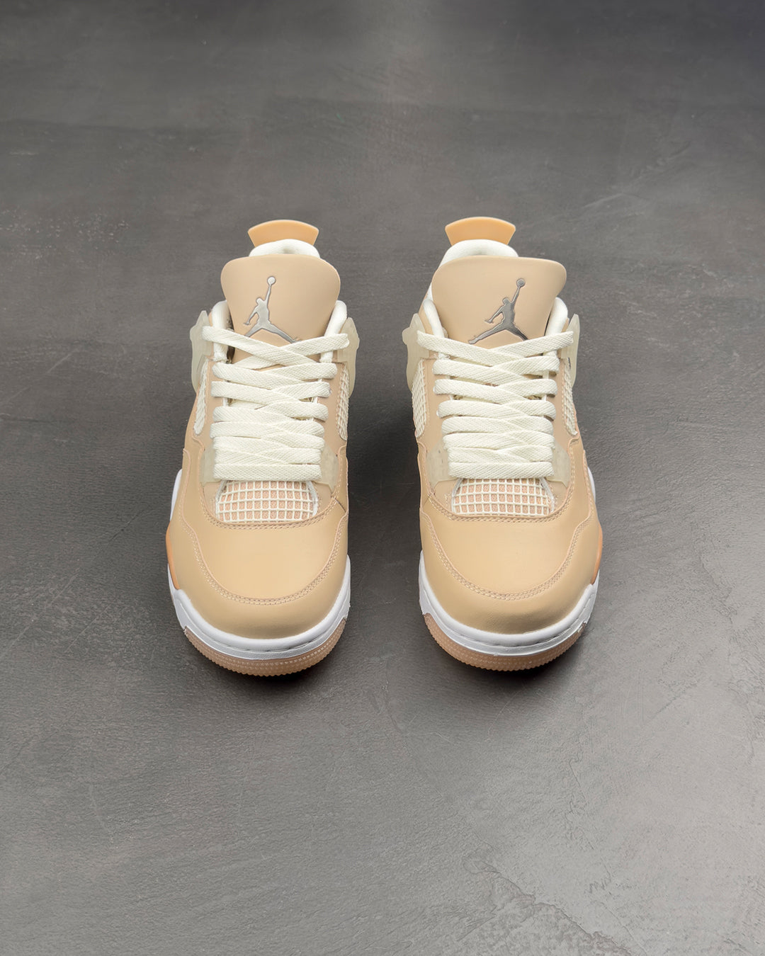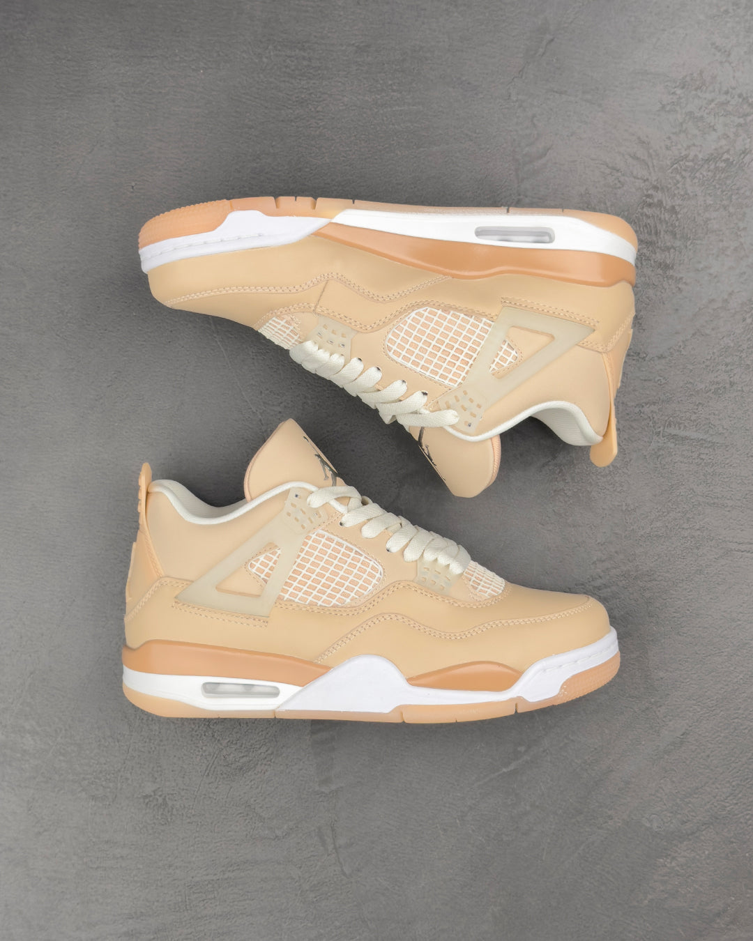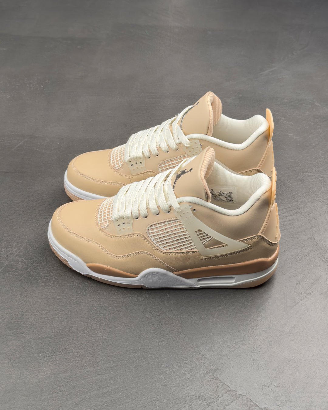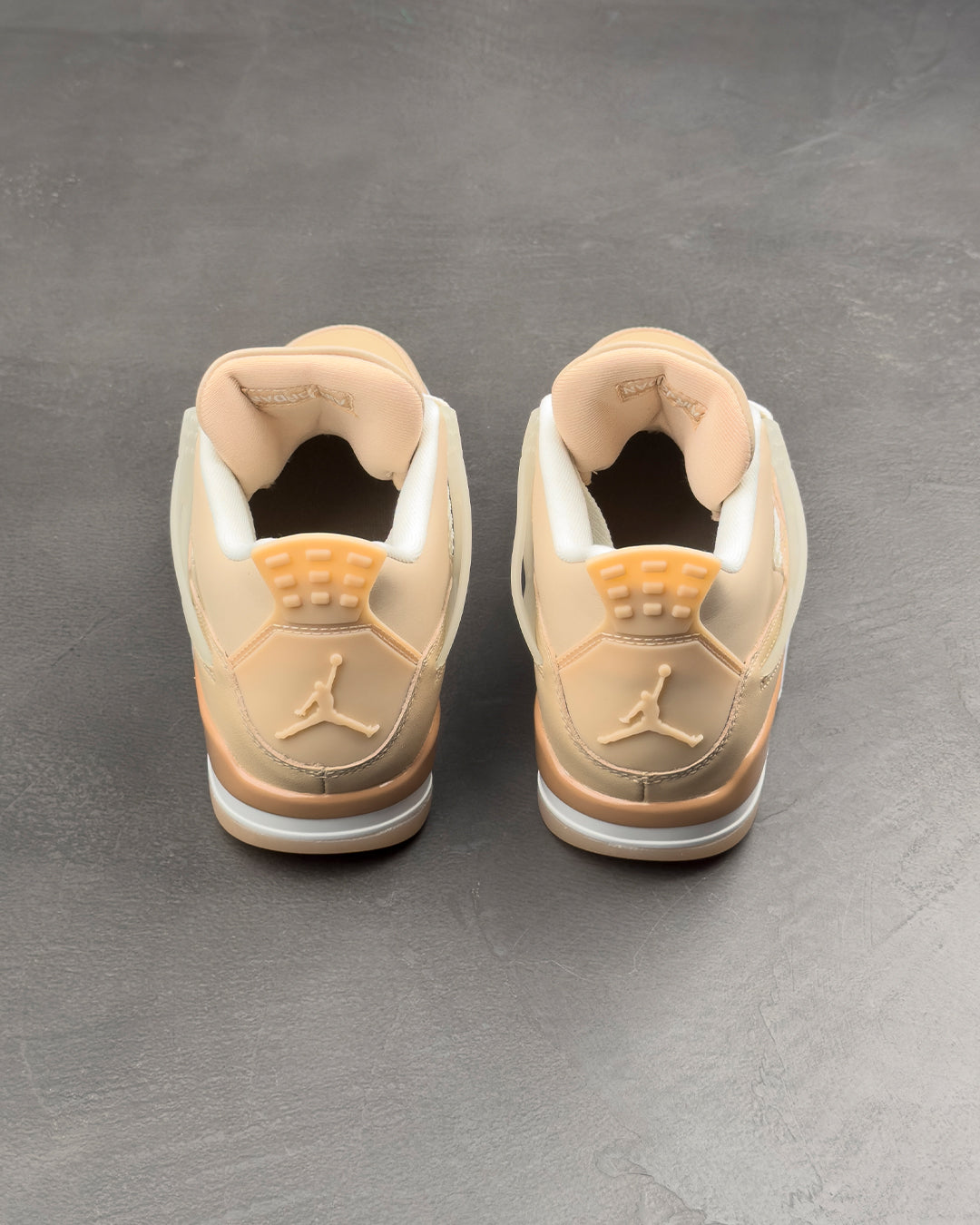 Жіночі кросівки Air Jordan 4 Retro 'Shimmer' пропонують стриманий погляд на класичний силует, назавжди пов'язаний з фільмом "Постріл". Шкіряний верх з однотонним відтінком засмаги покритий структурними крилами, литими люверсами та сіткою на чверть панелі для покращення повітропроникності. Нейтральну кольорову гаму оживляє сріблястий металевий логотип Jumpman на язичку. Легка амортизація забезпечується поліуретановою проміжною підошвою, оснащеною видимою повітряною підошвою в п'яті та підошвою з ялинковим протектором.
