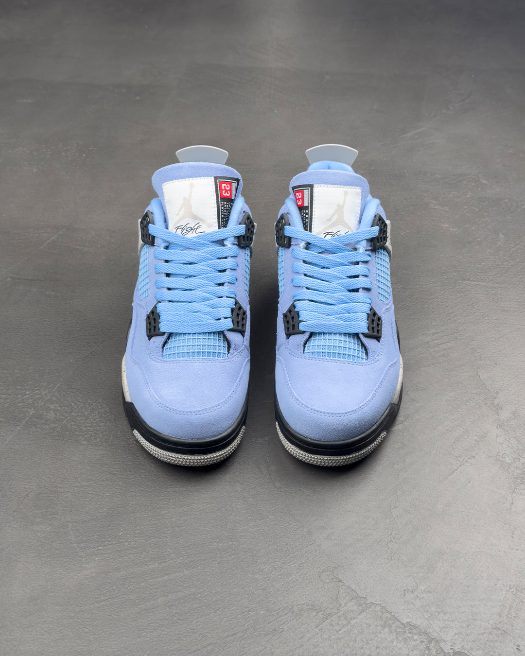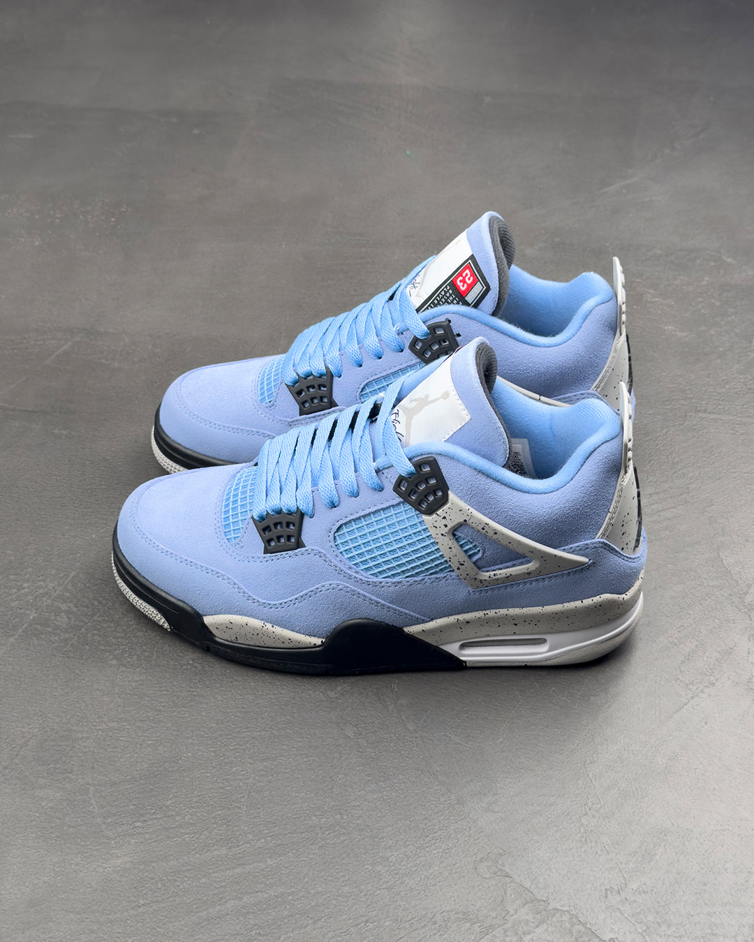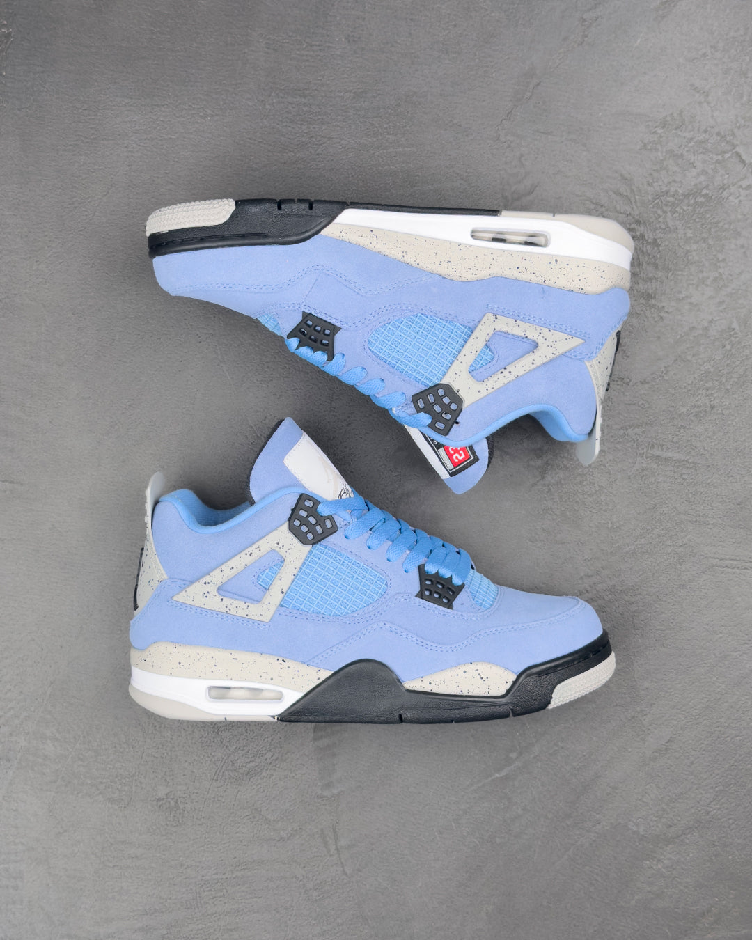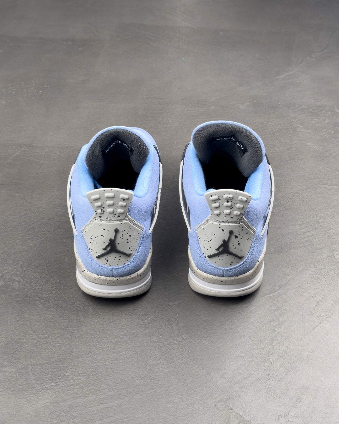 Air Jordan 4 Retro 'University Blue' оновлює класичний силует завдяки замшевому верху знайомого відтінку, натхненного альма-матер Майкла Джордана в Університеті Каліфорнії. Яскраво-синя палітра контрастує з сірим крапчастим покриттям на крилах і задній частині п'яти, де розміщено рельєфну іконку Jumpman чорного кольору. Вторинний брендинг Jumpman прикрашає плетений язичок, що імітує бірку спортсмена, яка зазвичай з'являється на нижньому подолі футболок Jordan.