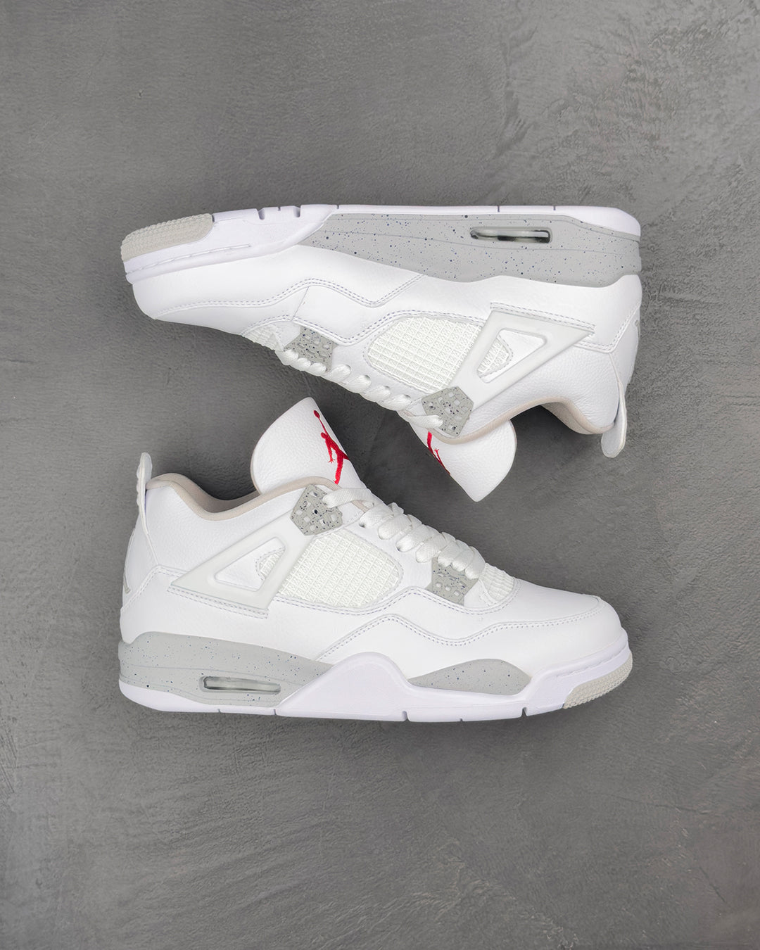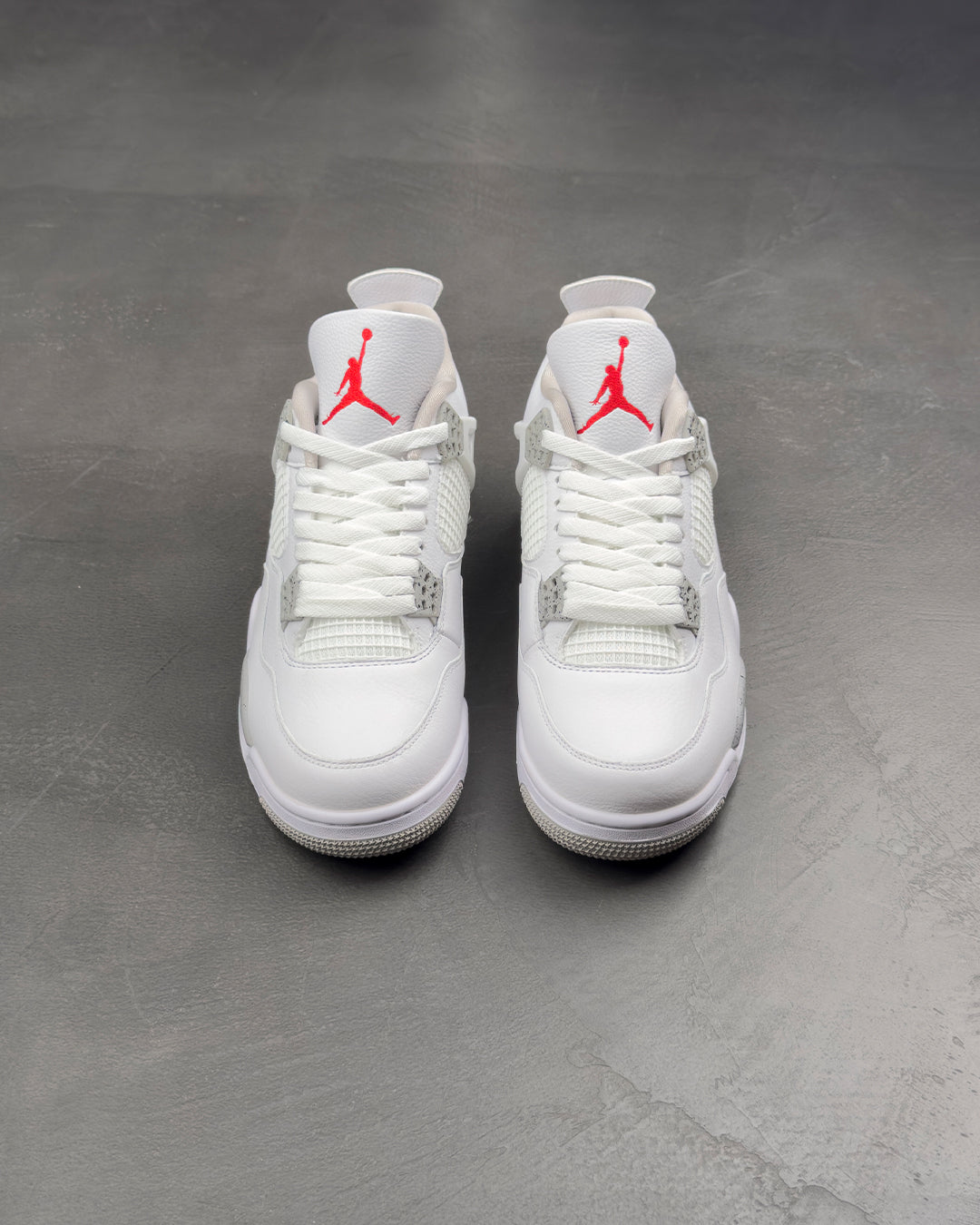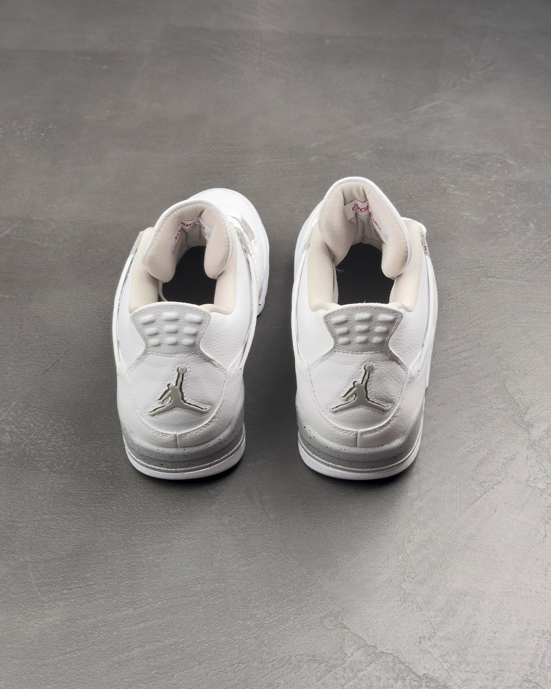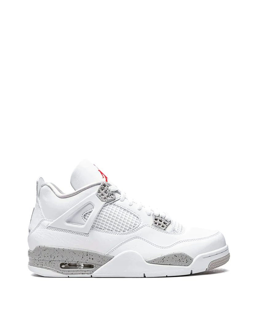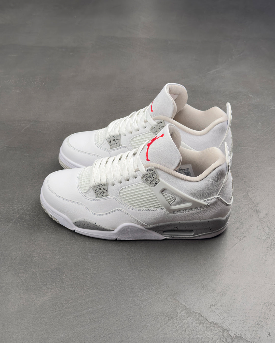 Air Jordan 4 Retro 'White Oreo' вирізняються дизайном, що нагадує оригінальну модель AJ4 'Oreo' 1999 року. Верх із чорної вибитої шкіри старої моделі замінено на чисто білу обробку, хоча формовані люверси в цяточку сірого кольору Tech Grey залишилися незмінними. Нейтральний відтінок повторюється на логотипі Jumpman на п'яті та поліуретановій підошві, з інкапсульованою повітряною амортизацією в передній частині стопи та видимим блоком під п'ятою. Другий Jumpman прикрашає язичок у контрастному вогняно-червоному кольорі.
