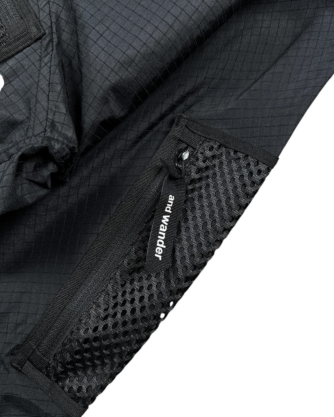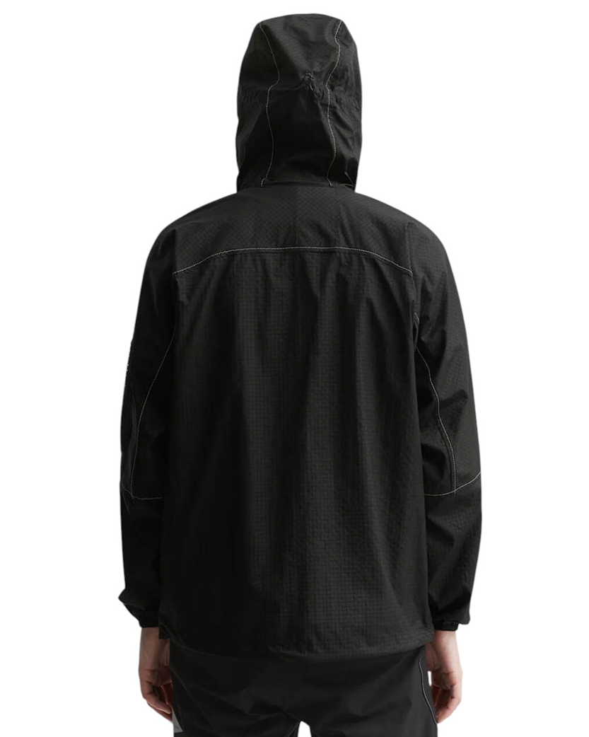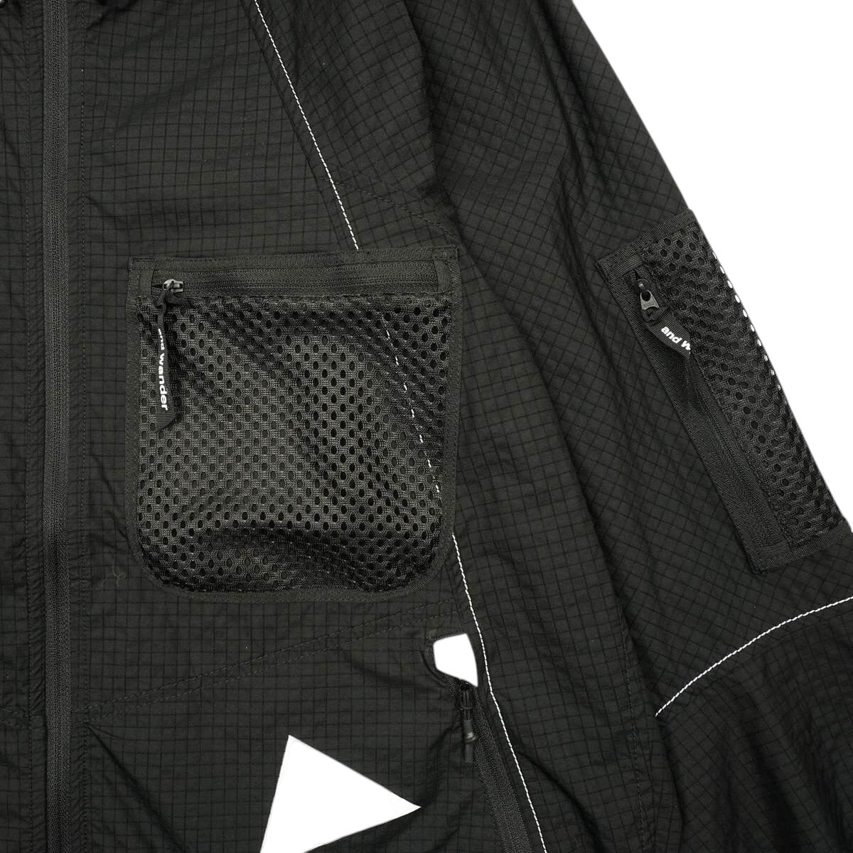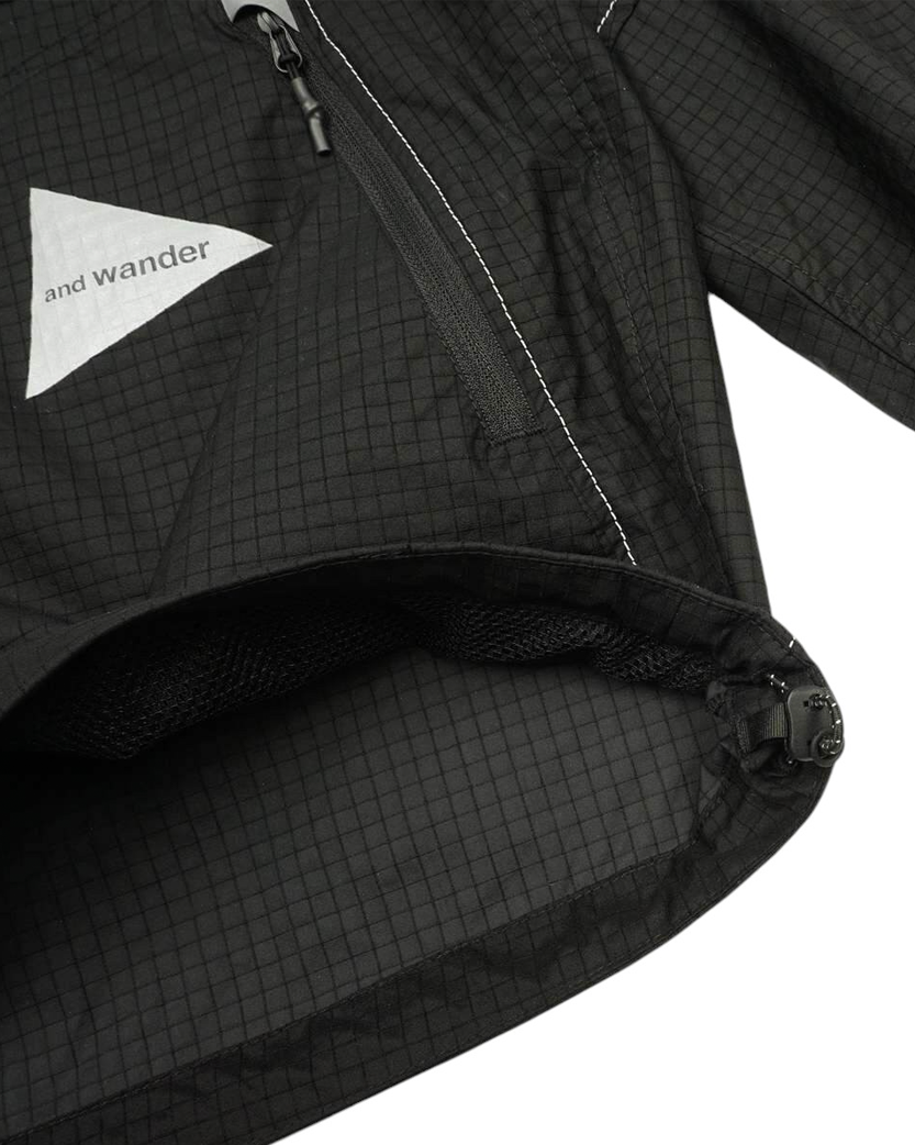 Комфортна та легка куртка з капюшоном від And Wander виготовлена з нейлонової тканини високої щільності з водовідштовхувальним покриттям. Куртка застібається на блискавку по всій довжині спереду, має еластичні манжети на застібках, а також шнурки на капюшоні та подолі, що дозволяють регулювати посадку. Дві бічні кишені на застібках-блискавках та сітчасті кишені на грудях і рукаві. Ця куртка доповнена світловідбиваючими строчками на капюшоні та подолі, а на лівій кишені надруковано світловідбиваючий логотип And Wander.