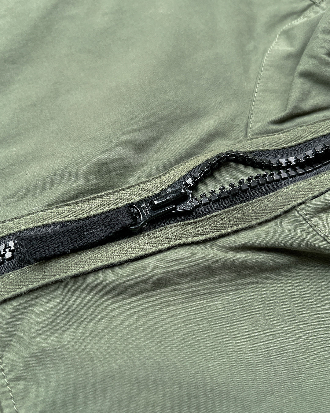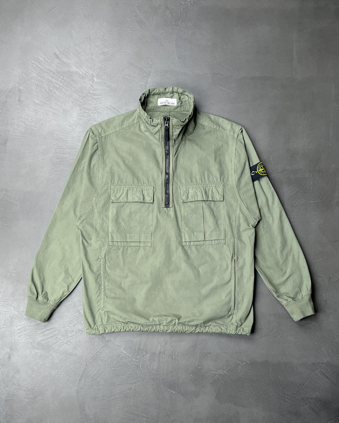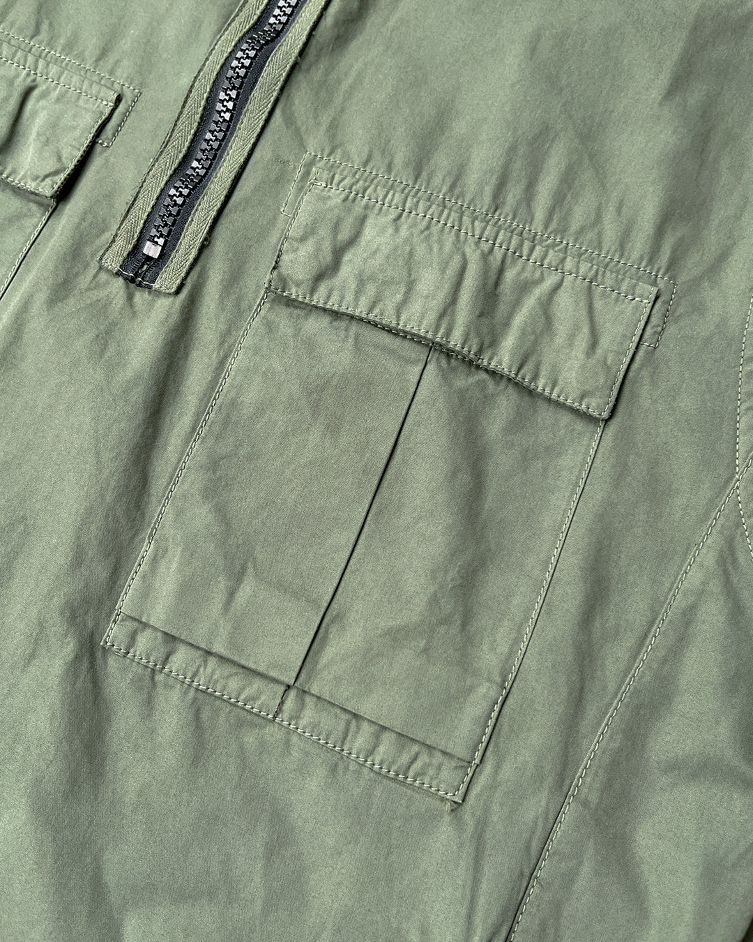 Анорак зі щільної бавовняної тканини зі спеціальною обробкою гармент дай та ефектом старіння "OLD", що створює легкий зношений та тривимірний ефект. Стоячий комір з затяжкою на верхньому краї, з напівзастібкою на блискавці та внутрішніми белізнами. Дві нагрудні кишені на белізнах зі складкою та прихованими застібками на кнопки. Кишені в бічних швах. Манжети з ребристої бавовни. Затяжка в нижньому краї.