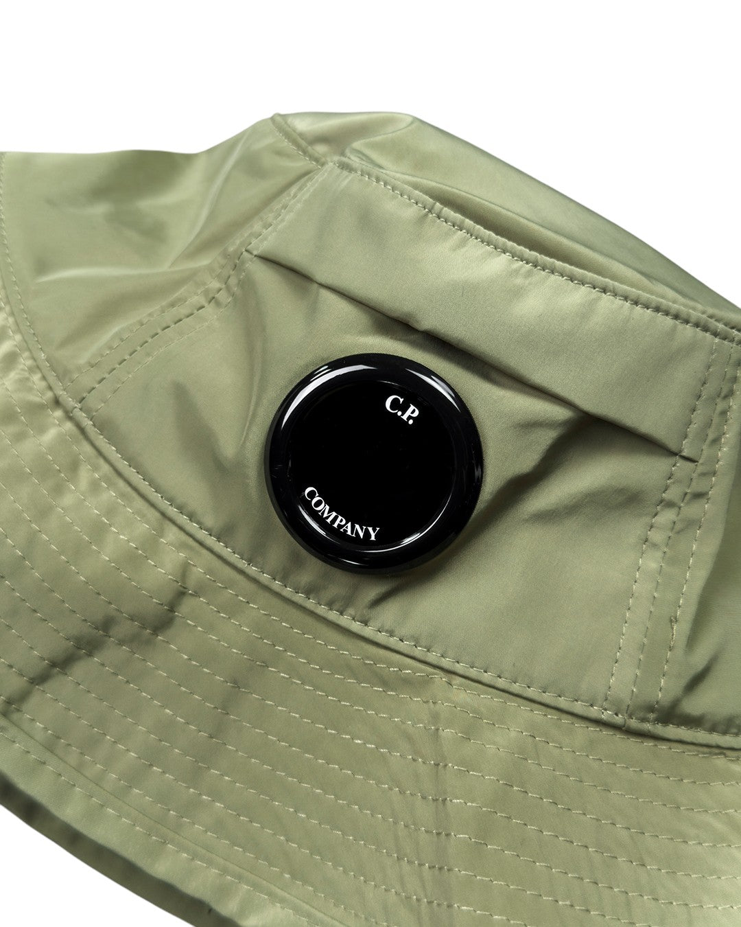 Панама від C.P. Company виготовлена з використанням Chrome-R - повністю переробленої версії тканого мультифіламентного нейлону, що захищає від води та вітру. Аксесуар має панельну конструкцію та прошиті краї, а спереду розташована фірмова деталь C.P. Company.