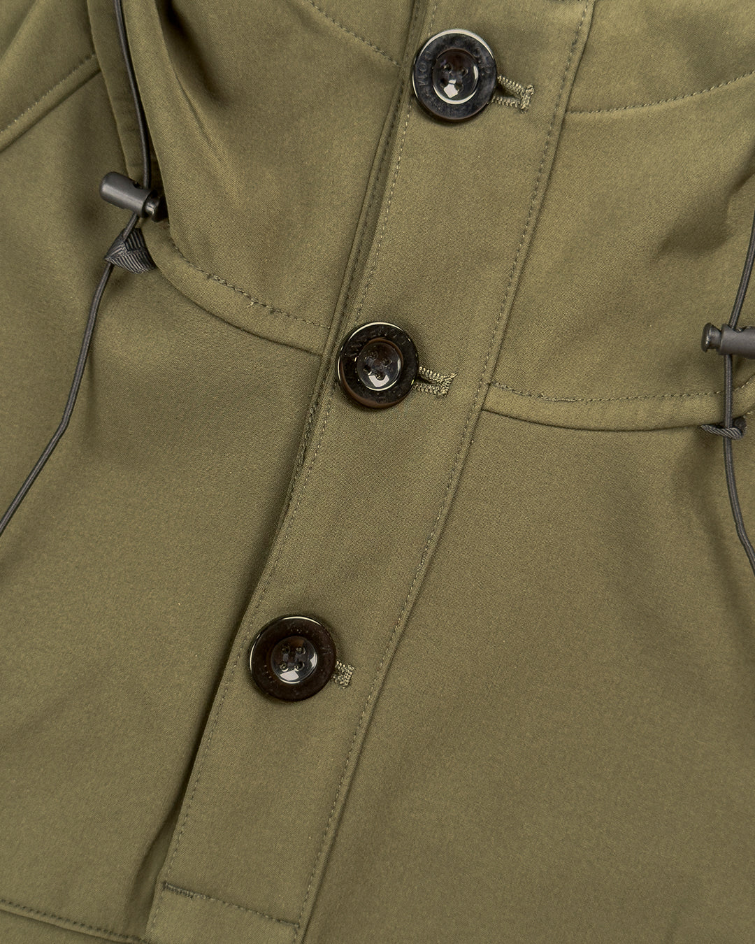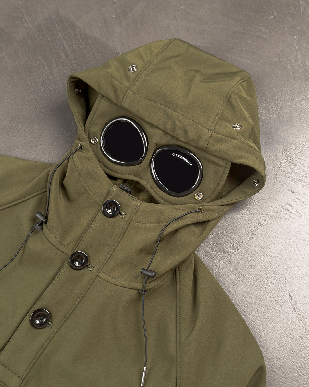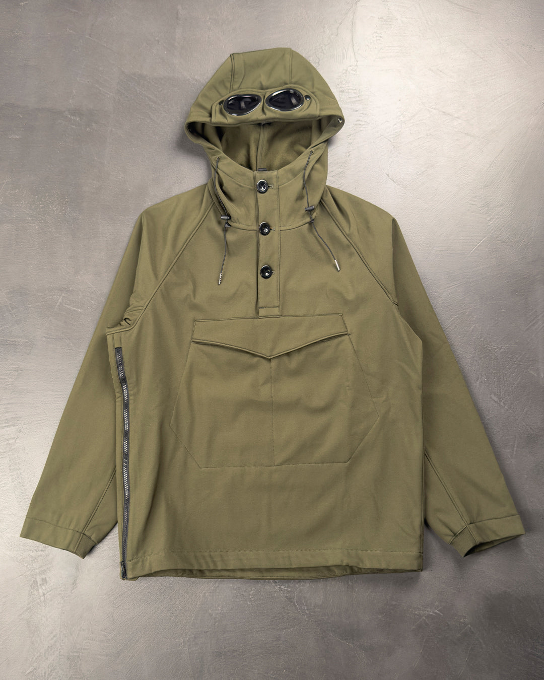 Анорак від C.P. Company виготовлений з суміші поліестеру та бавовни. На грудях є застібка на ґудзики чорного кольору. З боків розташовані розрізи, які застібаються на блискавки. Модель має передню кишеню з клапаном та капюшон з регульованими шнурками. Капюшон доповнений фірмовими лінзами, що надають виробу стильний вигляд.