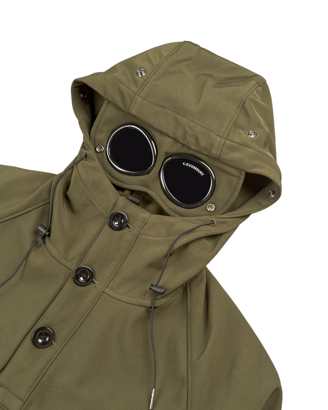 Анорак від C.P. Company виготовлений з суміші поліестеру та бавовни. На грудях є застібка на ґудзики чорного кольору. З боків розташовані розрізи, які застібаються на блискавки. Модель має передню кишеню з клапаном та капюшон з регульованими шнурками. Капюшон доповнений фірмовими лінзами, що надають виробу стильний вигляд.