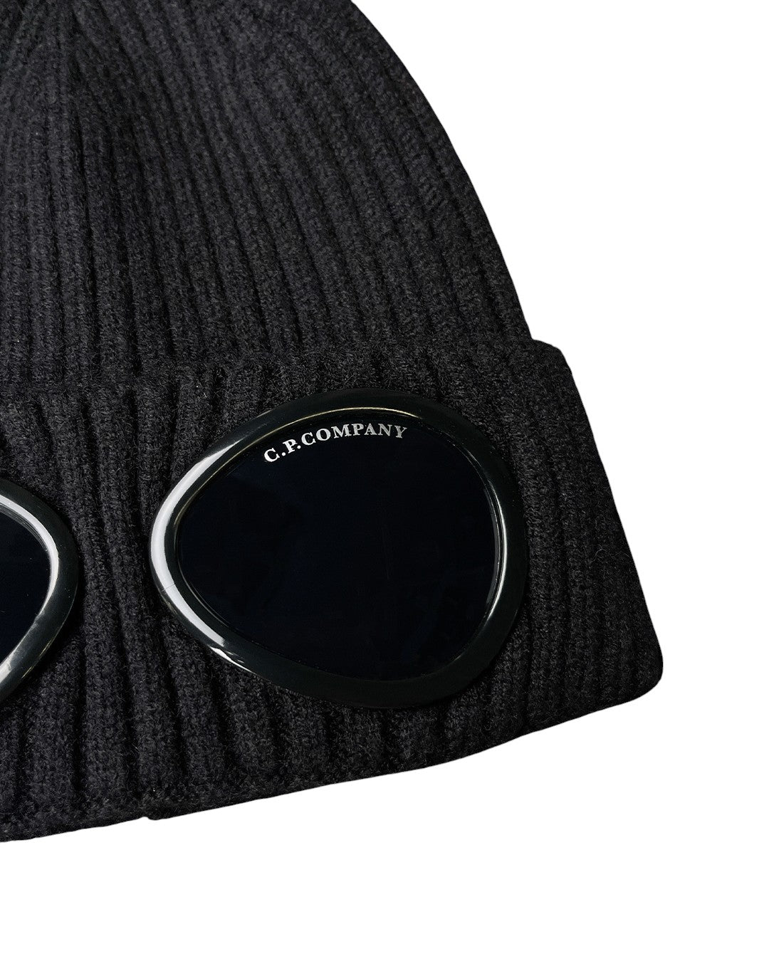 Шапка від C.P. Company з вовни мериноса в рубчик. Закруглені поля з фірмовими лінзами з ацетату в тон з білим логотипом.