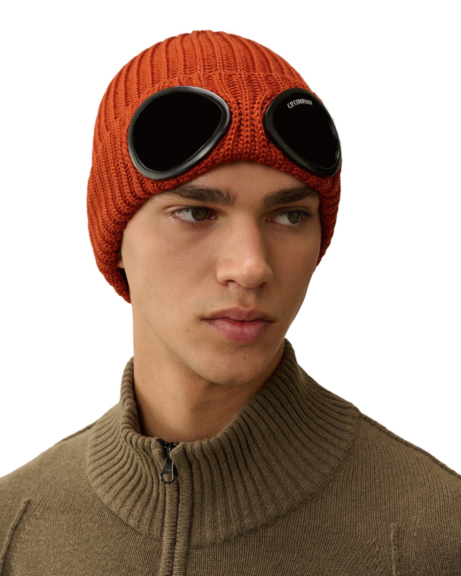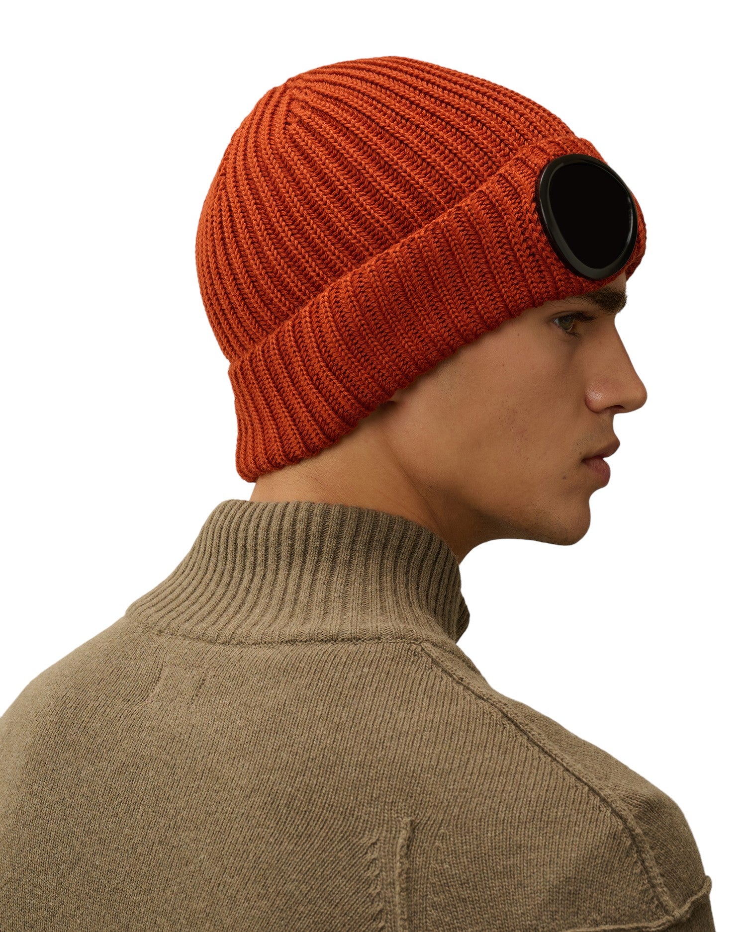 Шапка від C.P. Company з вовни мериноса в рубчик. Закруглені поля з фірмовими лінзами з ацетату в тон з білим логотипом.