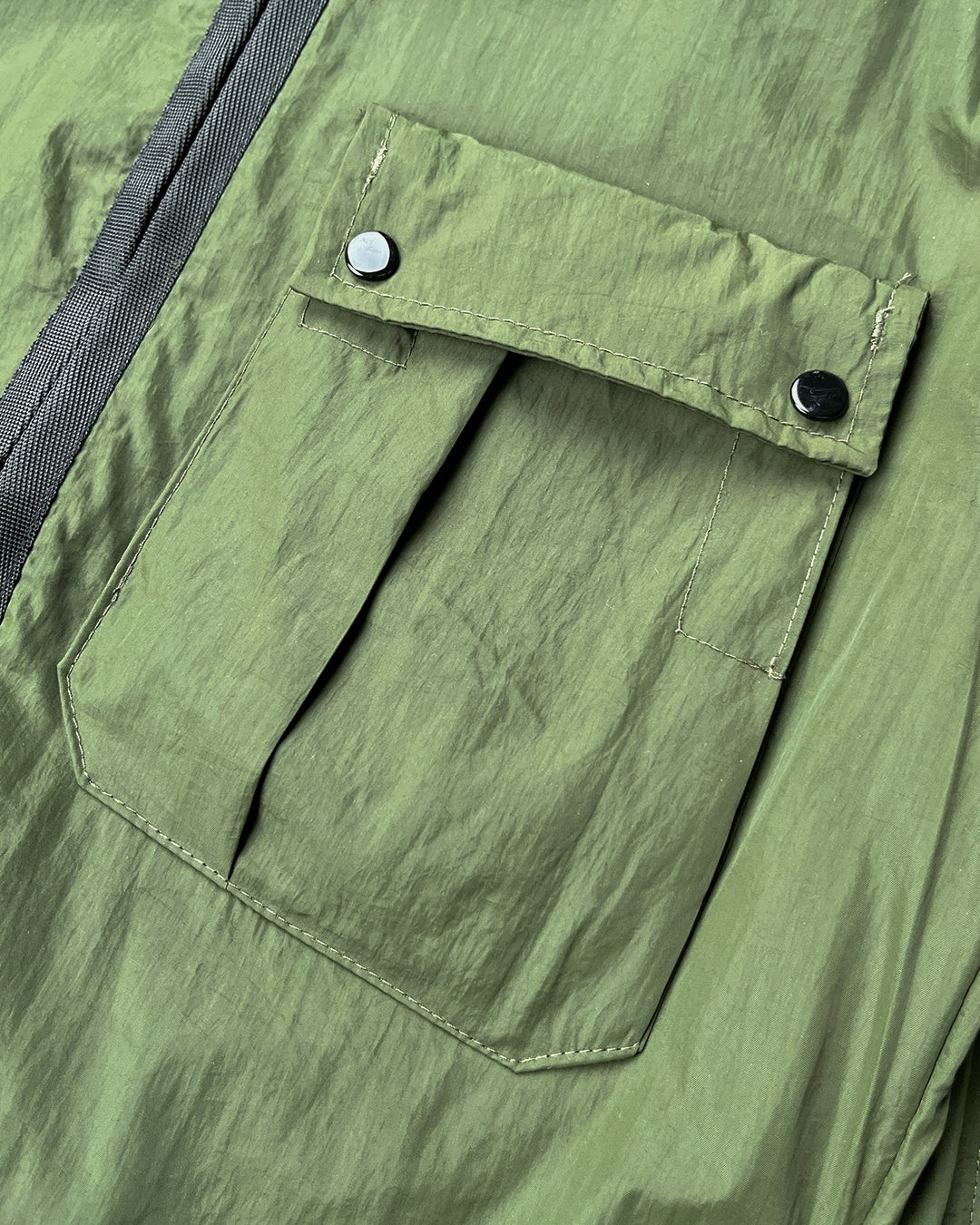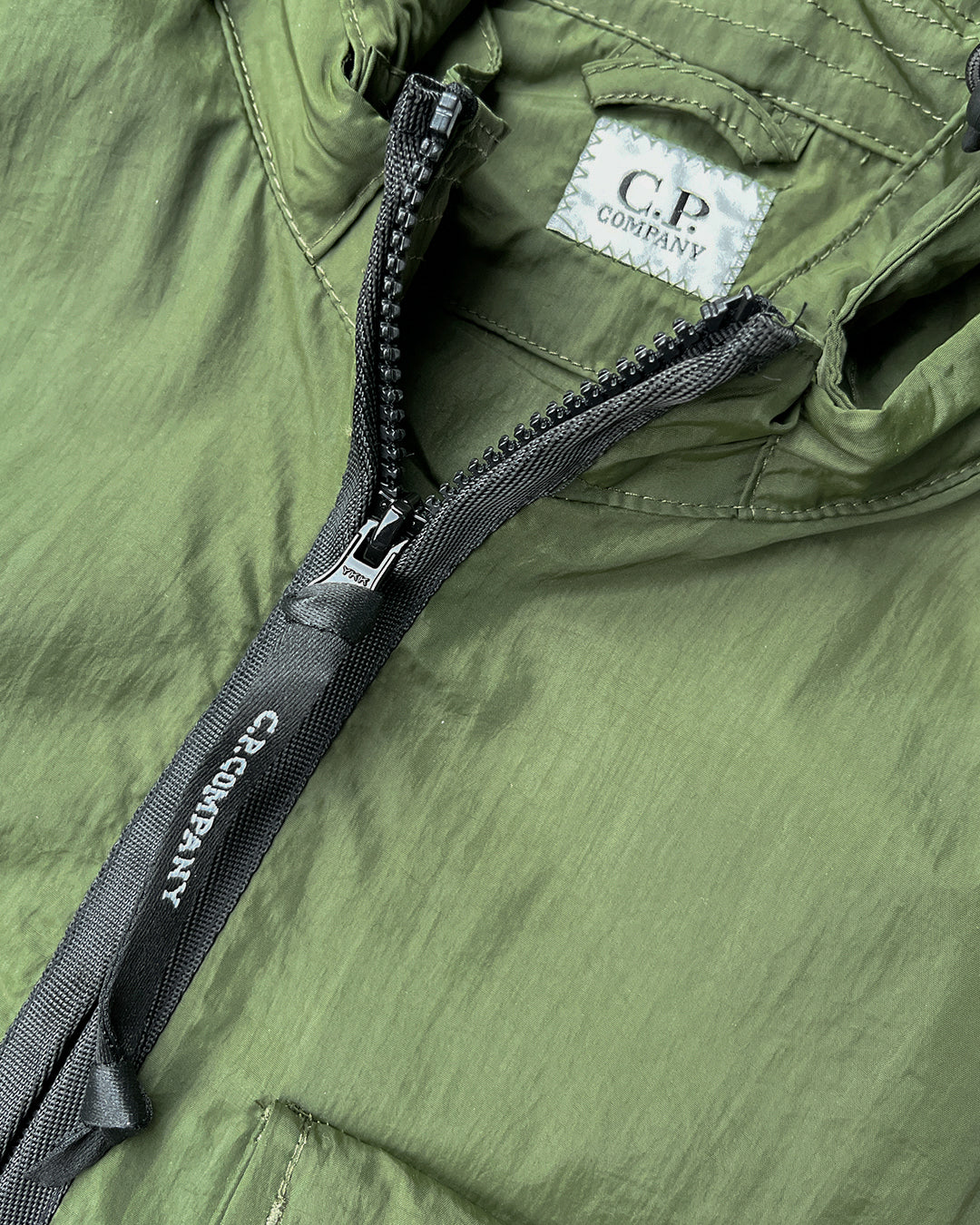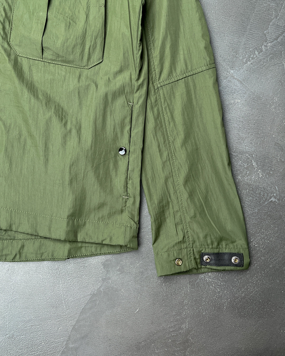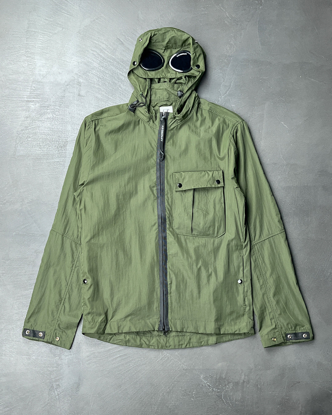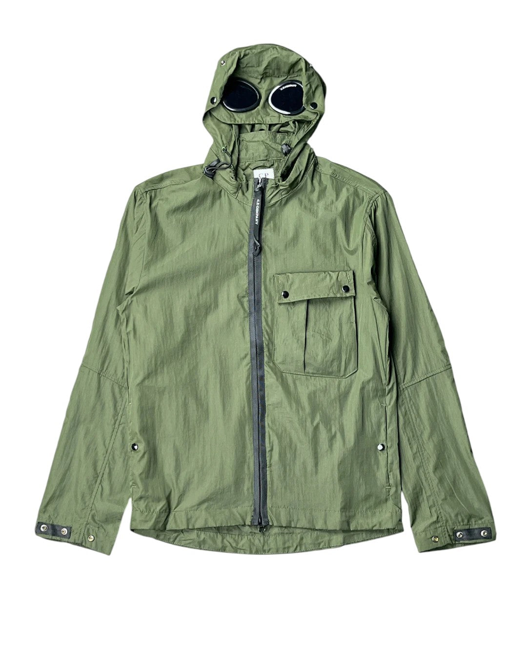 Легка спортивна куртка. Великий капюшон із фірмовими лінзами-окулярами C.P. Company. Центральна застібка-блискавка. На грудях розташувалася накладна кишеня з клапаном і ґудзиками. Тканина Chrome-R з перероблених матеріалів. Колір: зелений.