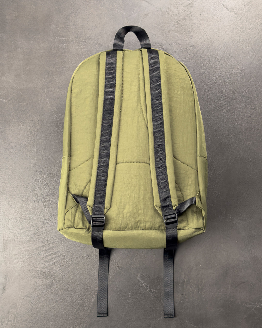 Практичний рюкзак із регульованими м'якими лямками. Для виготовлення моделі використали швидковисихаючу водонепроникну тканину з комбінованою матовою та металізованою текстурою, створену із застосуванням складової технології M.T.t.N. і Taylon P, що ґрунтується на поєднанні тасланізованих і одноволоконних нейлонових ниток. Виріб пофарбовано в готовому вигляді. Основне відділення на блискавці. Додаткові кишені із застібкою. Спереду вишитий логотип бренду.