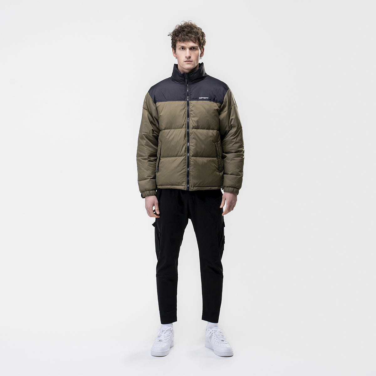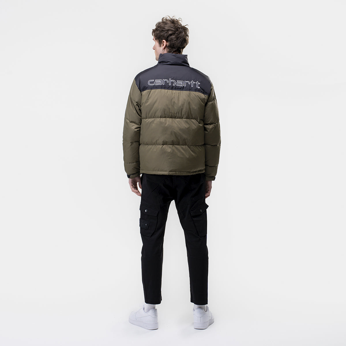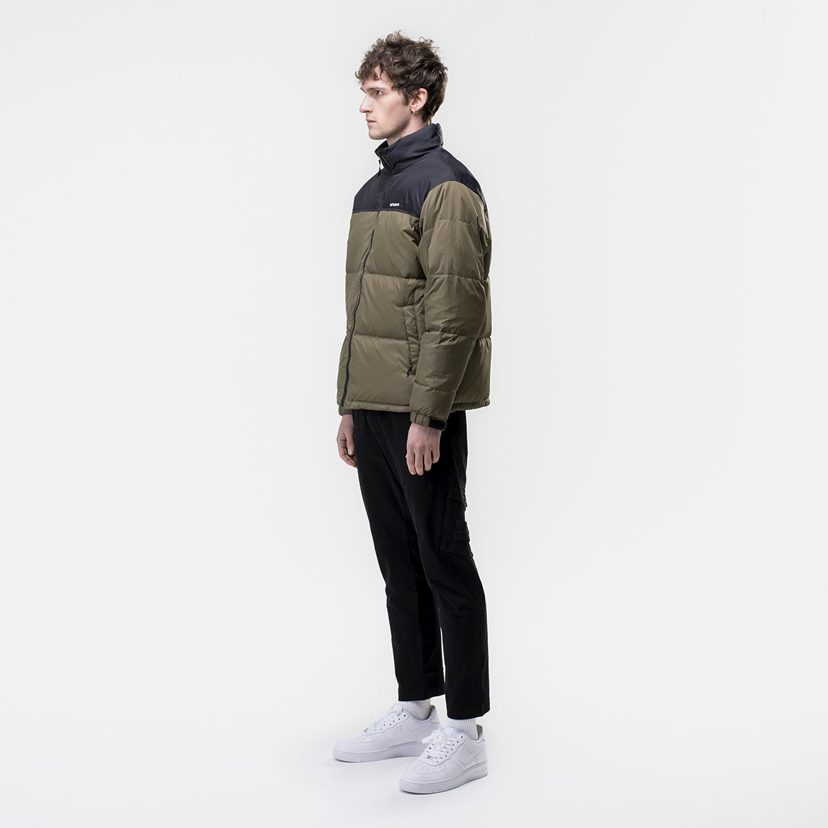 Куртка виготовлена з водовідштовхувальної поліестерової тафти, наповнена пухом для забезпечення тепла і має підкладку з нейлонової тафти. М'який комір-стійка збереже вашу шию в теплі, а нижній край можна регулювати. Зручні дві кишені для рук на кнопках. Завершується ця куртка білим логотипом у вигляді напису на грудях та спині.