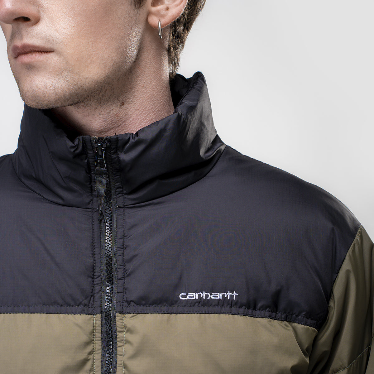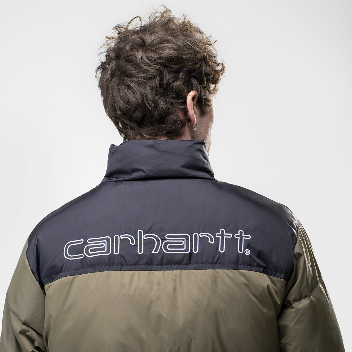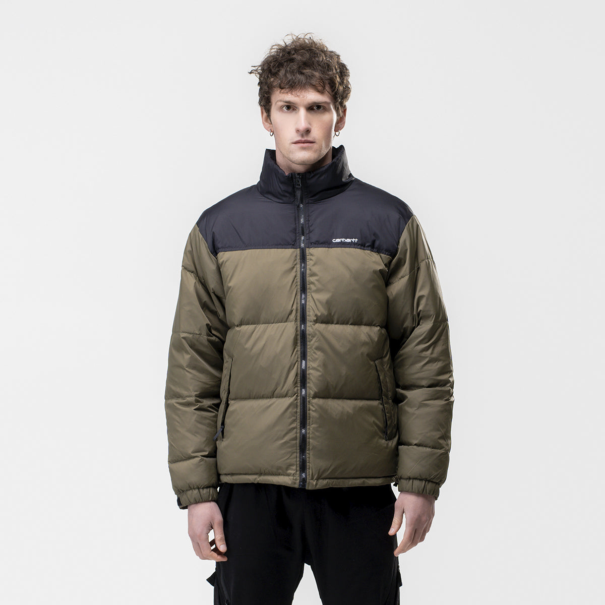 Куртка виготовлена з водовідштовхувальної поліестерової тафти, наповнена пухом для забезпечення тепла і має підкладку з нейлонової тафти. М'який комір-стійка збереже вашу шию в теплі, а нижній край можна регулювати. Зручні дві кишені для рук на кнопках. Завершується ця куртка білим логотипом у вигляді напису на грудях та спині.