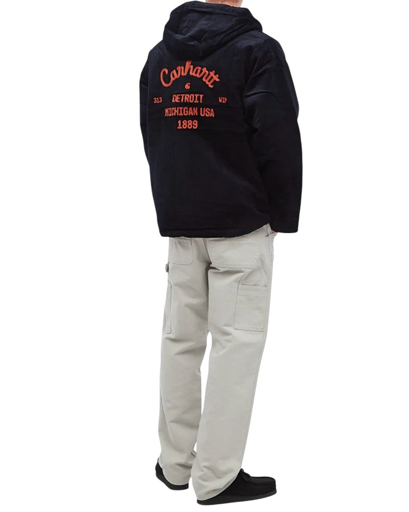 Чоловіча вельветова куртка з капюшоном від бренду Carhartt WIP. Модель виконана в темно-синьому забарвленні з контрастною вишивкою брендингу на спині та грудях. Підкладка зі стьобаного матеріалу з наповнювачем із поліестеру доповнена еластичними вставками на манжетах рукавів, що забезпечить захист від вітру.