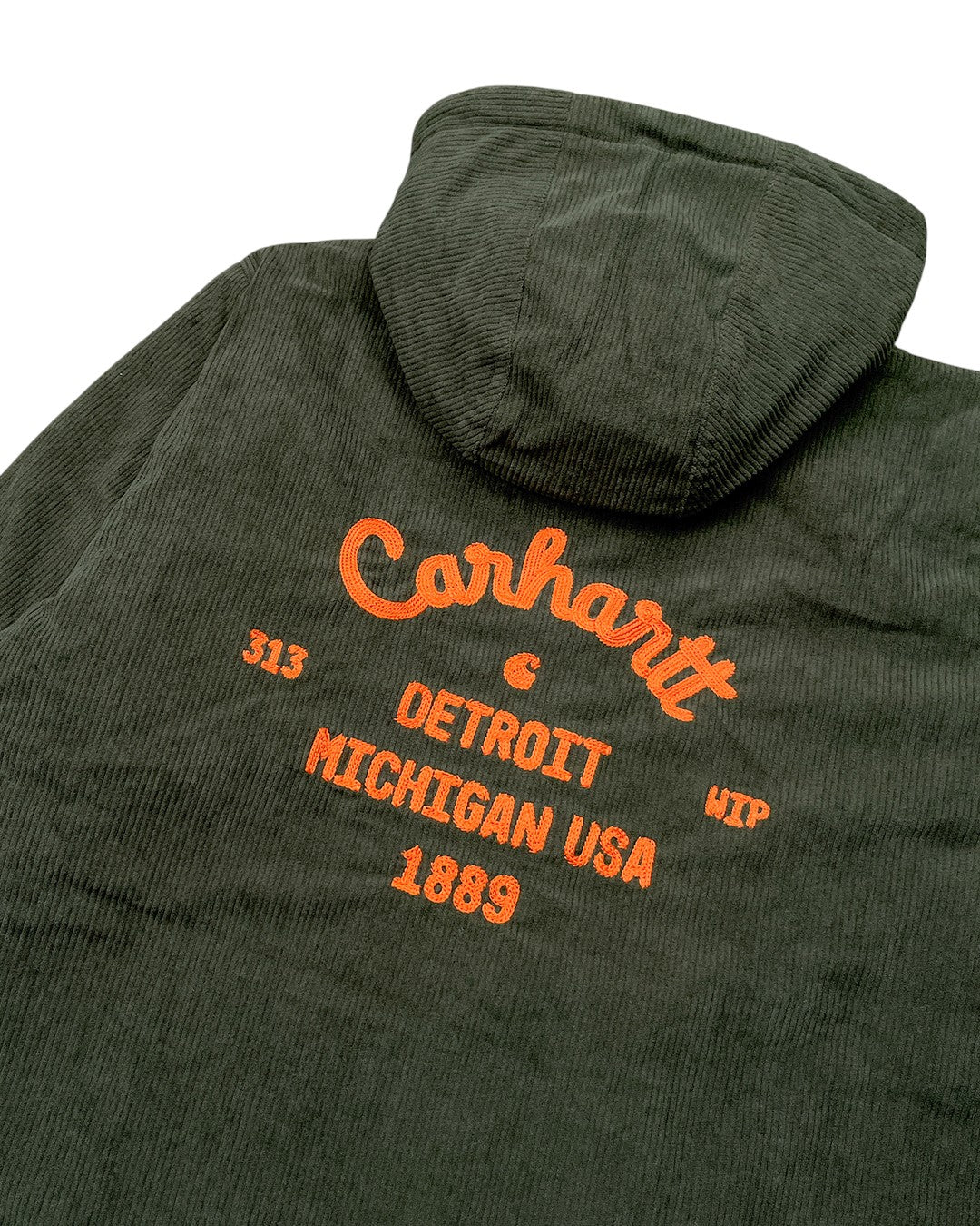 Чоловіча вельветова куртка з капюшоном від бренду Carhartt WIP. Модель виконана в оливковому забарвленні з контрастною вишивкою брендингу на спині та грудях. Підкладка зі стьобаного матеріалу з наповнювачем із поліестеру доповнена еластичними вставками на манжетах рукавів, що забезпечить захист від вітру.