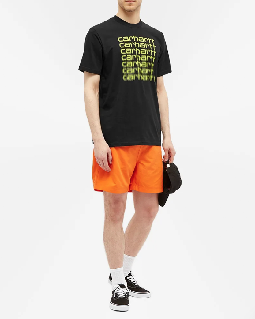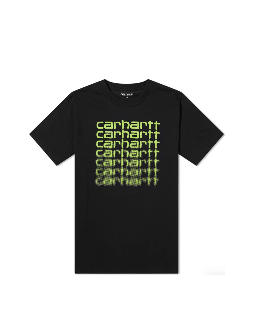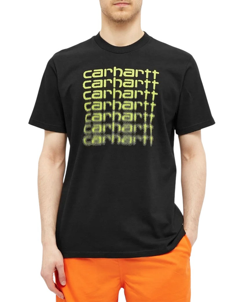 Ця футболка Carhartt WIP, прикрашена блискучим лаймово-зеленим логотипом на грудях, привносить графічну нотку в будь-який невимушений образ. Модель виконана з бавовняного трикотажу чорного кольору і доповнена зручним коміром у гумку.