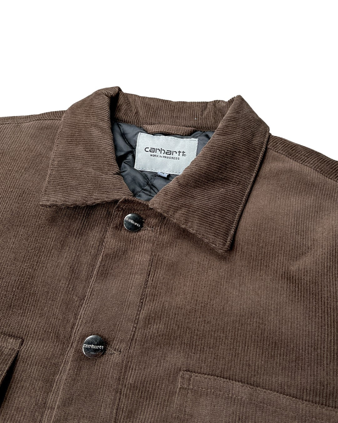 Це новий погляд на класичне пальто Carhartt WIP Michigan. Ця модель виготовлена з бавовняного вельвету "Ковентрі" вагою 9,7 унцій з 100% бавовни. Вона має ромбовидну стьобану підкладку з бавовняного попліну, потрійну строчку, накладні кишені спереду, регульовані манжети, кнопки Carhartt та квадратну етикетку Carhartt.