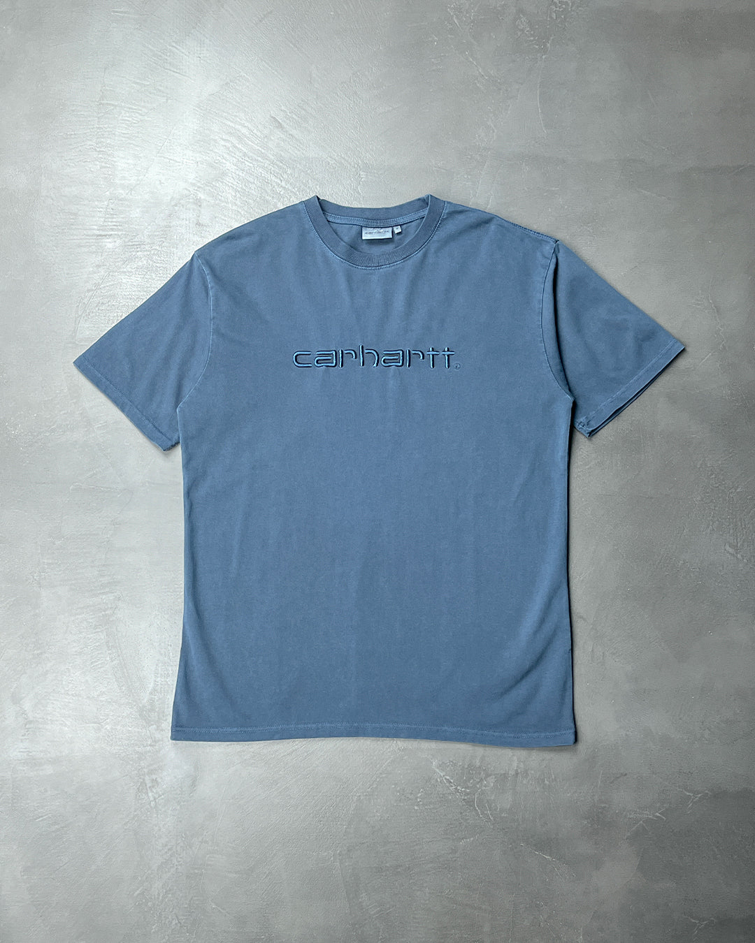 Футболка від бренду Carhartt WIP Script синього кольору, має звичайний крій, виріз горловини, короткий рукав. На грудях логотип Carhartt WIP.