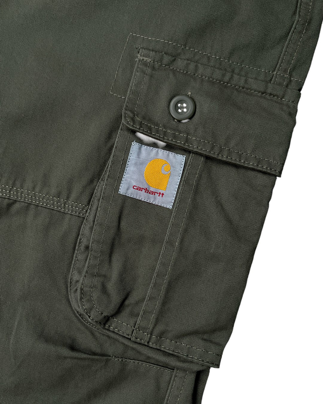 Штани-карго від Carhartt WIP застібаються на ґудзик та блискавку. Мають дві бічні та дві накладні кишені спереду, на одній з яких нашитий логотип бренду та дві накладні кишені ззаду.
