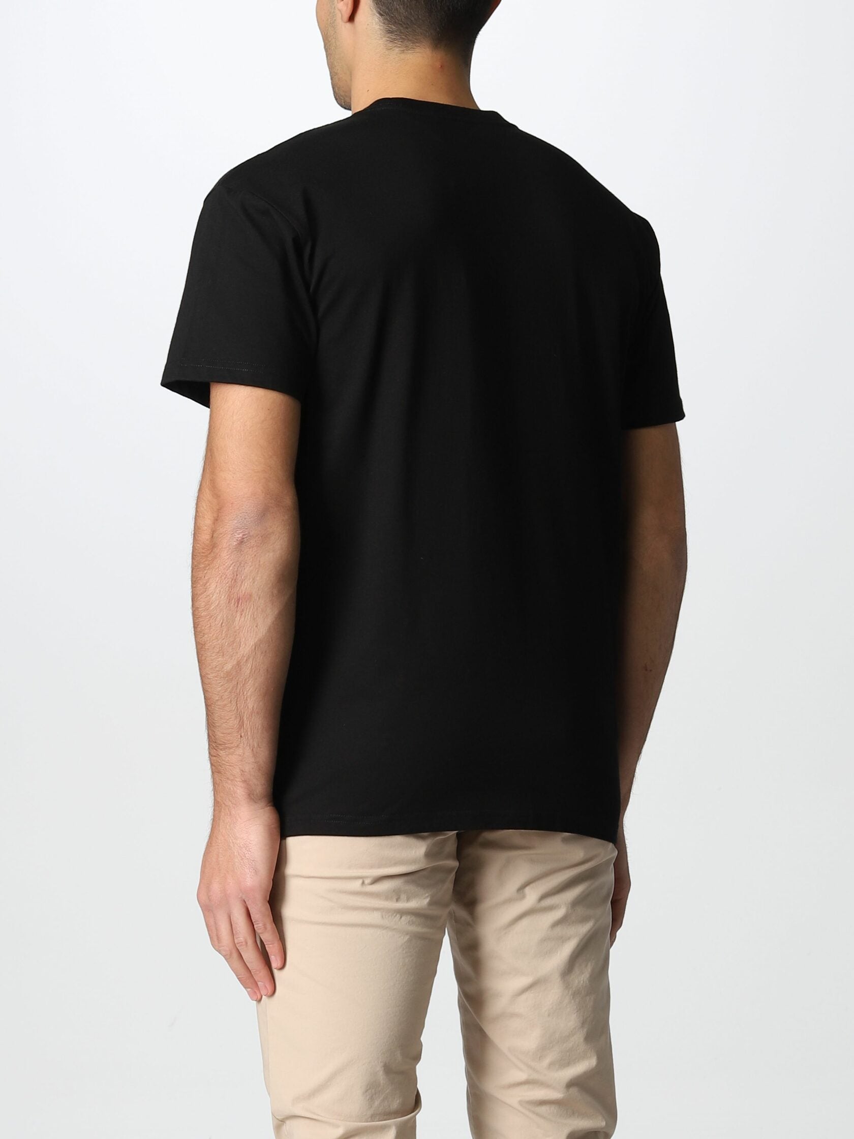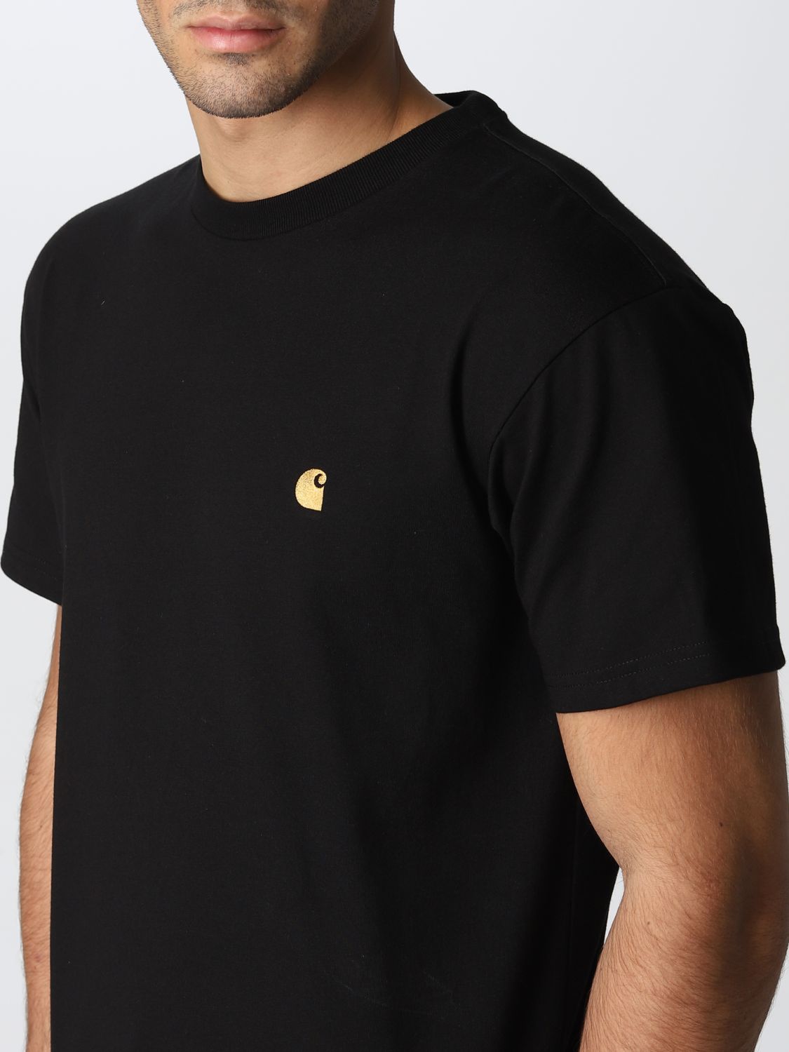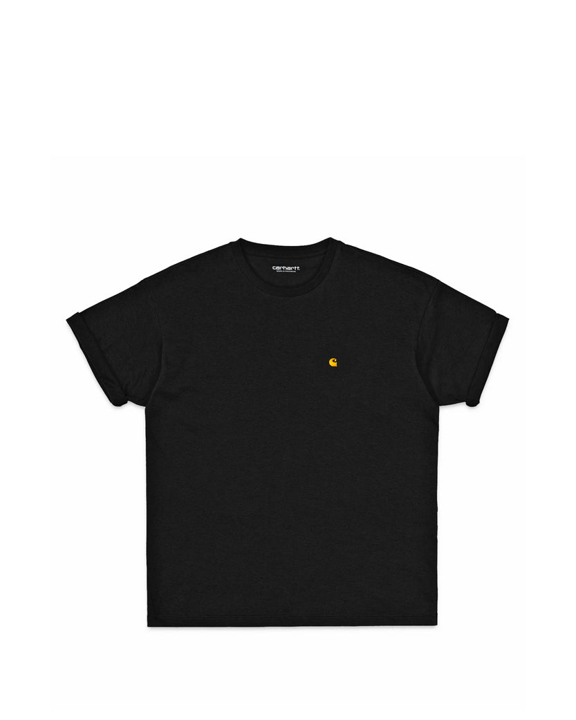 Чорна футболка прикрашена золотою вишивкою логотипу на грудях. Класичний силует і круглий виріз.