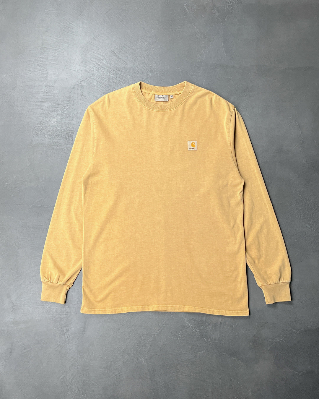 Відповідно до фірмового стилю незавершеного виробництва Carhartt WIP і новаторської промислової спадщини, цей коричневий лонгслів Vista демонструє потертий і поношений вигляд. Він скроєний з якісного бавовняного джерсі, а на грудях його підкреслює легендарна золота нашивка з літерою "С".