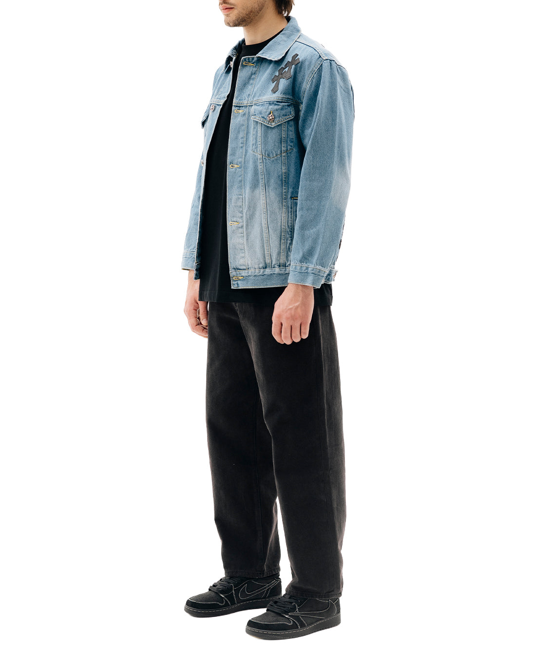 Джинсова куртка від Chrome Hearts має класичний комір, застібку на ґудзики та дві нагрудні кишені для зручності. Особливістю цієї куртки є фірмові шкіряні нашивки, які додають їй унікальності та ексклюзивного вигляду.