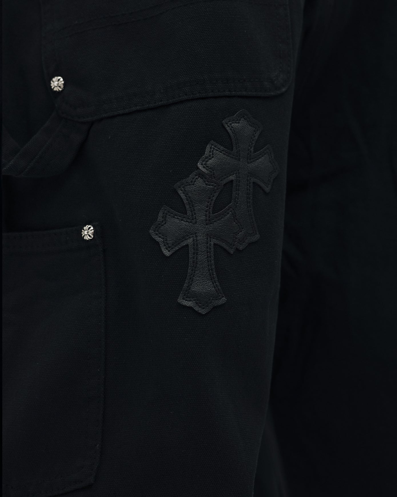 Chrome Hearts Double Knee Jeans Black — це преміальні чорні джинси зі щільного деніму, виконані у прямому крої з характерним грубим акцентом. Модель вирізняється посиленою конструкцією з додатковими панелями в зоні колін — елемент, натхненний робочим одягом, який додає виробу брутальності та зносостійкості. Джинси доповнені класичною п’ятикишеньковою конструкцією, фірмовими шкіряними хрестами, срібною фурнітурою та деталями з гравіюванням Chrome Hearts. Стильна, зухвала річ із впізнаваним почерком бренду, яка поєднує streetwear і функціональність.